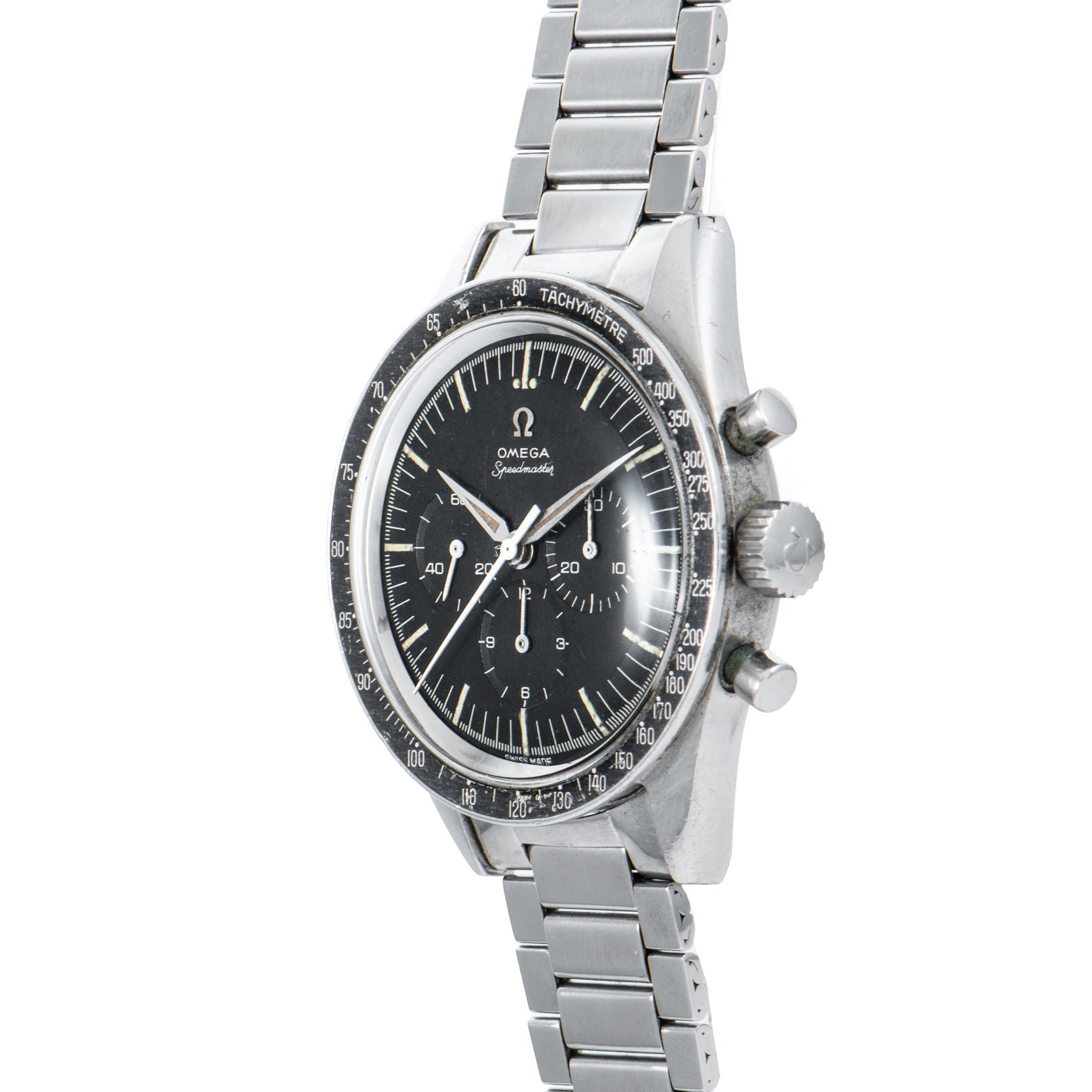 This particular example, a Reference 2998-4, dates to circa 1961 and features a gorgeous, evenly patinated matte black dial with an early alpha handset, Omega's Calibre 321 hand-cranking movement - widely considered to be one of the most significant movements ever made and is nothing short of legendary - and a correct matching flat-link bracelet with a blade clasp.