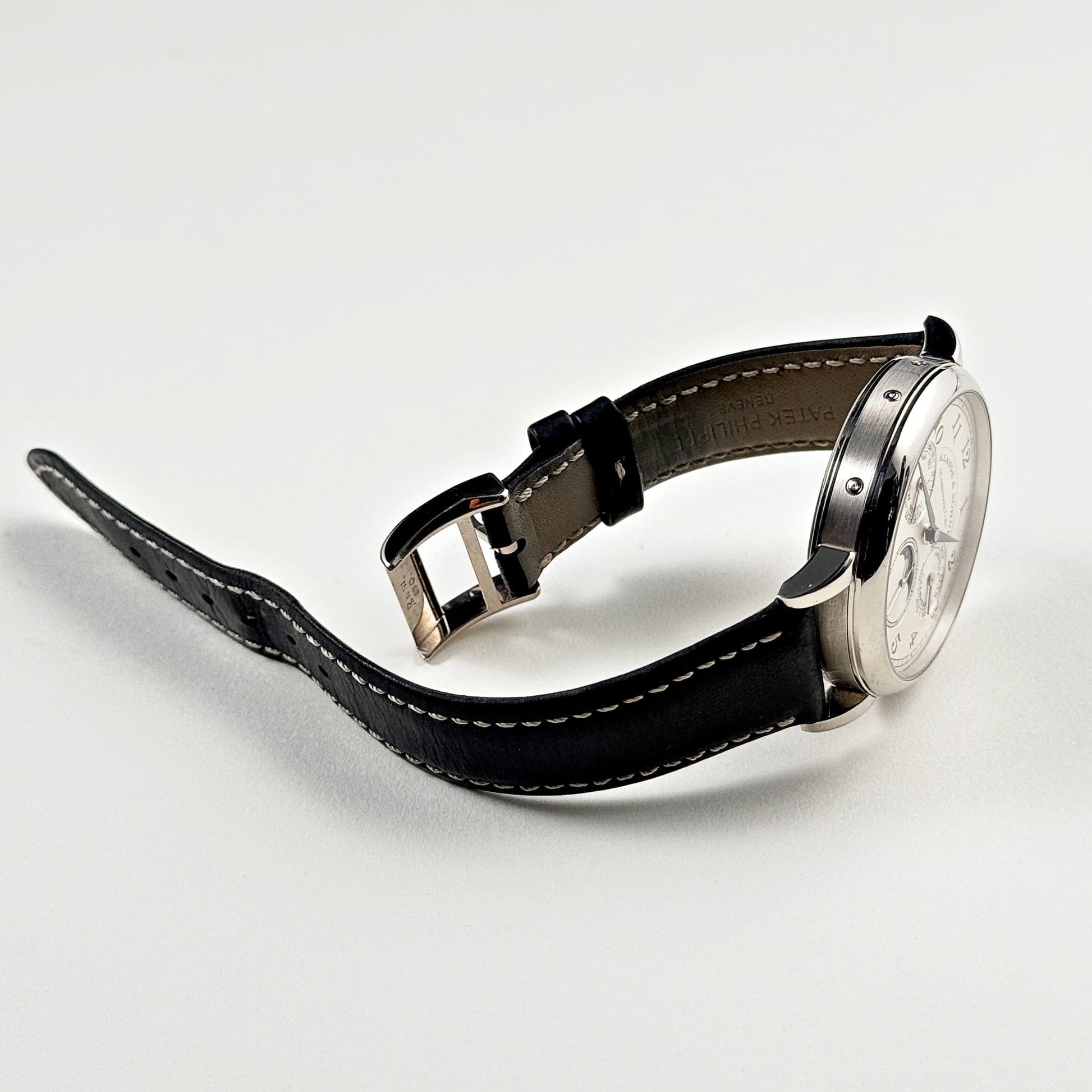 The A. Lange & Söhne 1815 Annual Calendar 238.026E exemplifies traditional watchmaking craftsmanship with refined complications and classic design. Housed in an 18k white gold case, this timepiece features a 40mm diameter, striking a balance between modern proportions and timeless elegance. The silver dial, with its fine-grained finish, serves as a sophisticated backdrop for the meticulously arranged annual calendar and moon phase indicators.