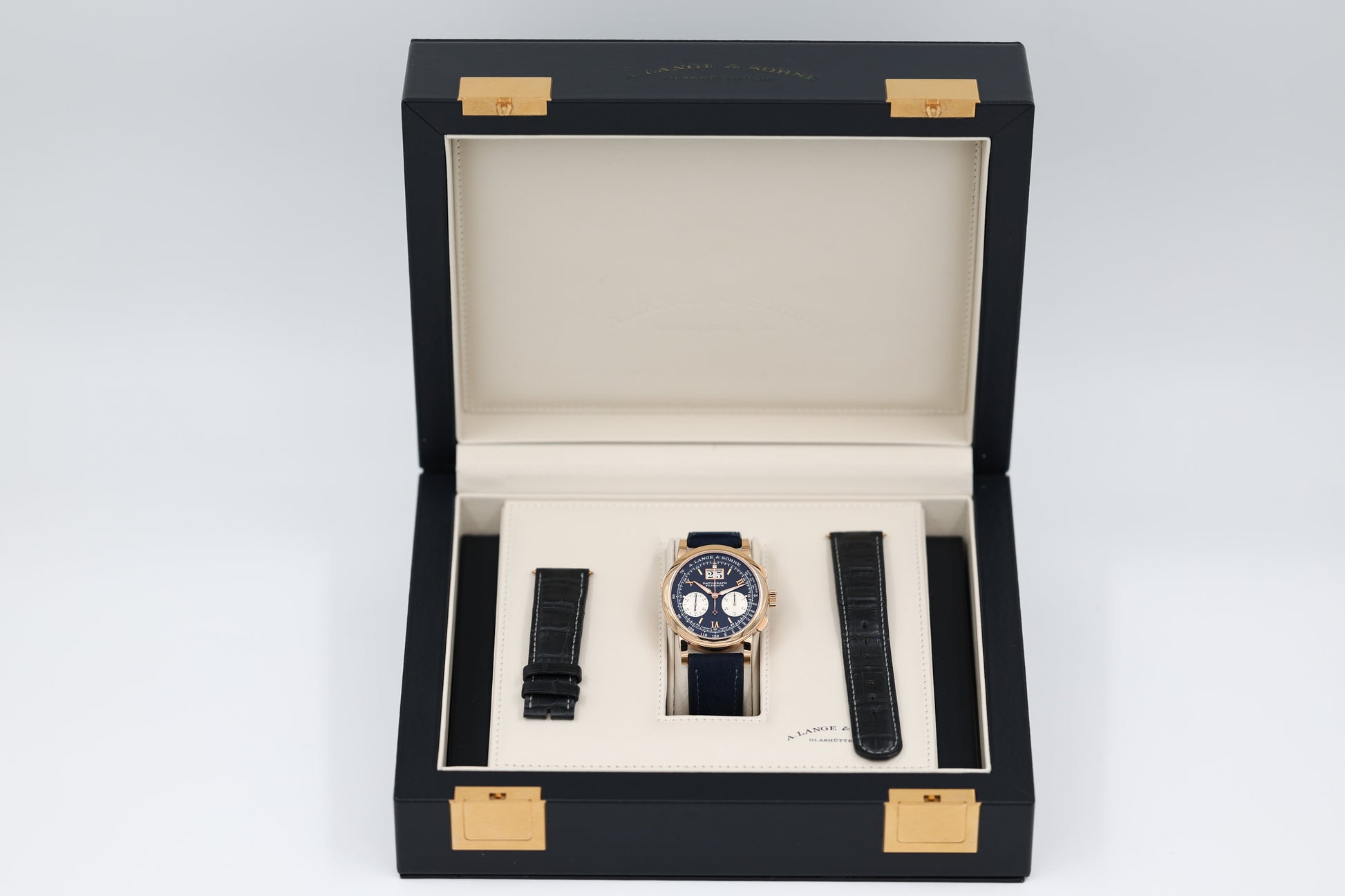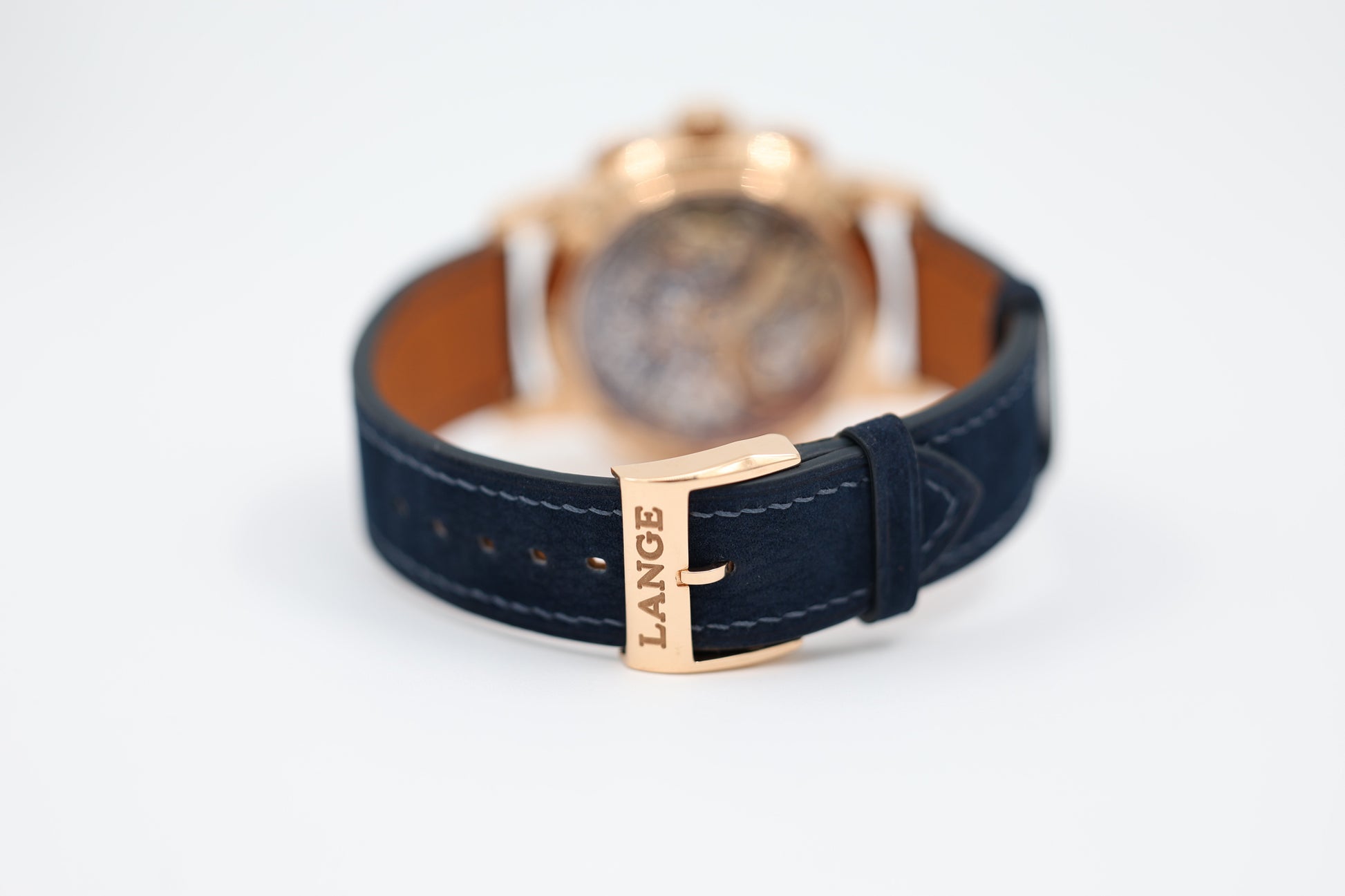 At the heart of this masterpiece lies the L951.1 hand-wound movement, renowned for its breathtaking level of finishing and complex column-wheel chronograph mechanism. Visible through the sapphire caseback, the movement showcases a three-dimensional architecture, with hand-polished bevels, heat-blued screws, and German silver plates, all assembled and decorated by master watchmakers in Glashütte.