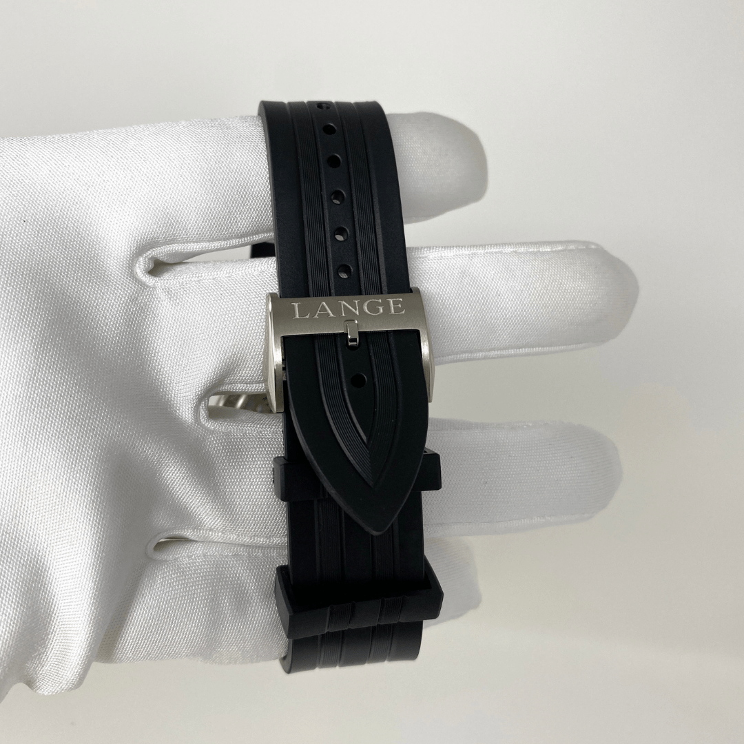 The A. Lange & Söhne Odysseus 363.068 features a white gold case with a diameter of 40.5mm and a height of 11.1 mm. The dial is grey with white-gold hands and appliques. The hour and minute hands as well as all hour markers are luminous. The watch comes on a black rubber strap. This watch features air ducts on the inside for superb wearing comfort.