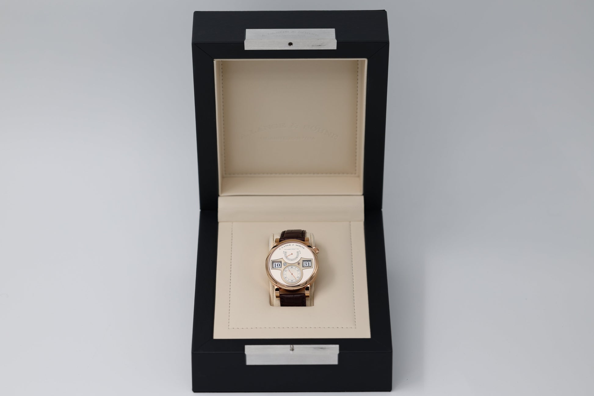 Its silver dial is perfectly balanced, featuring a digital time display with instantaneously jumping hours and minutes, flanked by an elegant small seconds subdial and a power reserve indicator. The manually wound caliber L043.1 movement, visible through the sapphire caseback, reveals the intricate architecture and flawless finishing that A. Lange & Söhne is renowned for.