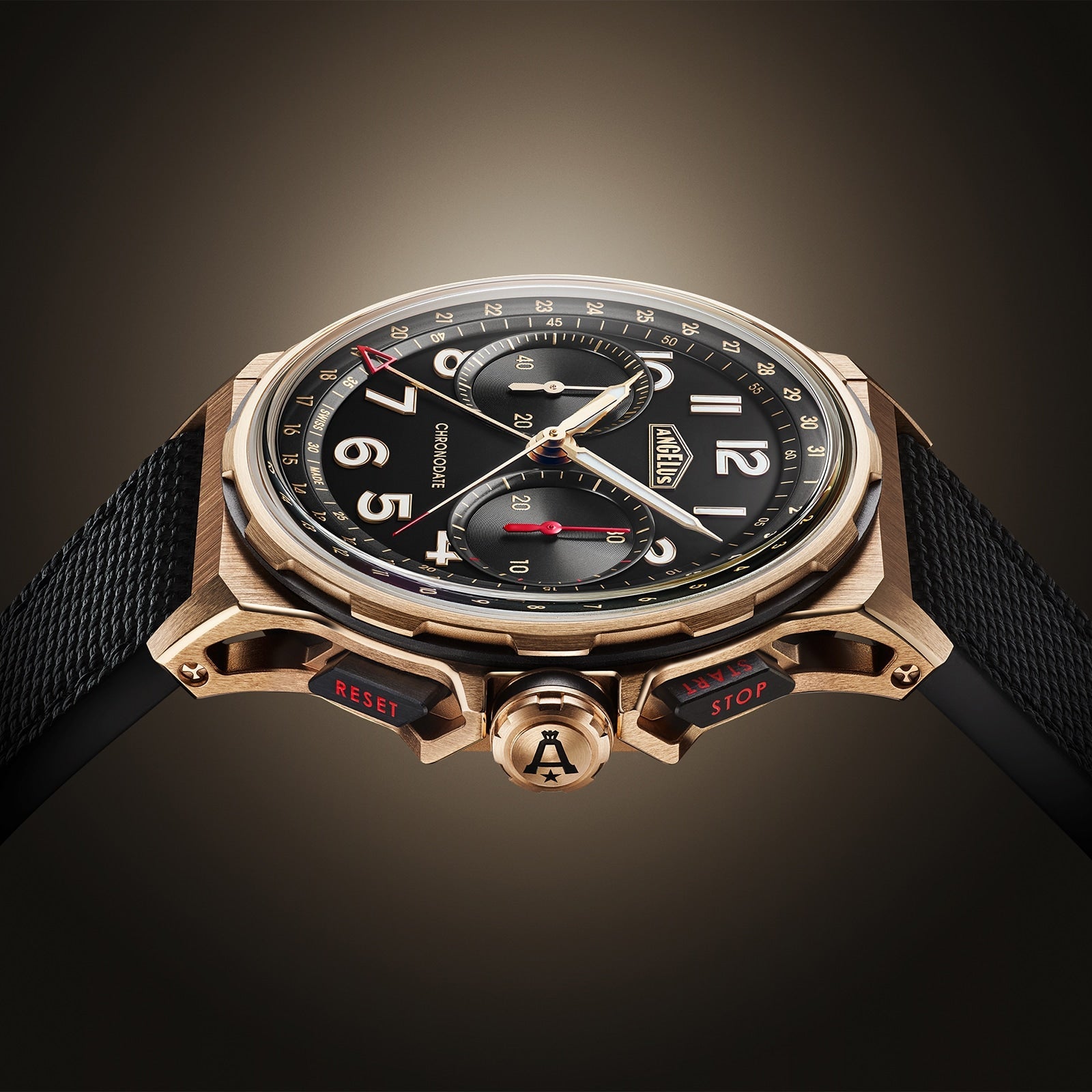 A Repertoire in Gold and Black Chronodate Gold boasts a 42.5 mm case that continues the neo-retro spirit of this sporty chronograph. The movement is housed in a container machined from a carbon-fibre composite. Around this container, Angelus has designed an attachment system consisting of an openworked cradle that brings the case middle and lugs into a single line, made of 5N red gold. Angelus has chosen to give the Chronodate imposing counters that offer optimal readability. The counters are set on a deep-black dial fittingly described as “velvet black”, punctuated with large applied Arabic numerals with Super-LumiNova. Inside, Angelus has installed its calibre A-500 displaying the small seconds at 9 o’clock and a 30-minute chronograph counter at 3 o’clock. Encircling the dial, a hand sweeps over the peripheral date display. Oscillating at a frequency of 4 Hz, the calibre incorporates a column wheel and operates via a self-winding system with an oscillating weight in 5N red gold shaped like a capital letter “A” above a star – Angelus’ emblem. A reference to the early days of Angelus right at the heart of the mechanism.