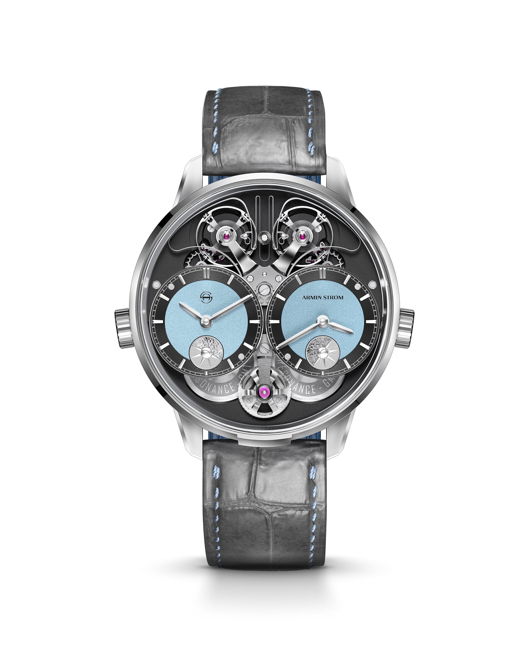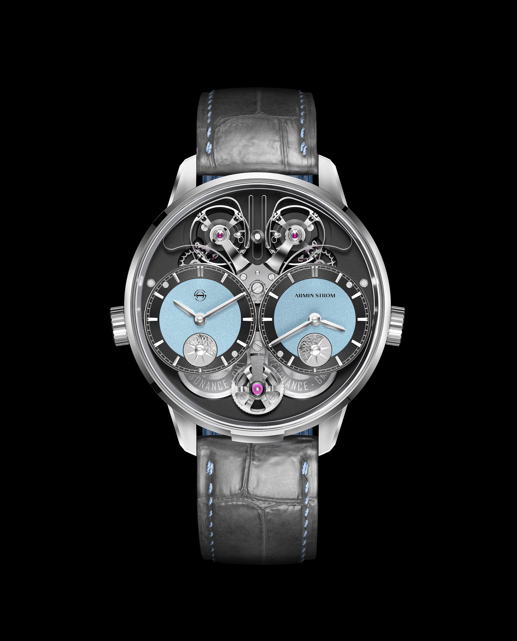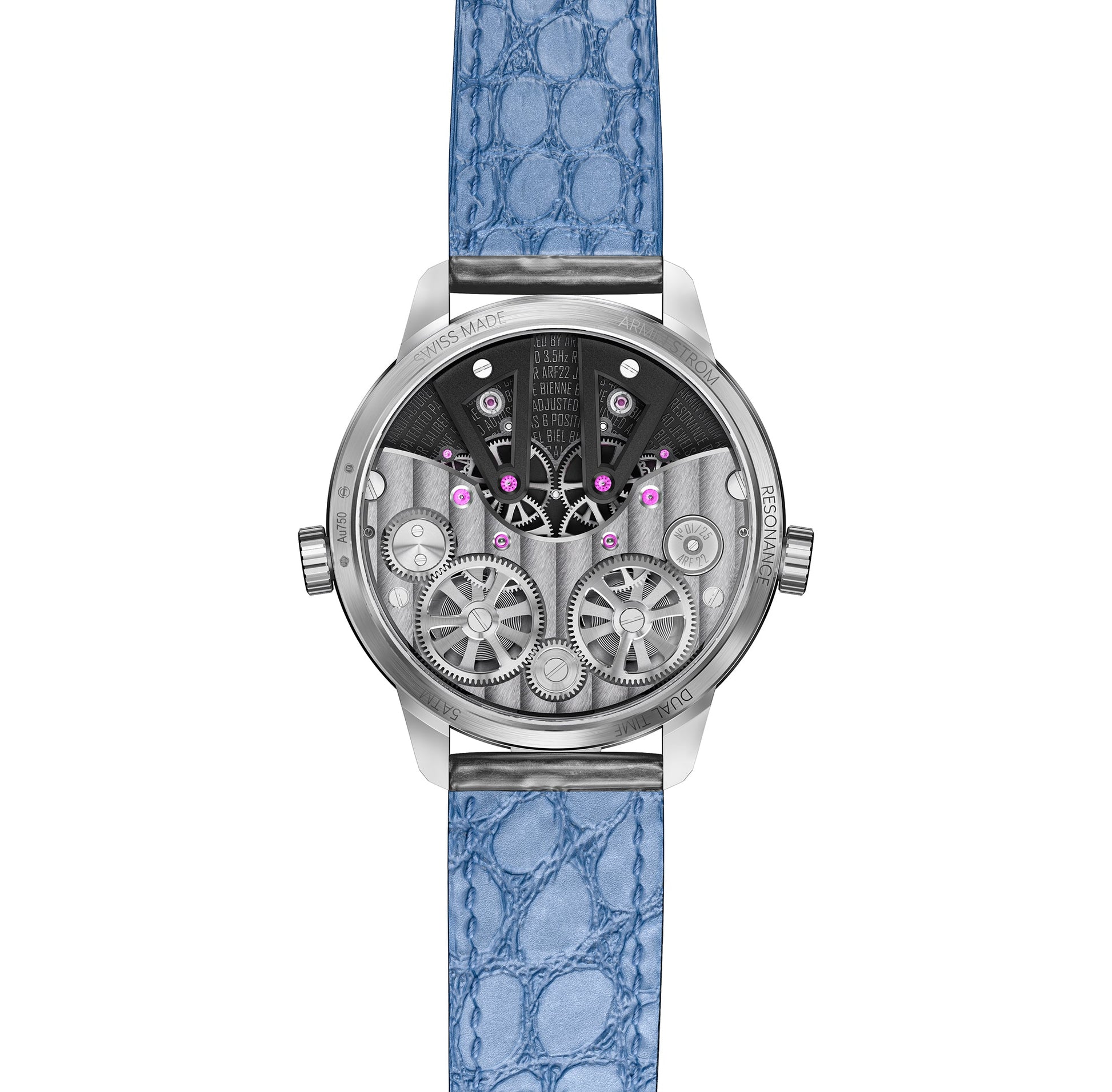 Experience the ultimate combination of history and innovation with the Dual Time Resonance GMT First Edition. In a sleek white gold case, Armin Strom celebrates 15 years of Manufacture with our resilient approach to Resonance and unparalleled han d-finishing. This timepiece boasts two independent time zones, with AM/PM indicators and a ten-year warranty. Limited to just 25 pie ces, it's a truly unique and captivating addition to contemporary watchmaking.