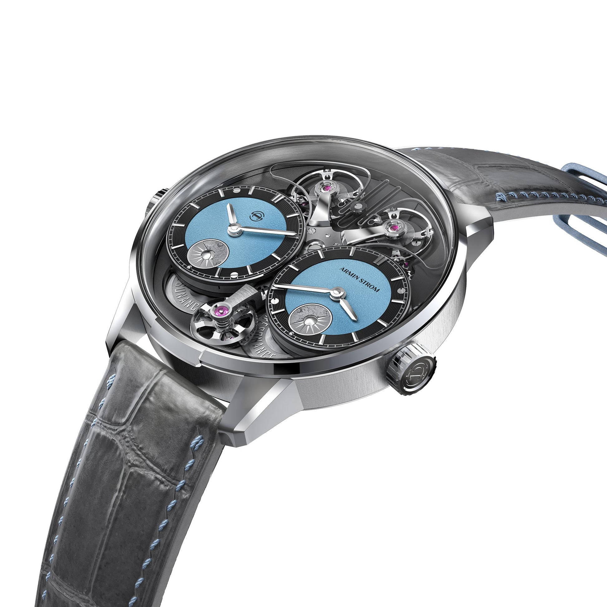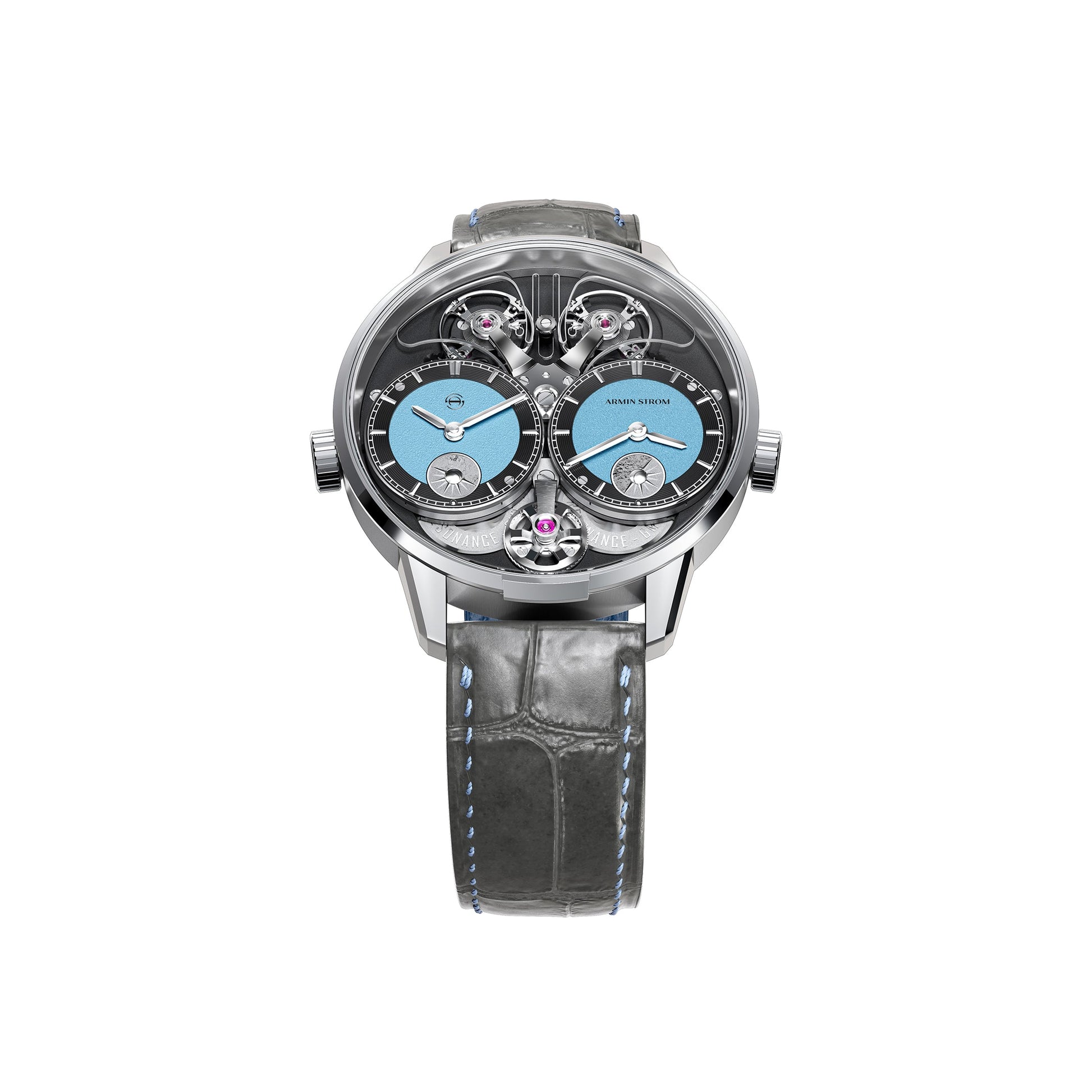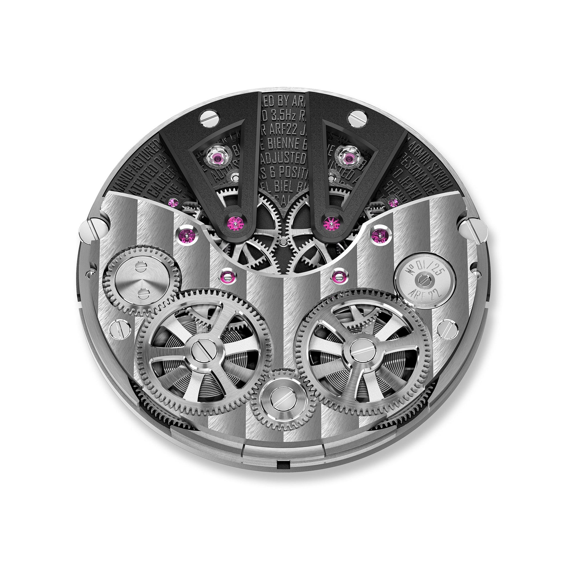 Experience the ultimate combination of history and innovation with the Dual Time Resonance GMT First Edition. In a sleek white gold case, Armin Strom celebrates 15 years of Manufacture with our resilient approach to Resonance and unparalleled han d-finishing. This timepiece boasts two independent time zones, with AM/PM indicators and a ten-year warranty. Limited to just 25 pie ces, it's a truly unique and captivating addition to contemporary watchmaking.