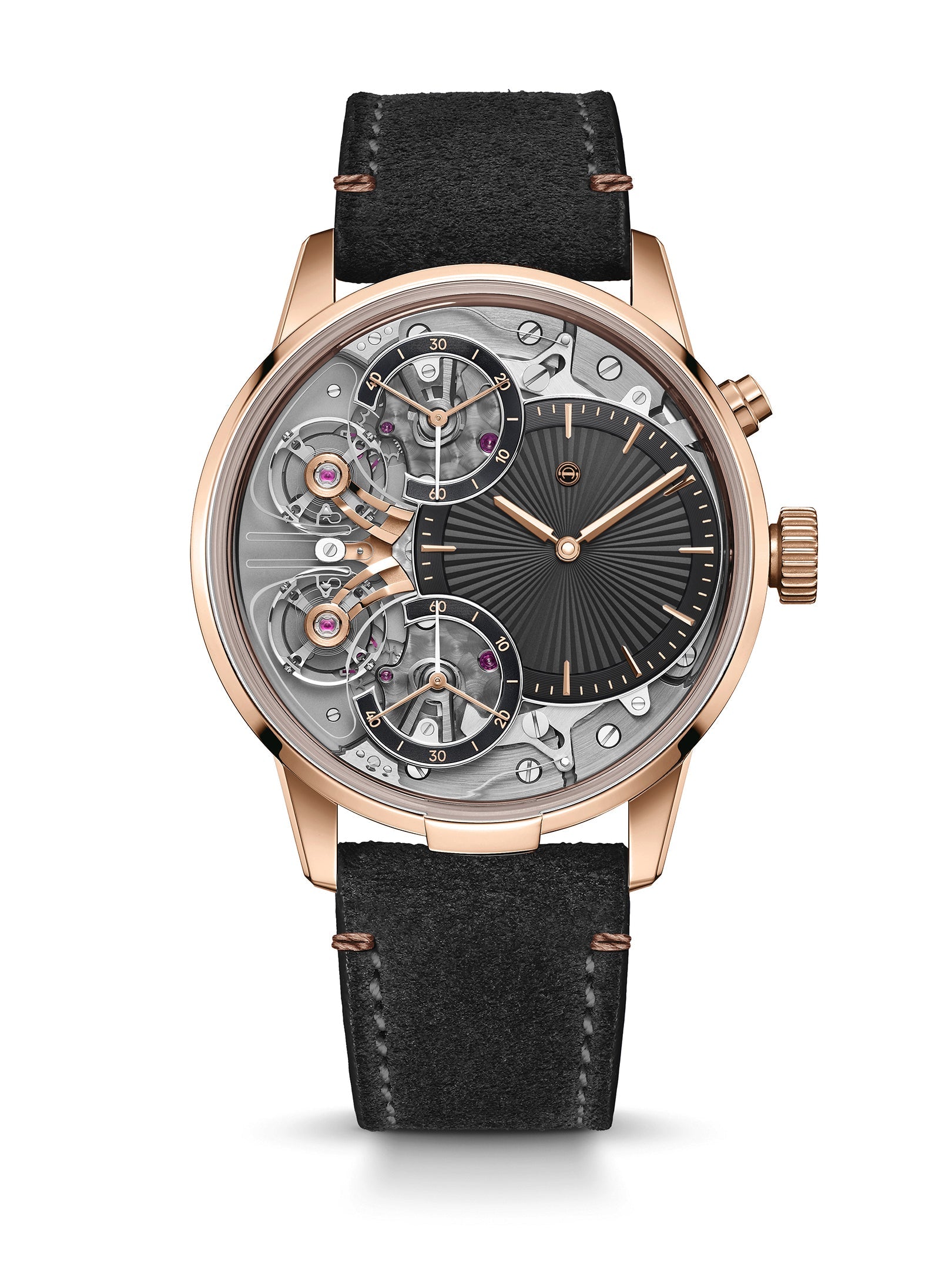 handcrafted sunray guilloché pattern created on a traditional rose engine lathe, framed by a chapter ring with circular finishing that adds depth and texture. Paired with a dark grey Alcantara strap, this new interpretation blends mechanical innovation with timeless