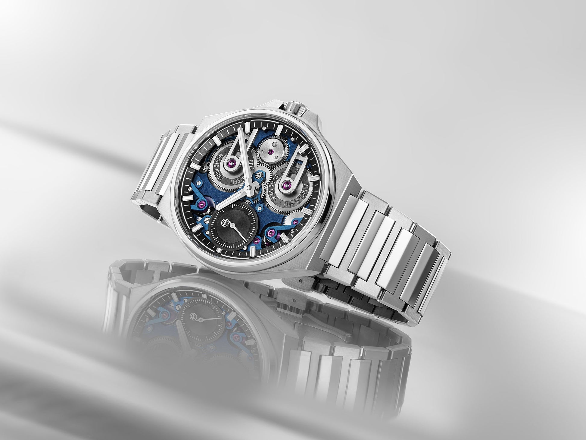 The One Week Manufacture Edition Blue reinterprets Armin Strom’s foundational calibre with a new captivating identity. Housed in a 41 mm stainless steel case and paired with an integrated steel bracelet, the timepiece balances ergonomic performance with sculptural design. The open worked architecture foregoes the traditional dial entirely, allowing the deep blue PVD coated main plate to serve as a visual centerpiece. The watch explores contrast in form and finish, highlighting the depth and clarity of its mechanical design.