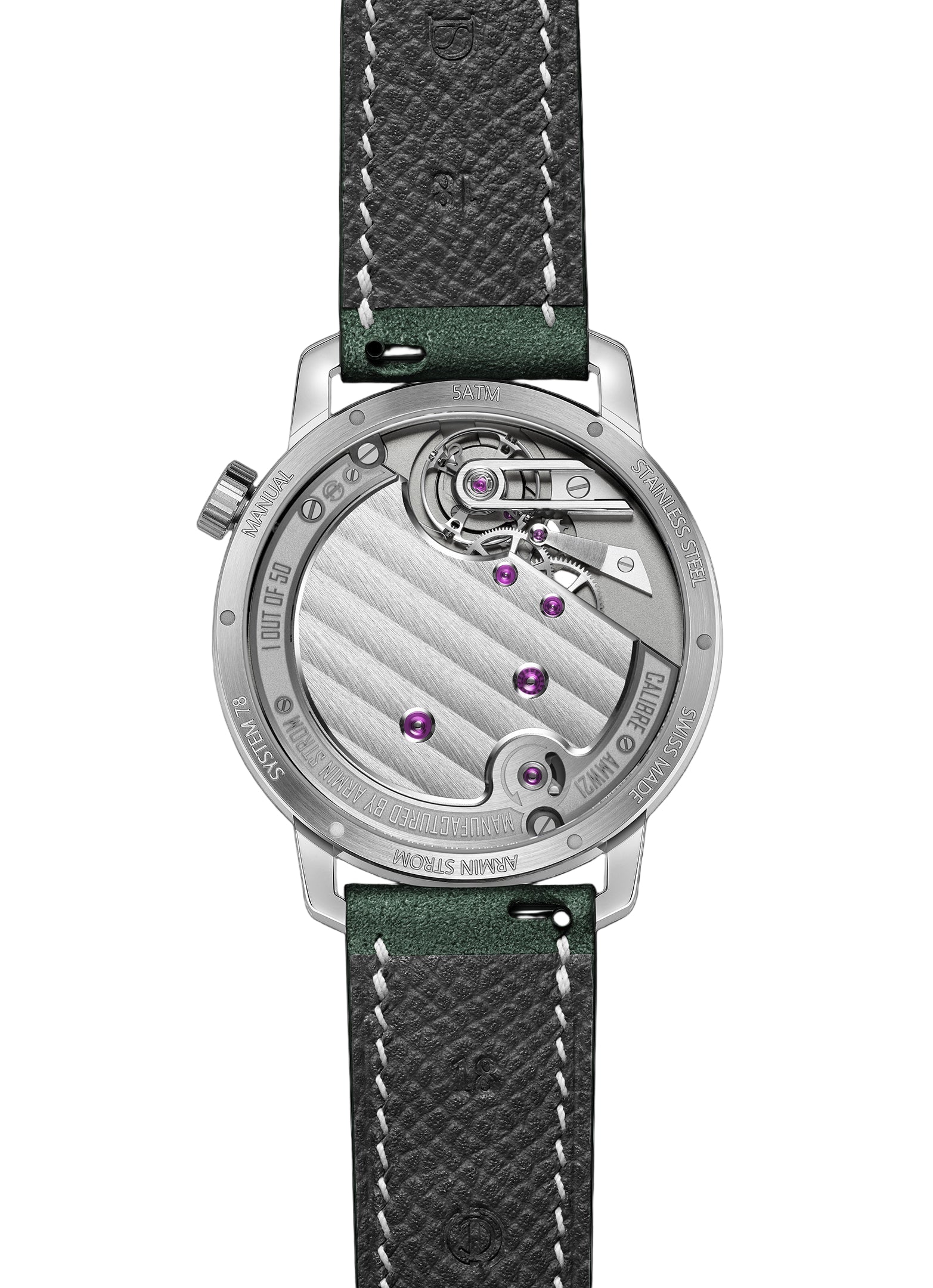 The Tribute 1 Green is powered by the manual-winding Manufacture Caliber AMW21,