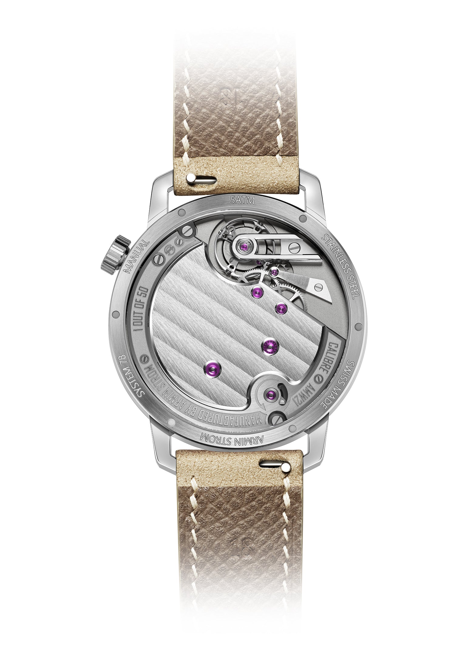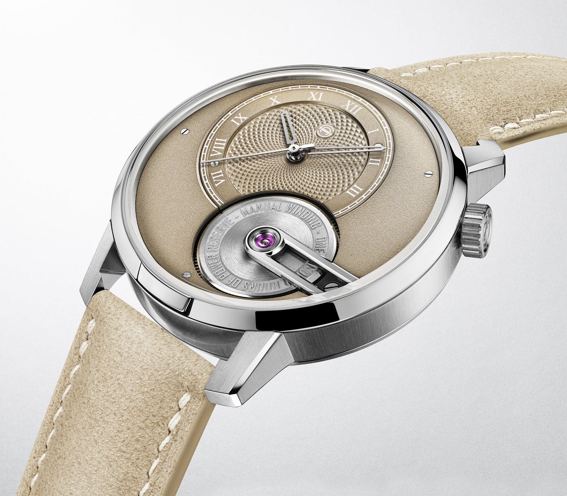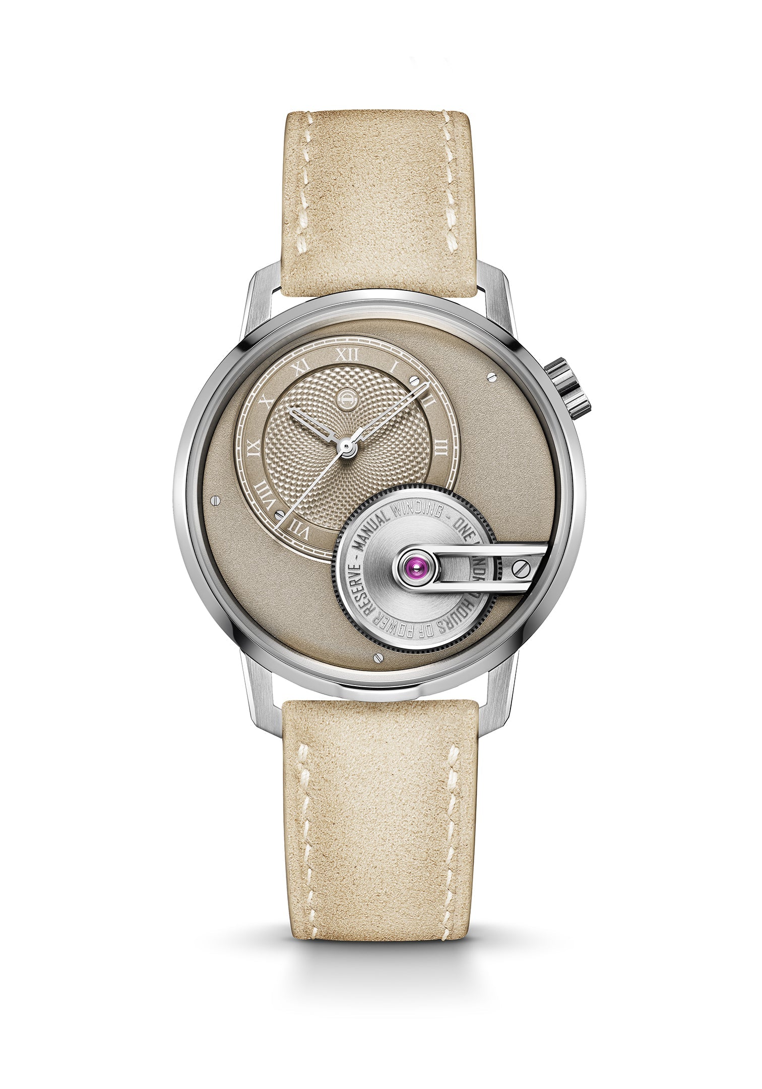 The Tribute 1 Sandstein features warm sandy hues that pay tribute to Armin Strom’s hometown of Burgdorf in Bern, Switzerland. Dra wing inspiration from the region’s iconic Burgdorf sandstone known for its strength and timeless charm this edition redefines the Tr ibute 1 with subtle elegance. Its off-centre sand-colored dial showcases a delicate grain d’orge guilloché pattern and Roman numeral s, paired perfectly with a frosted subdial for balanced sophistication. Finished with a coordinating Alcantara strap and housed in a sleek 38 mm stainless steel case with brushed and polished details, the Sandstein brings a grounded yet refined presence to the col lection.