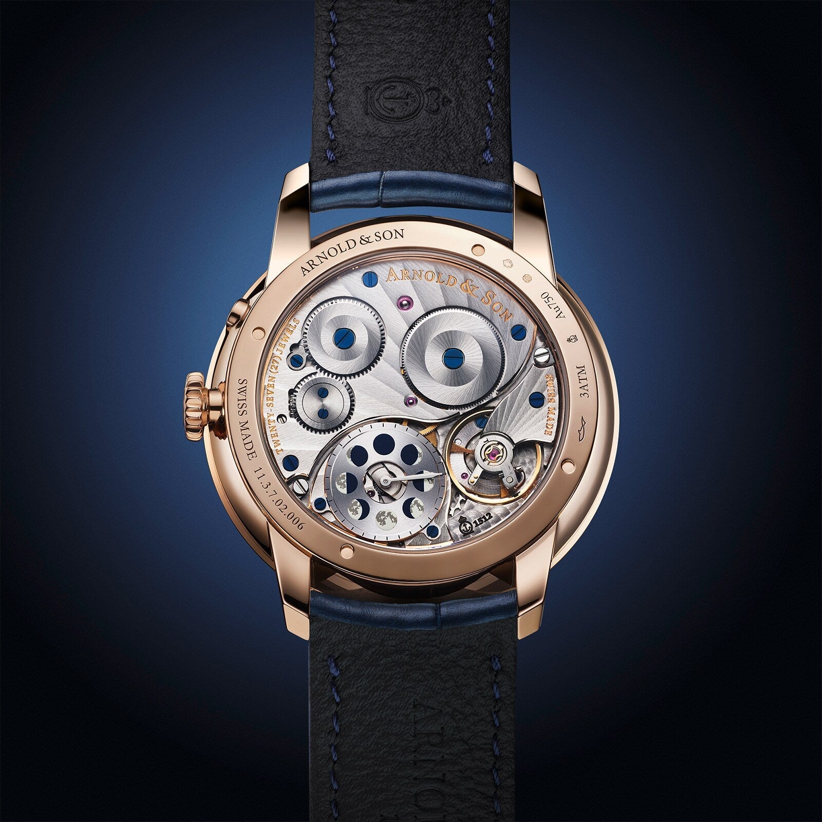 Furrows of light The dials on these new creations present a unique finish known as Stellar Rays , its aesthetic obtained through skilfully irregular engraving. Several depths and widths of rays coexist and follow on from one another, creating their own rhythm, each generating a fluctuating interplay of light and a depth obtained by applying several layers of transparent lacquer. This unique effect is employed in two forms. Perpetual Moon 41.5 Red Gold is combined with a dense, deep blue adorned with gold edging on the moon aperture, together with golden hands and hour markers.