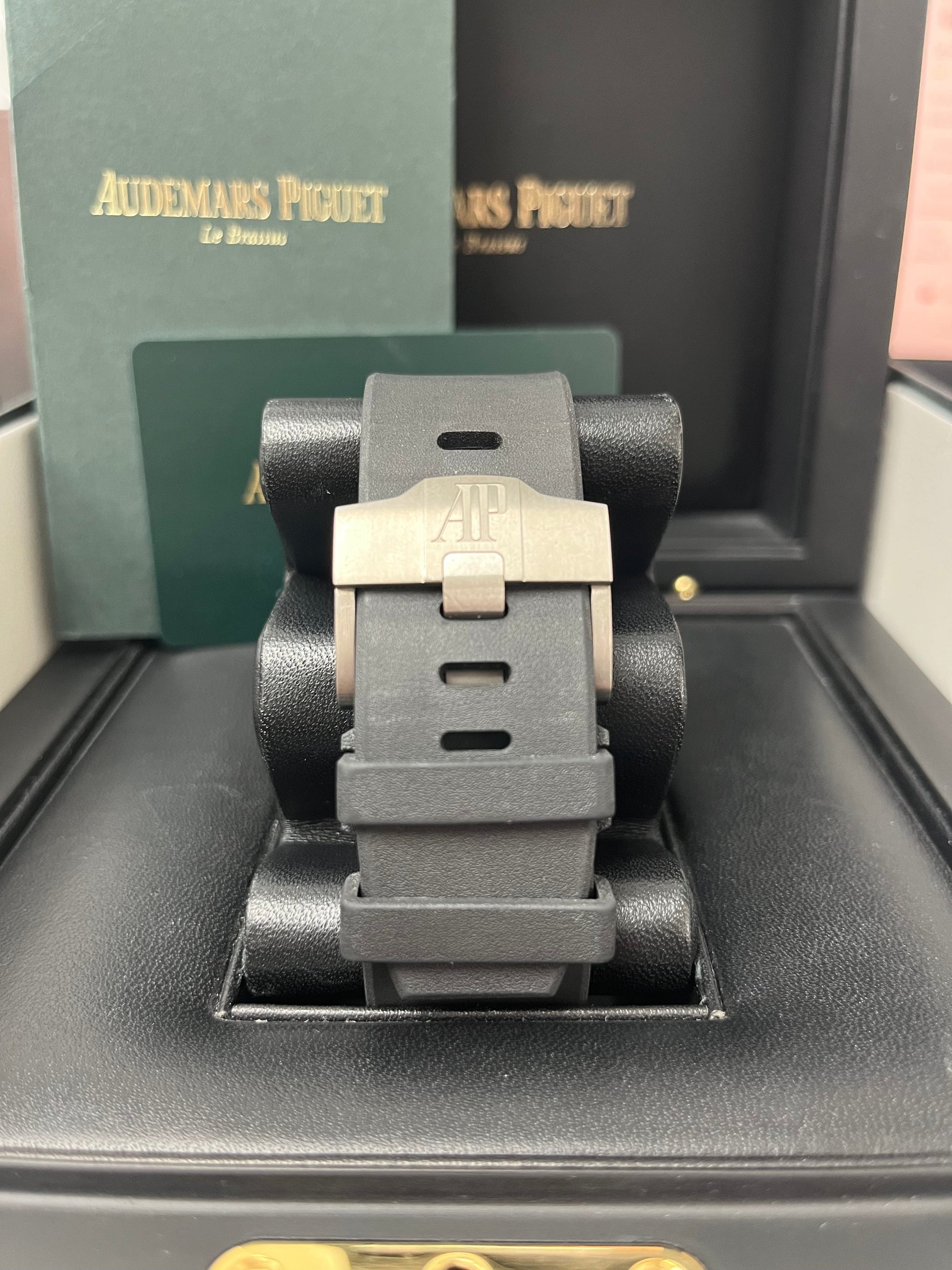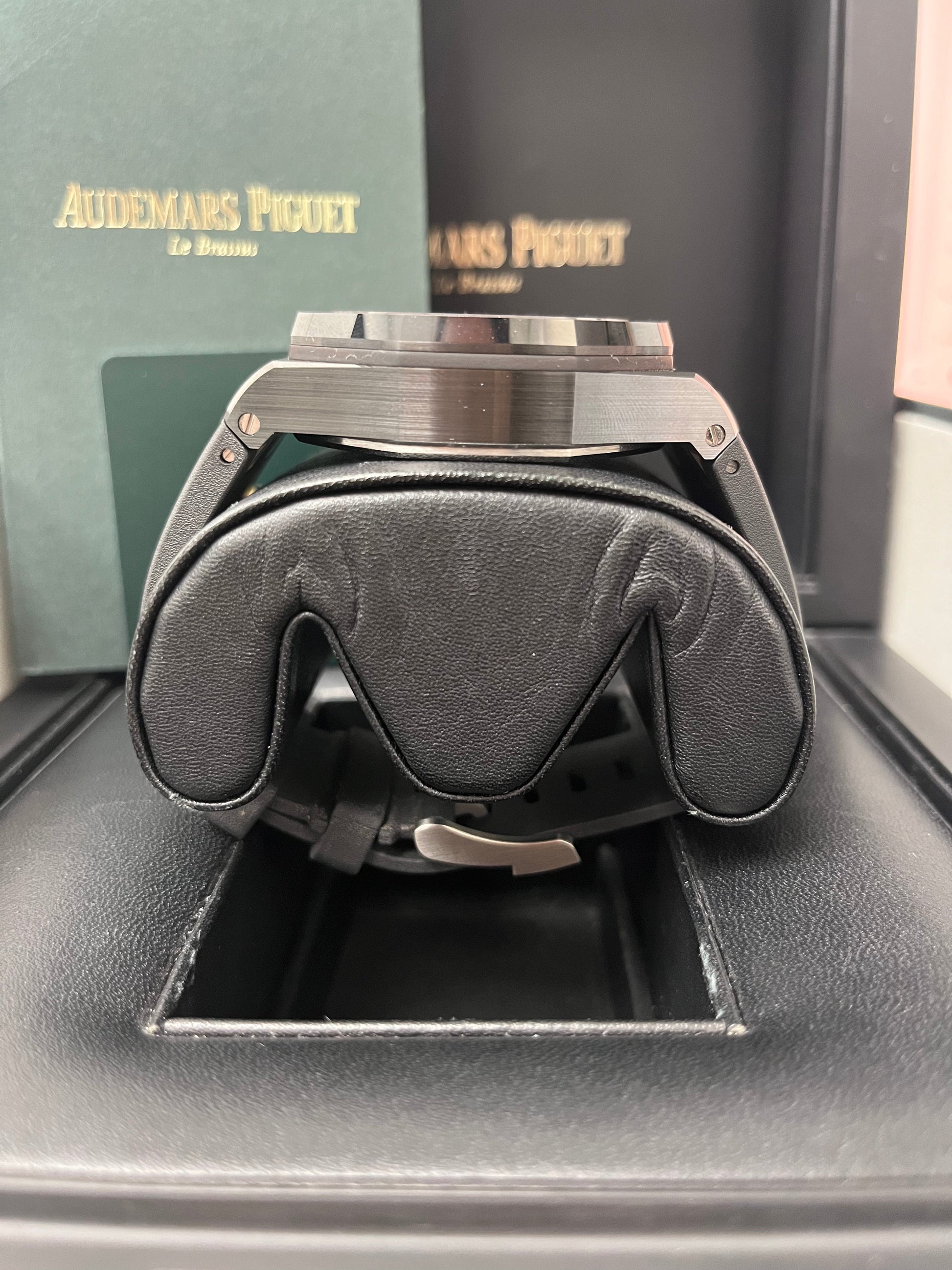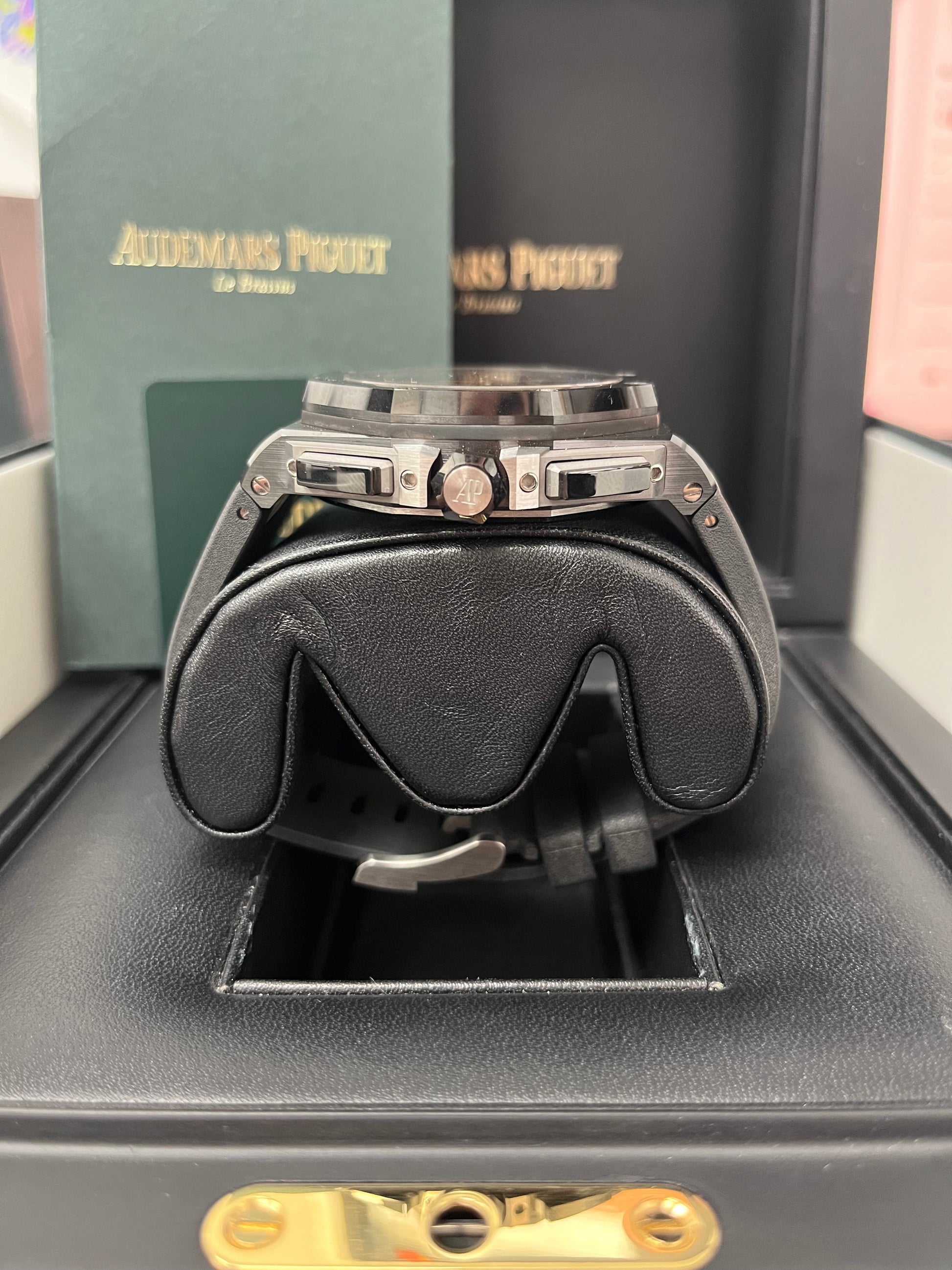 44mm black ceramic case, 14.4 mm thick, screw-locked crown and push pieces with titanium push piece guards, black ceramic bezel, sapphire crystal, black dial with Méga Tapisserie” pattern, black counters, pink gold applied hour-markers and Royal Oak hands with luminescent coating, black inner bezel, Calibre 3126/3840 Manufacture self-winding movement with chronograph, hours, minutes, small seconds, date, approximately 50 hours of power reserve, black rubber strap, titanium pin buckle. Water resistant up to 100 meters.