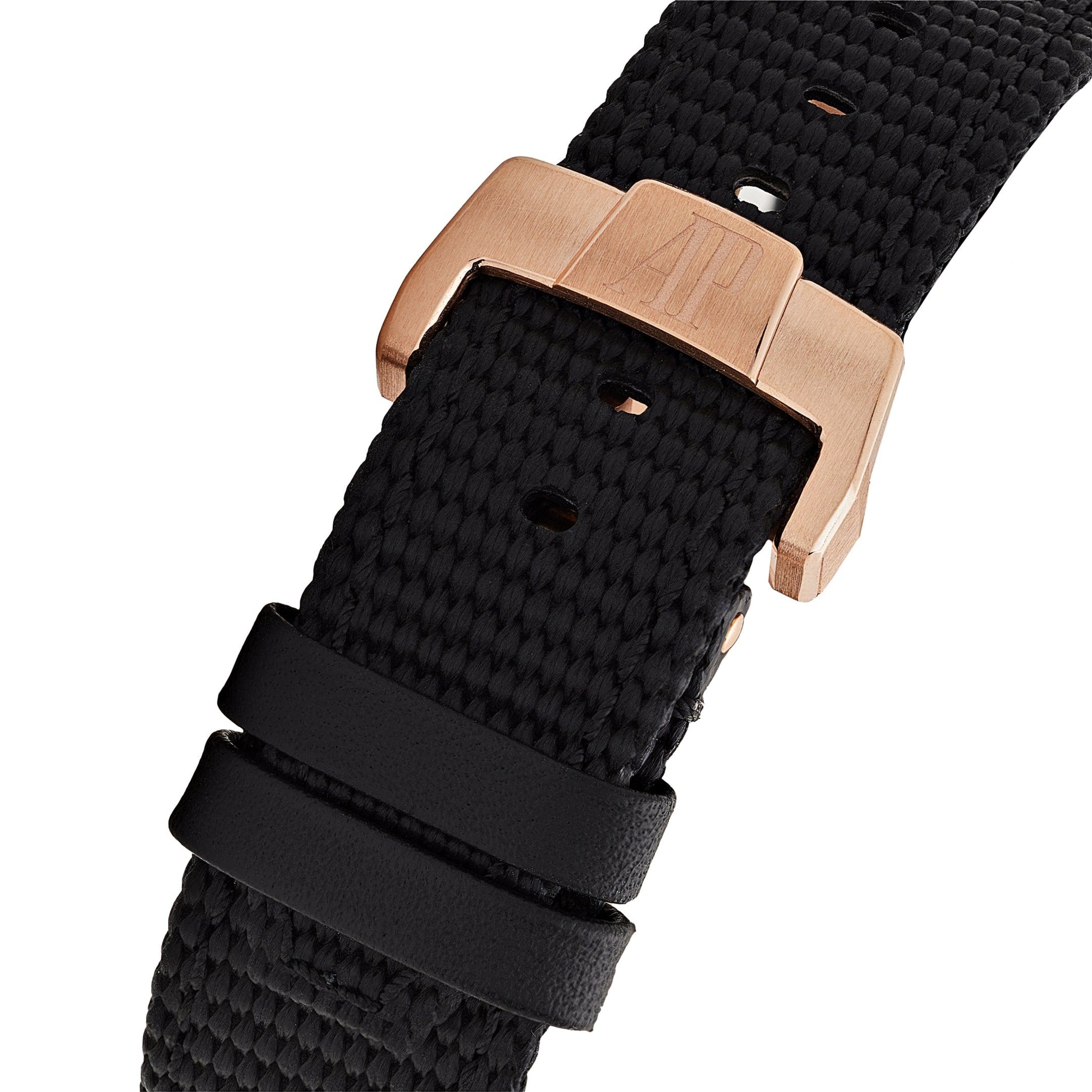 The Audemars Piguet Code 11.59 Selfwinding Flying Tourbillon Limited Dubai Edition 26396OR.OO.D002CR.01 is a stunning blend of luxury and technical innovation. Housed in a 41mm 18k rose gold case, it features a sleek black dial protected by sapphire crystal. The flying tourbillon showcases exquisite craftsmanship, while the self-winding movement ensures precision and elegance. Complemented by black fabric strap with a folding clasp, this watch is water-resistant up to 30 meters.