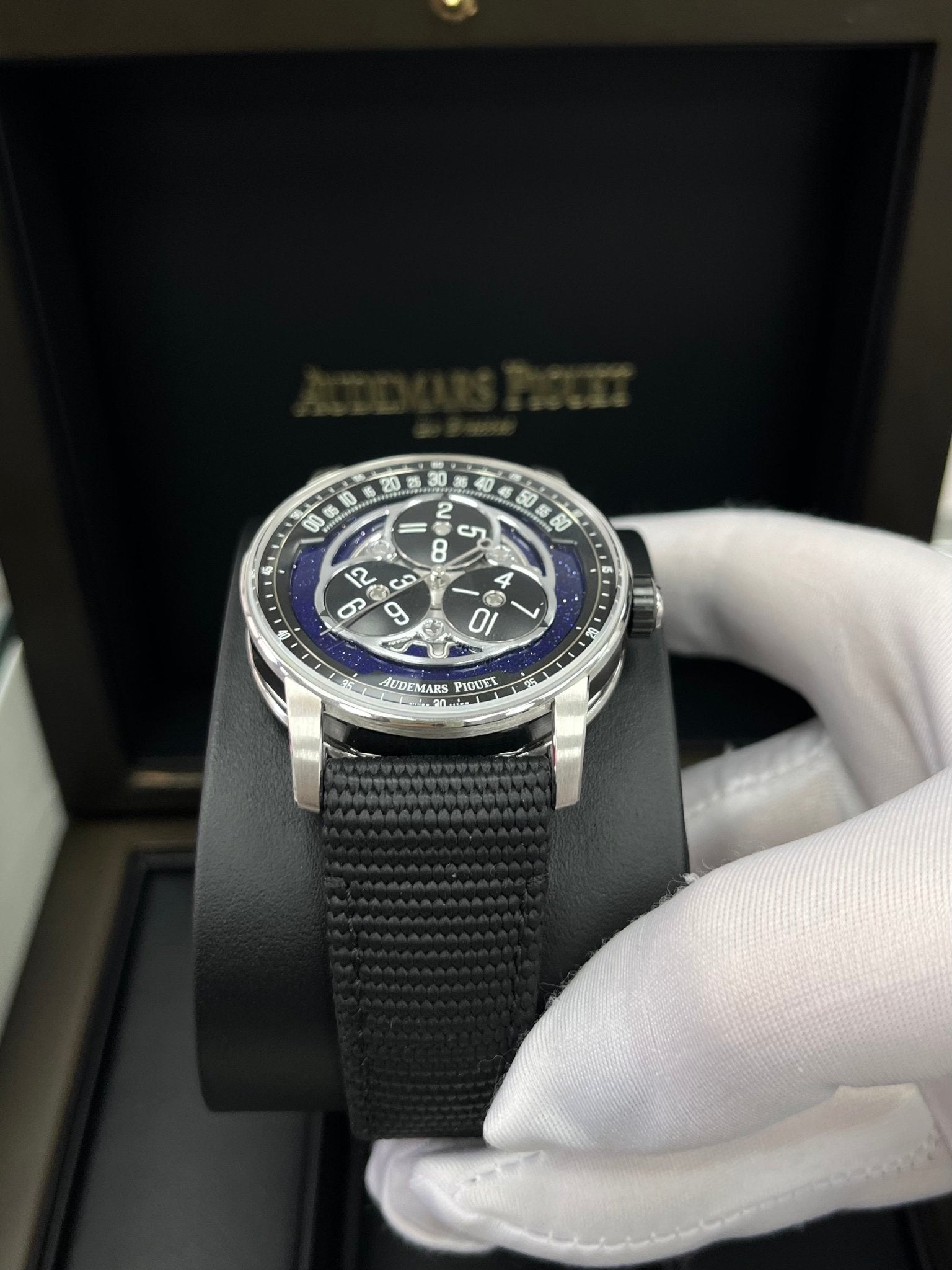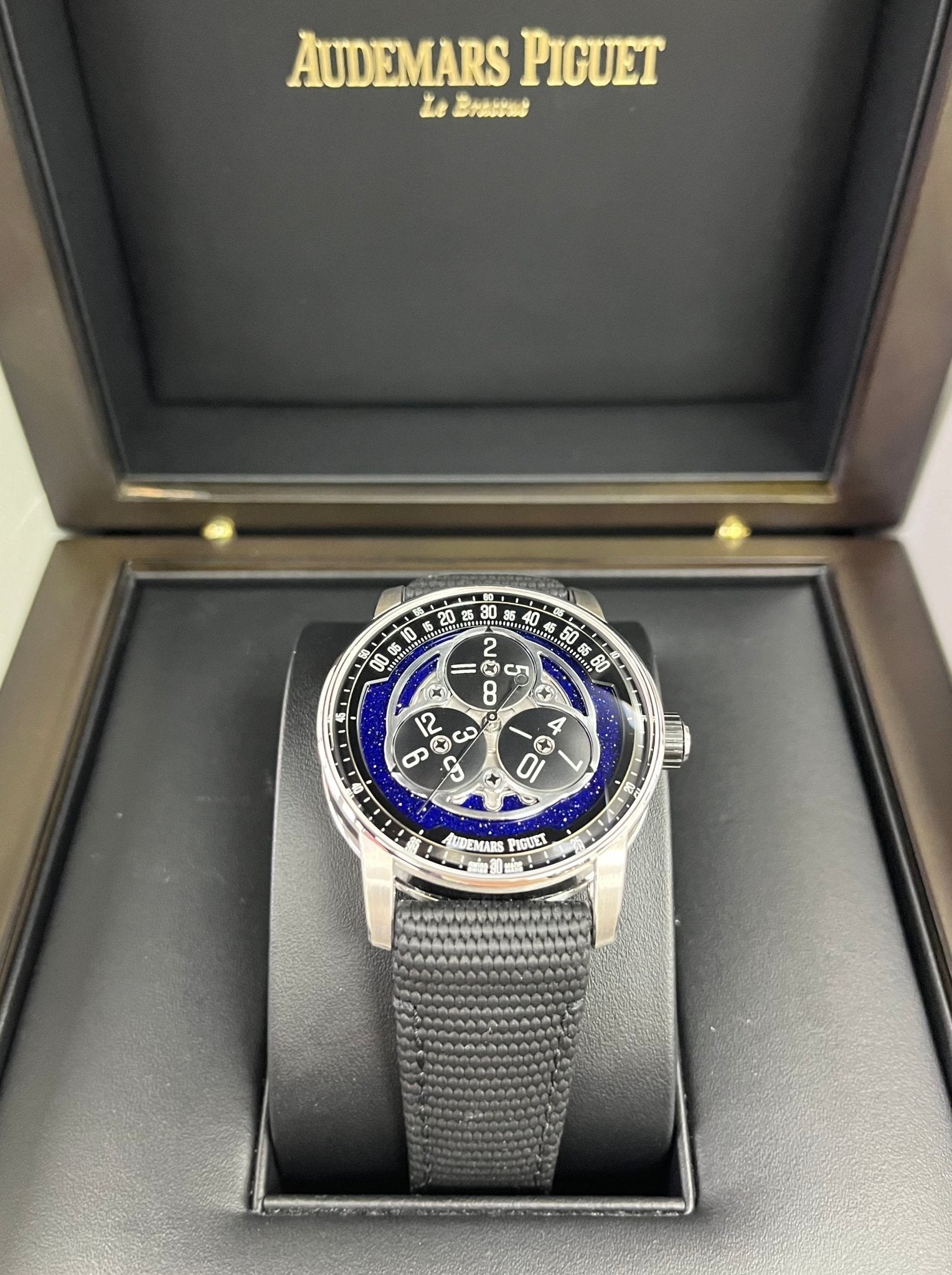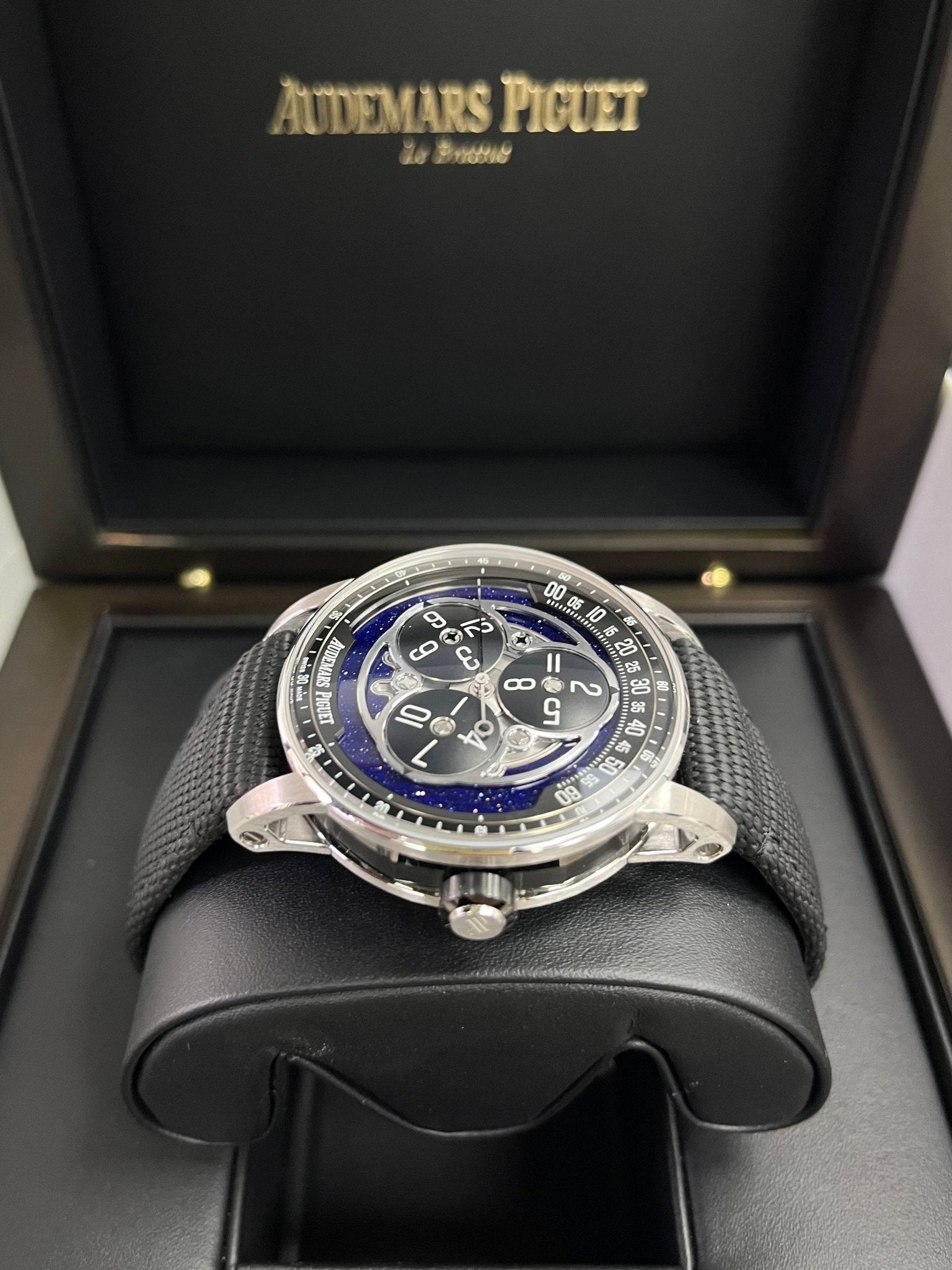 Blue aventurine dial, black opaline aluminium discs, 18-carat white gold hand and black inner bezel.