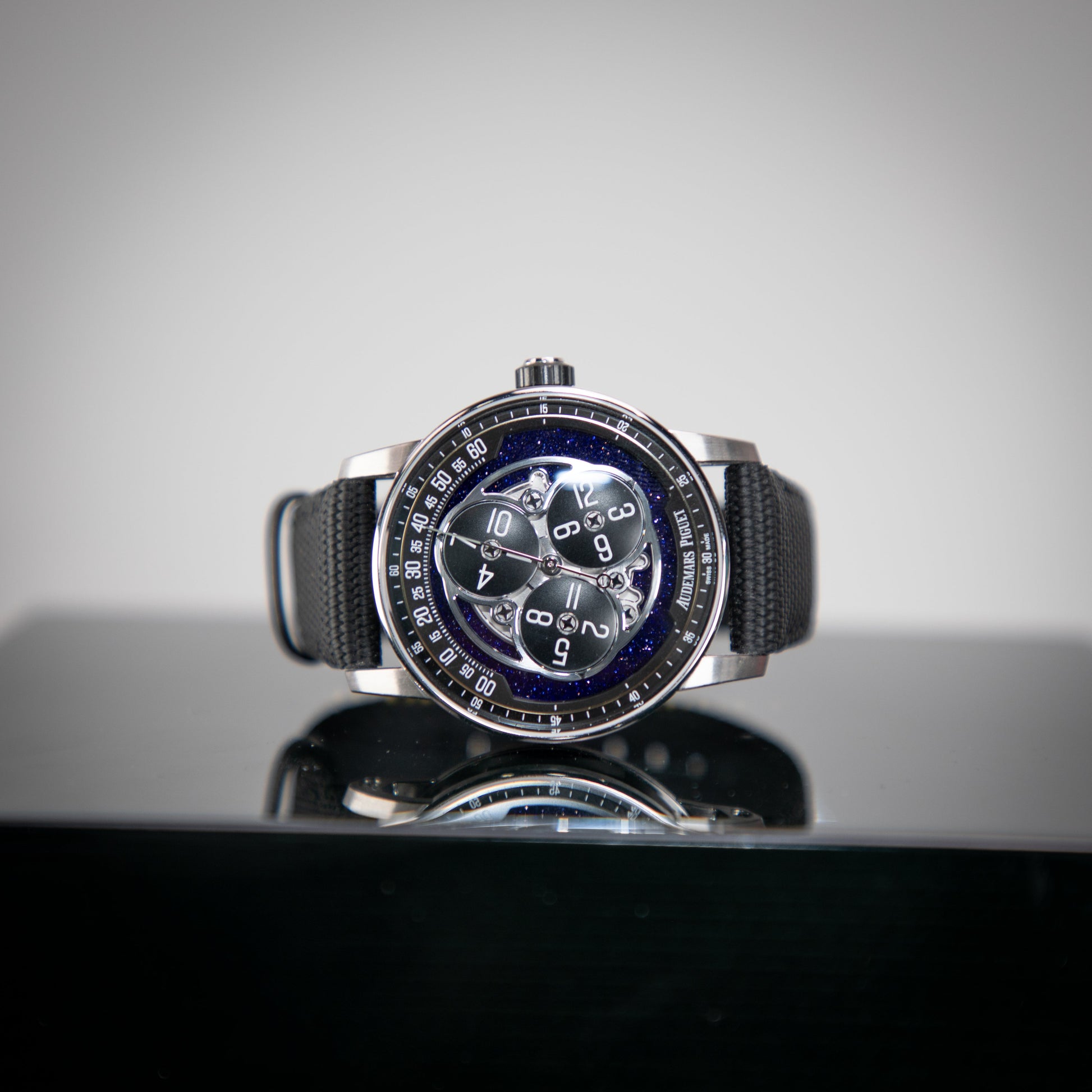The Code 11.59 by Audemars Piguet Starwheel offers a contemporary take on the wandering hours complication. Its two-tone case combines black ceramic with white gold, while its blue aventurine dial serves as backdrop to the three black PVD-coated aluminium wandering hours discs making their rotation in the centre.