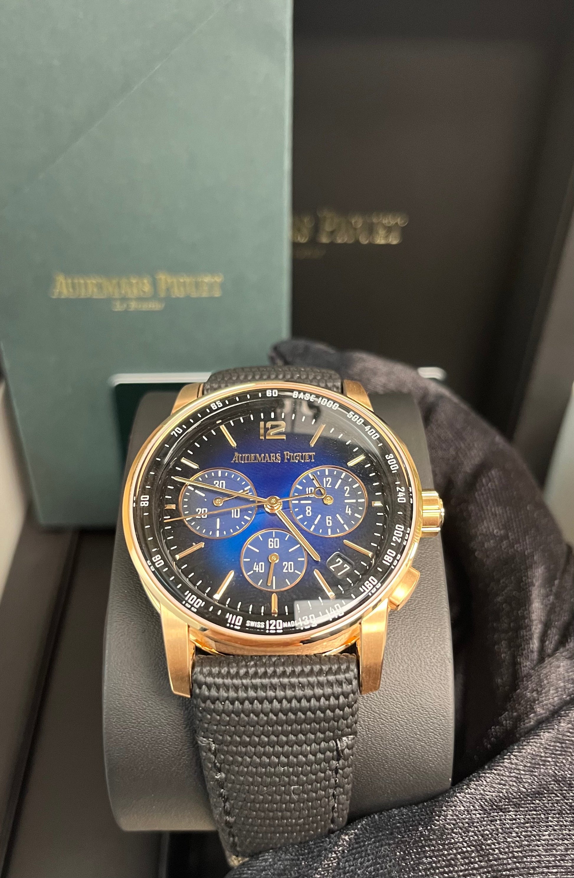 26393OR.OO.A002KB.03 Audemars Piguet. This Men’s watch has 41 mm Brushed & polished 18K Rose gold case. Lacquered smoked blue dial. 18K Rose gold hour markers and hands. Black textile strap. Dial Type: Analog. Date display between 4 and 5 o’clock position. Chronograph – three sub-dials displaying: 60 second located at 6 o’clock movement, 30 minute located at 9 o’clock movement and 12 hours at 3 o’clock movement. Audemars Piguet Calibre 4401 Automatic movement, containing 40 Jewels, composed of 367 parts, bitting at 28800 vph, and has a power reserve of approximately 70 hours. Water resistance up to 30m./ 100 ft.