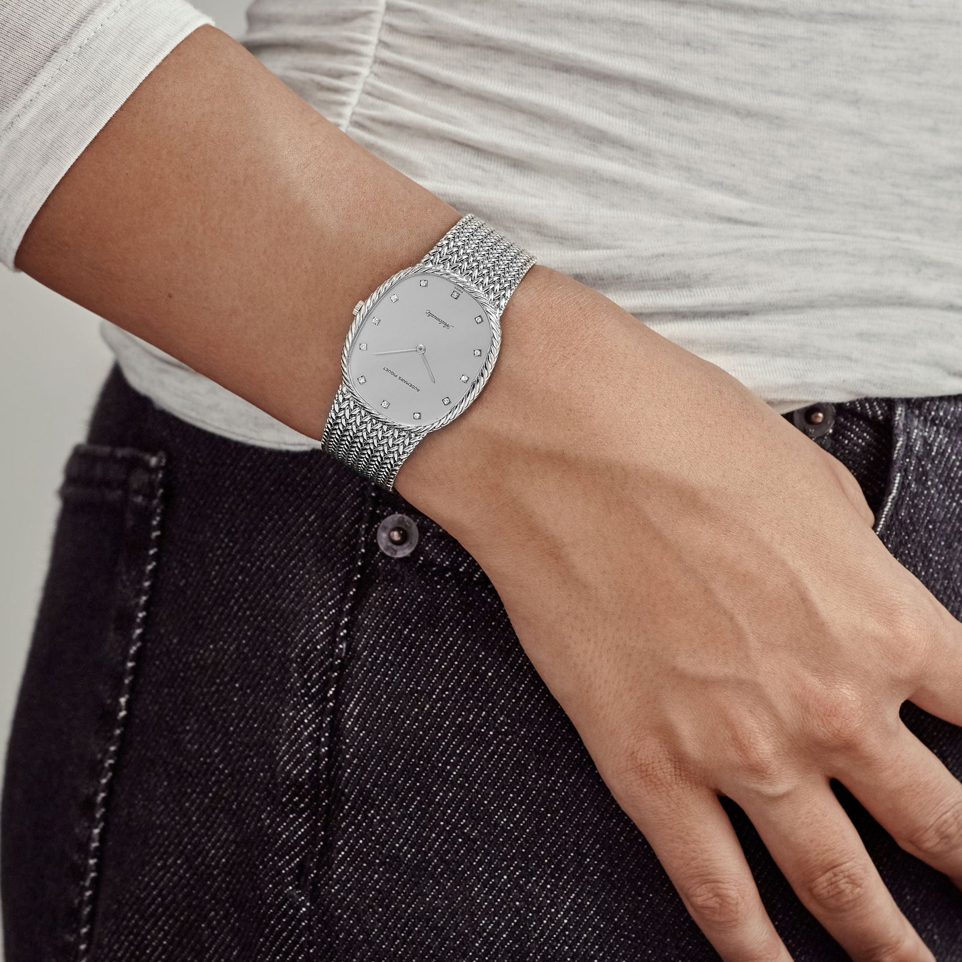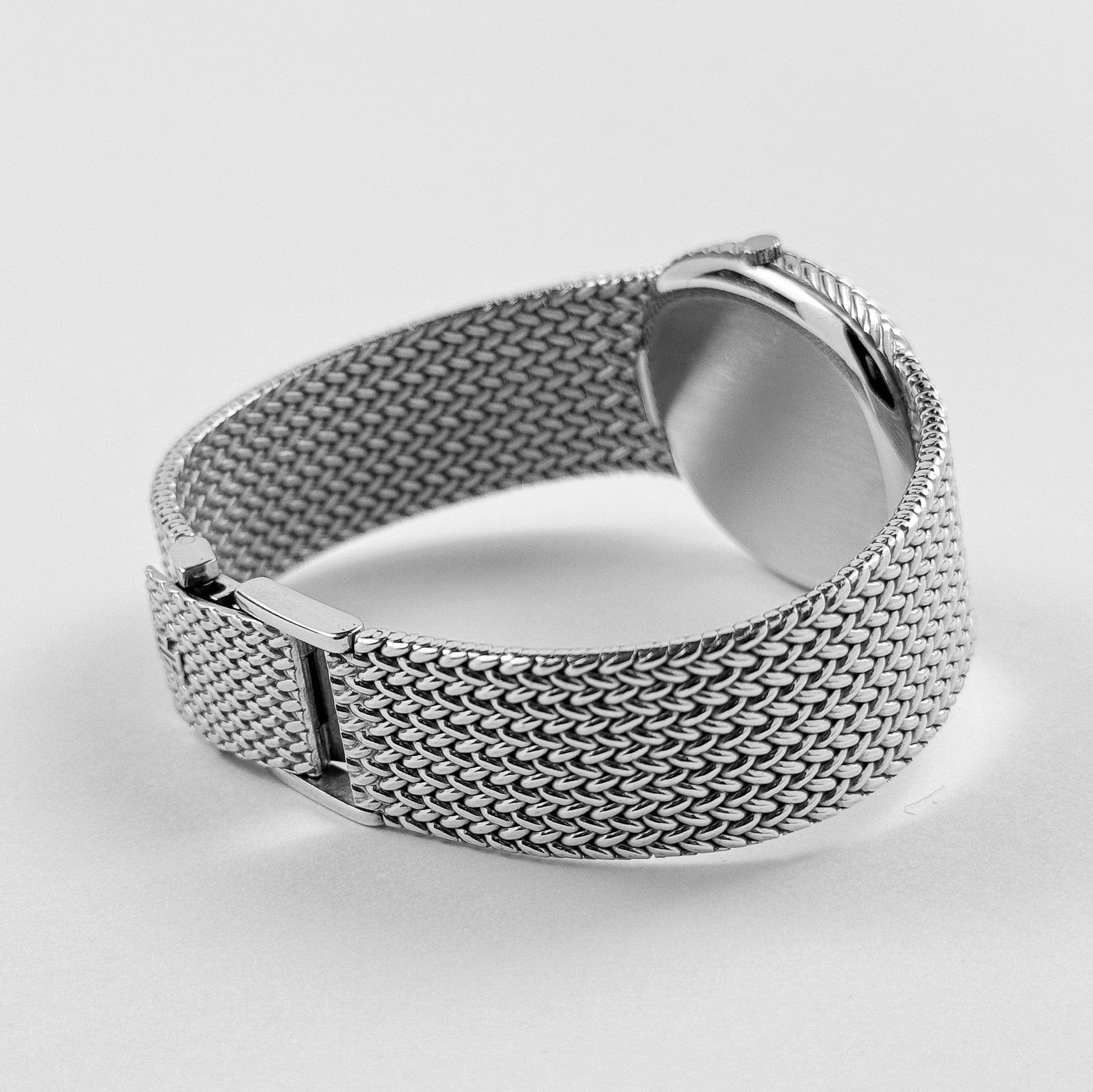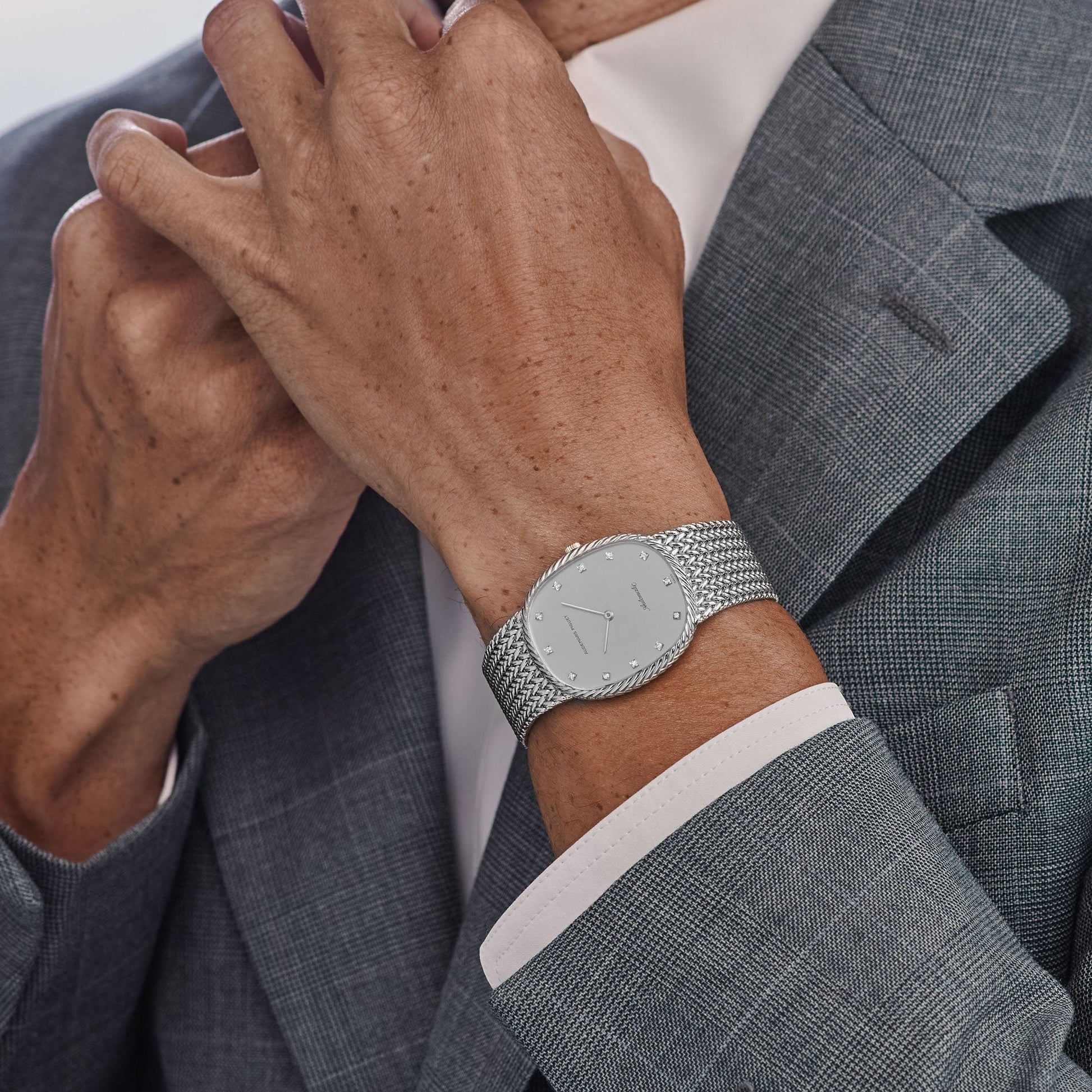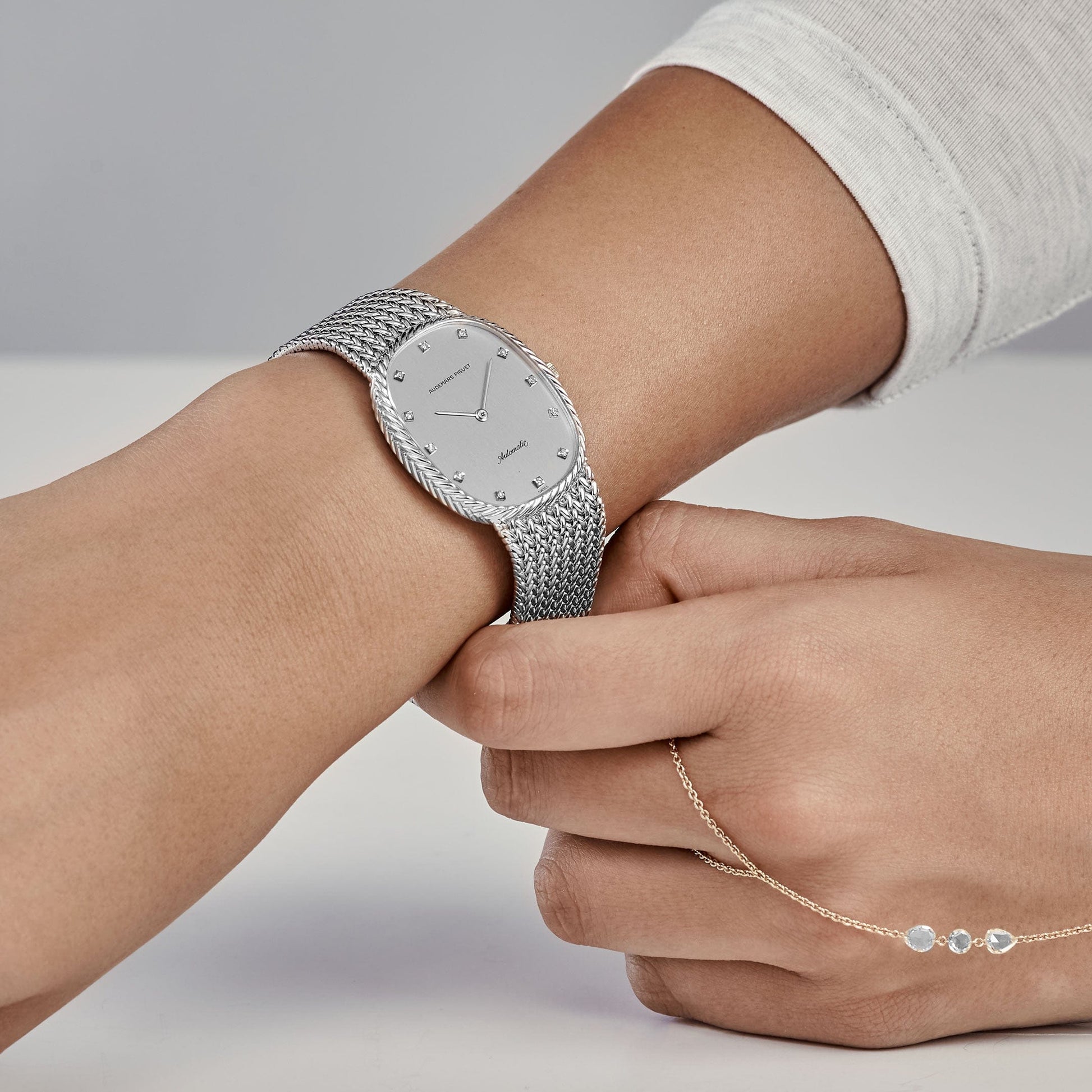 The Audemars Piguet Jumbo Ellipse in white gold is an elegant expression of understated glamour. Its softly curved 31 × 35 mm case is crafted in polished 18k white gold, topped with a diamond-set silver dial that catches the light with subtle flair. The case is blended with an integrated bracelet that enhances its seamless, jewelry-like character.