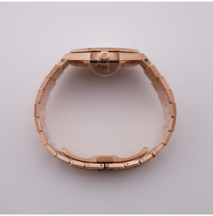 33mm x 7.00mm 18K pink gold case, diamond bezel with 40 brilliant-cut diamonds (~0.71ct), glareproofed sapphire crystal, silver dial with Grande Tapisserie pattern, pink gold applied hour-markers, and pink gold Royal Oak hands with luminescent coating , quartz Audemars Piguet Calibre 2713 movement with hours, minutes, and date, approximately 39 months of power reserve, 18K pink gold bracelet. Water resistant to 50 meters.