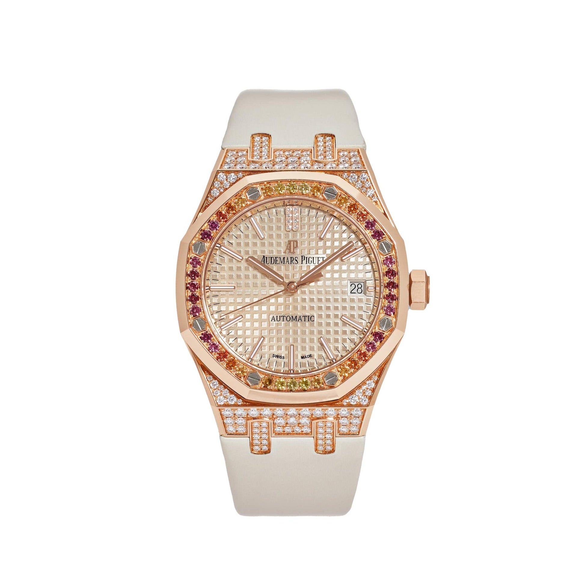 Introducing an impressive addition to Audemars Piguet's Royal Oak collection; The 18-carat rose gold 37mm case of this watch is paved with 124 brilliant-cut diamonds, while the bezel adorns 40 yellow sapphires, red garnets and orange spessartite garnets. This timepiece has a beige dial with the distinctive Grande Tapisserie pattern, rose gold applied hour-markers with 2 diamond-set hour-markers at 12 o'clock. The watch comes on a beige satin-finished calfskin strap.