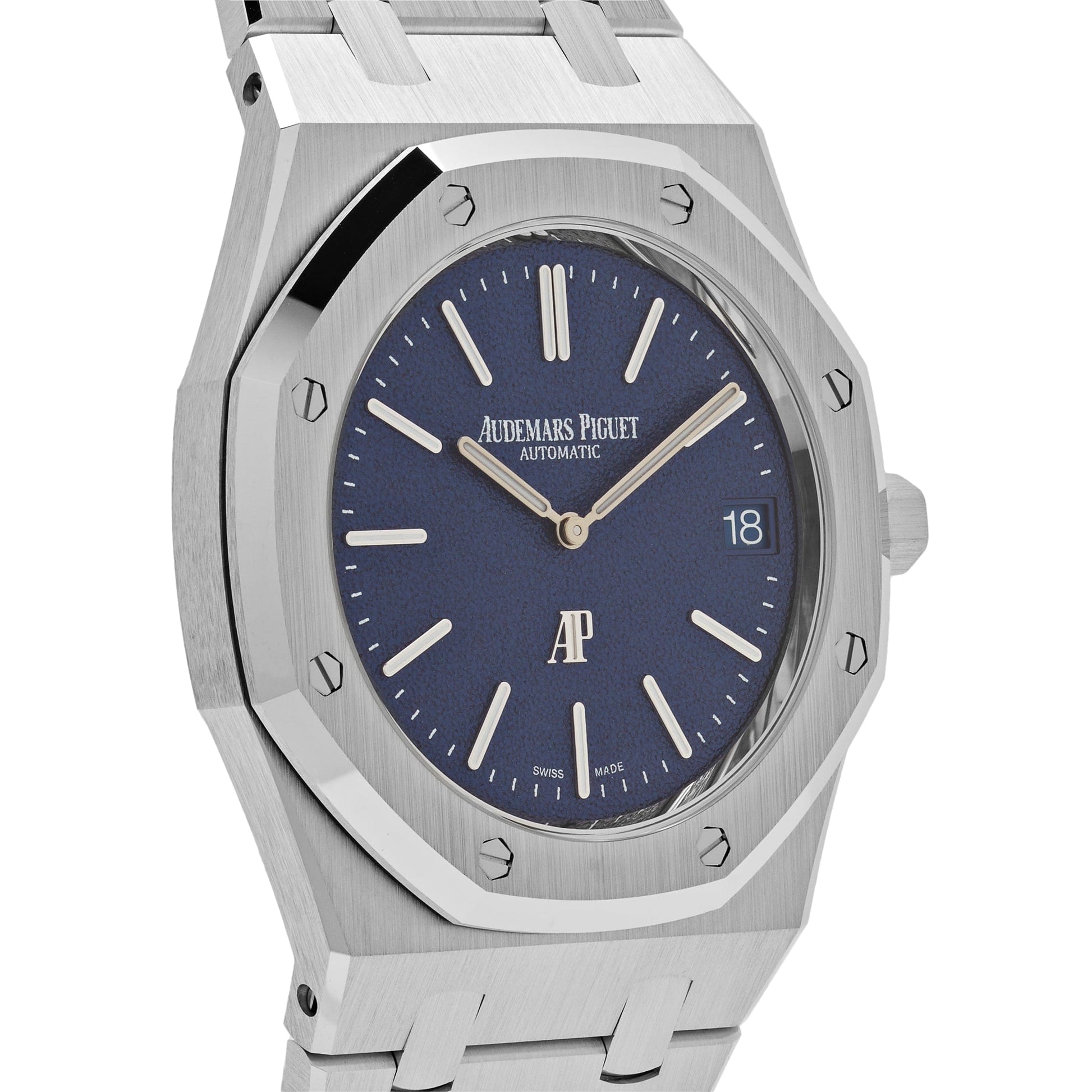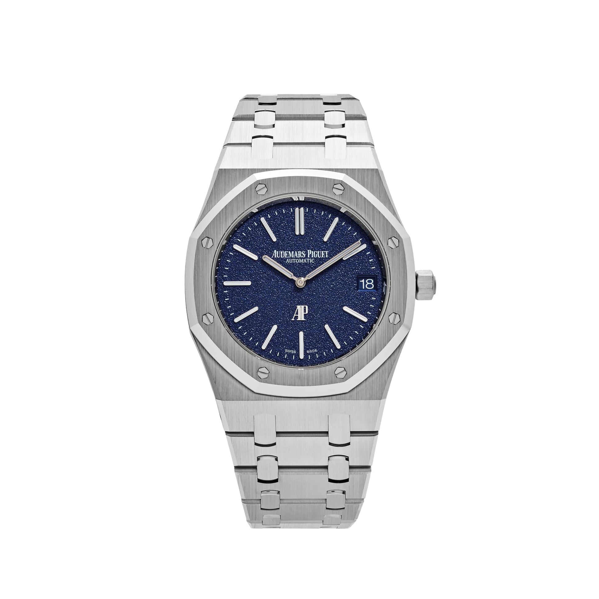 The Audemars Piguet Royal Oak 'Jumbo' Extra-Thin 16202BC.OO.1240BC.02 is designed in a 39mm white gold case and styled on a white gold bracelet. It sports a new grainy blue dial with a date display at 3 o'clock, protected by sapphire crystal.