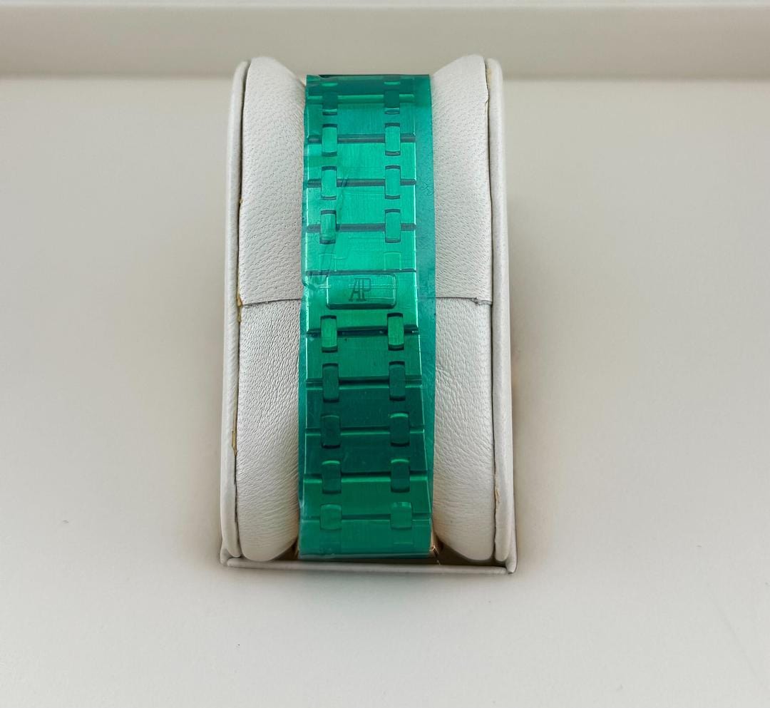 The Audemars Piguet Royal Oak Chronograph 25960OR.OO.1185OR.01 is a masterpiece that seamlessly merges timeless design with practical functionality. Crafted in 18k rose gold, the 39mm case showcases the Royal Oak's iconic octagonal bezel, secured by eight hexagonal screws. The integrated rose gold bracelet, known for its impeccable craftsmanship, features Audemars Piguet's signature blend of brushed and polished finishes, delivering a sophisticated and cohesive design.