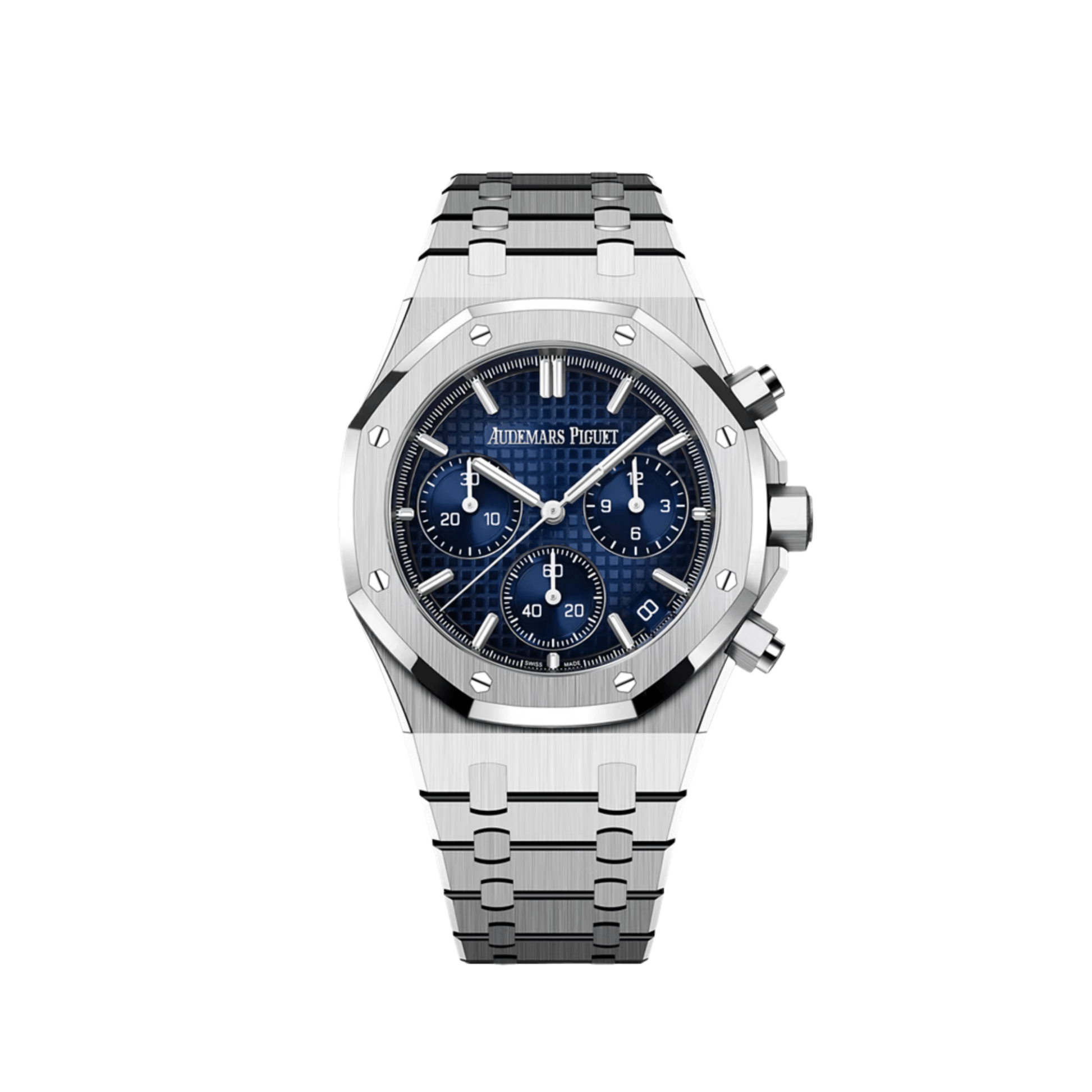 The standout feature is its smoked blue “Grande Tapisserie” dial, fading from a vibrant electric blue at the center to deep navy at the edges. This eye-catching gradient is paired with white gold applied hour markers and Royal Oak hands filled with luminescent material for readability. Three snailed blue chronograph counters offer functional balance and contrast without disrupting the harmony of the dial. Inside, the watch is powered by the selfwinding Caliber 4401, featuring an integrated column-wheel chronograph, flyback function, and 70-hour power reserve. The 26240BC.OO.1320BC.04 is a luxurious yet contemporary take on the Royal Oak chronograph—crafted for collectors who appreciate technical sophistication paired with vibrant, modern design.