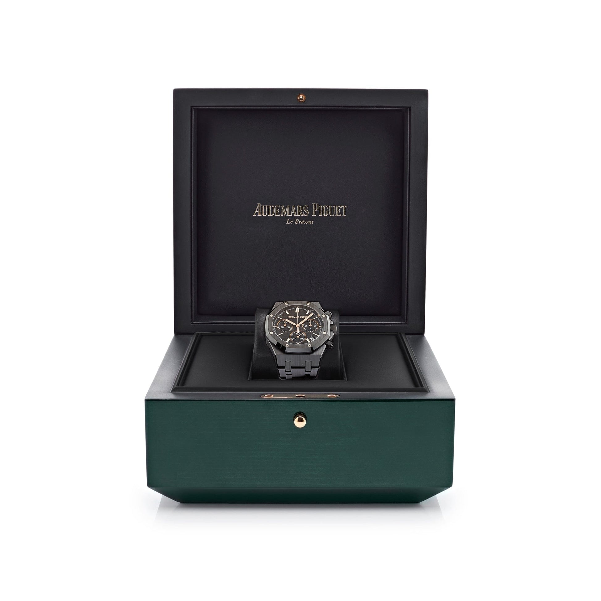This 41 mm Royal Oak Selfwinding Chronograph, entirely crafted from black ceramic and accented with refined rose gold details, features the collection’s latest design evolution and a special "50-years" anniversary oscillating weight. Luminescent rose gold hand and hour markers work with the Sapphire glare-proofed crystal for optimal legibility in any condition. An exhibition case back gives a glimpse at the Calibre 4401 in action, powering all of the watch's complications, including chronograph timekeeping and date features.