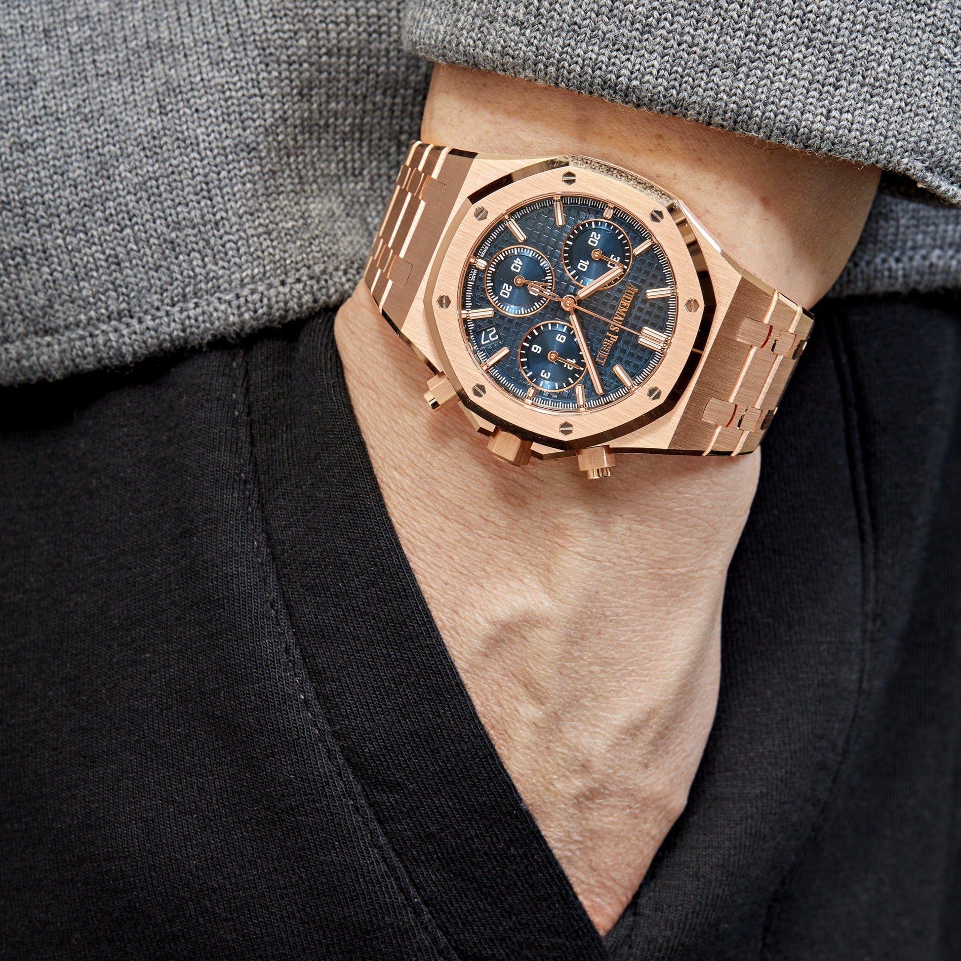 Introducing the Audemars Piguet Royal Oak Selfwinding Chronograph 26240OR.OO.1320OR.01. The 41mm case is made of 18k rose gold and complements the Grande Tapisserie dial in Blue. Luminescent rose gold hand and hour markers work with the Sapphire glare-proofed crystal for optimal legibility in any condition. An exhibition case back gives a glimpse at the Calibre 4401 in action, powering all of the watch's complications, including Flyback chronograph timekeeping and date features.