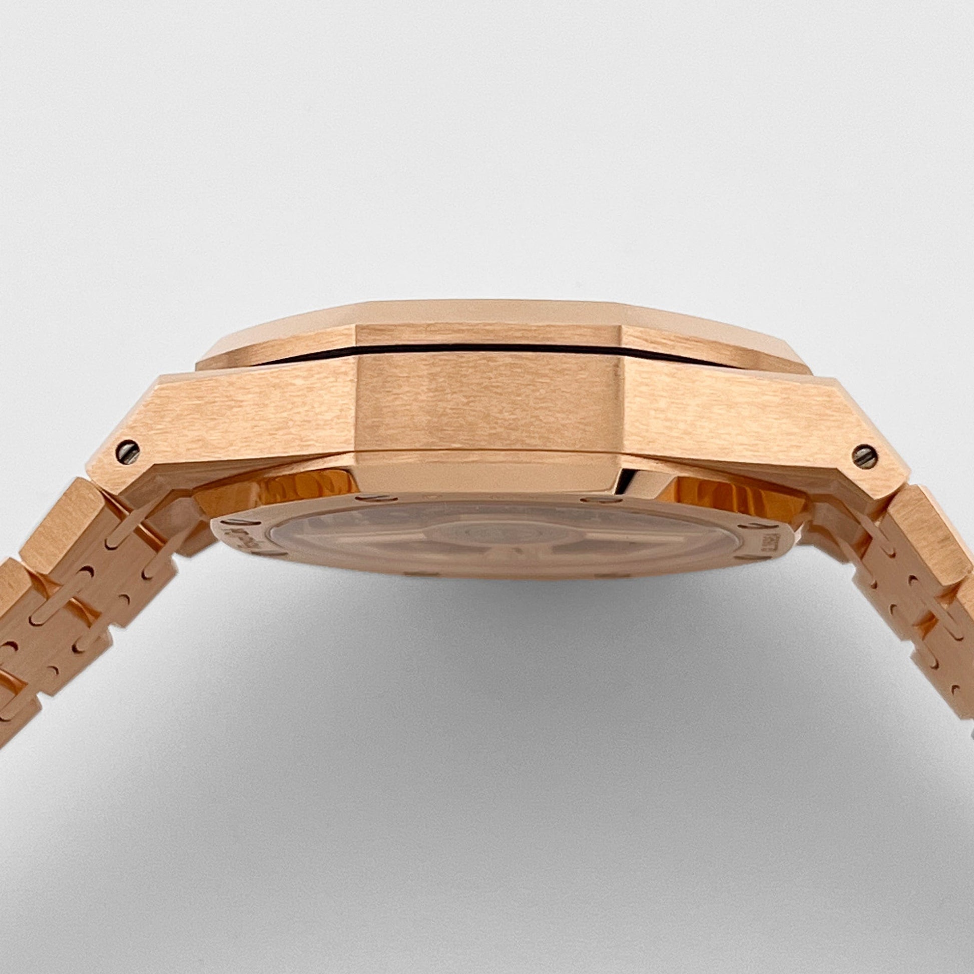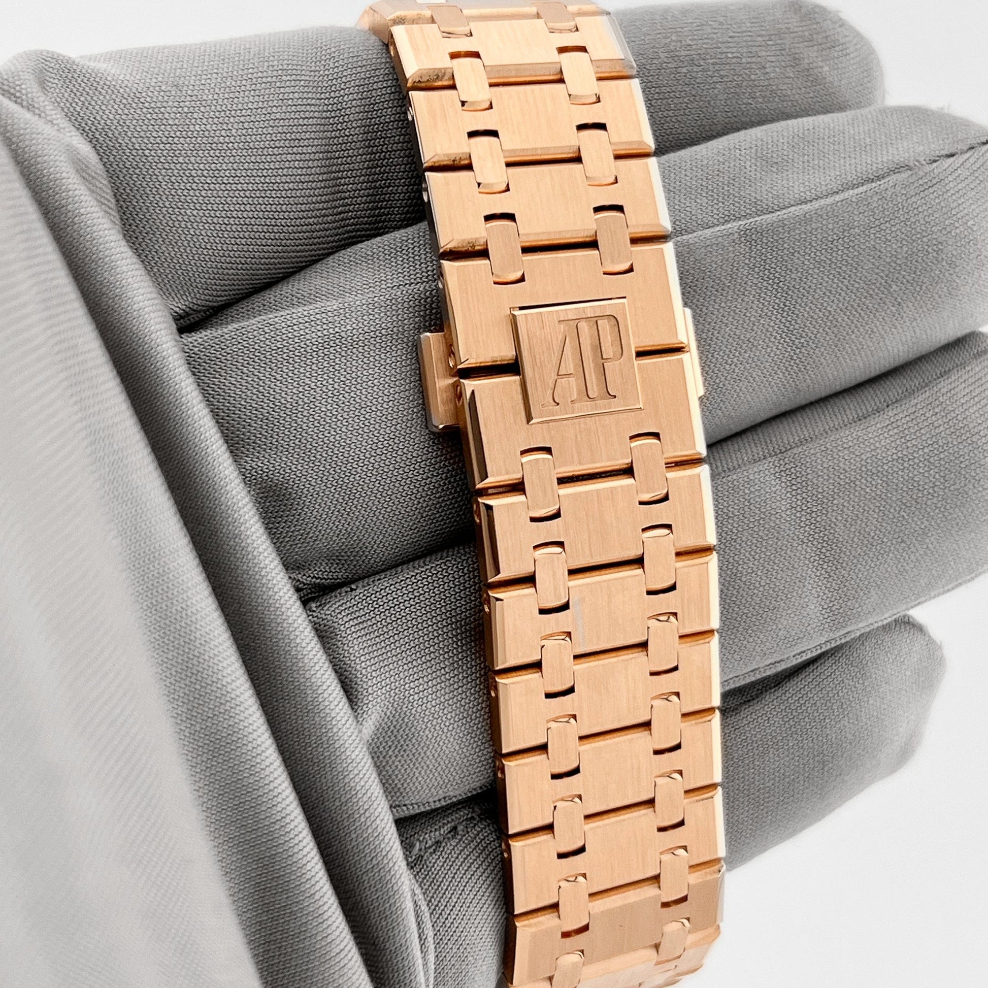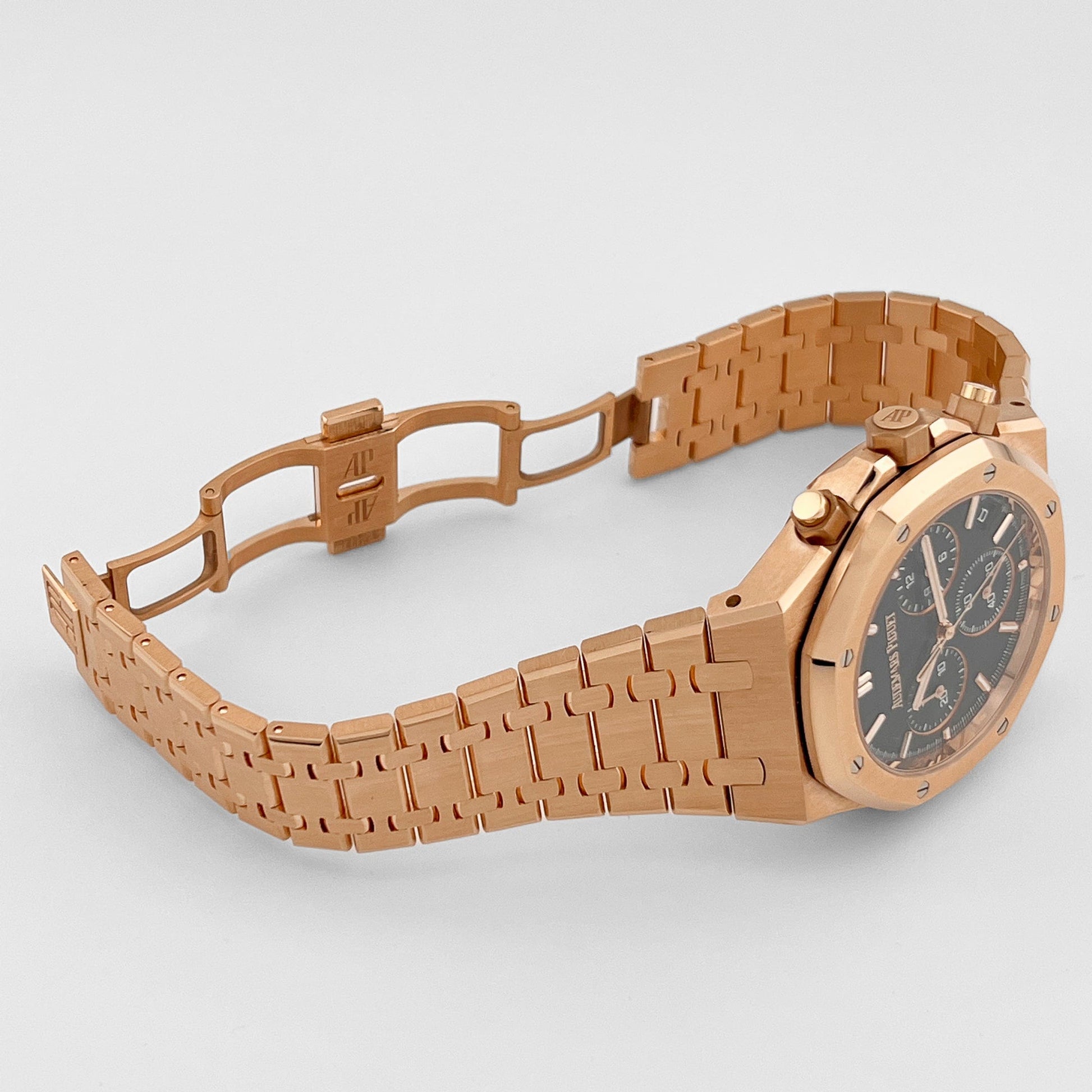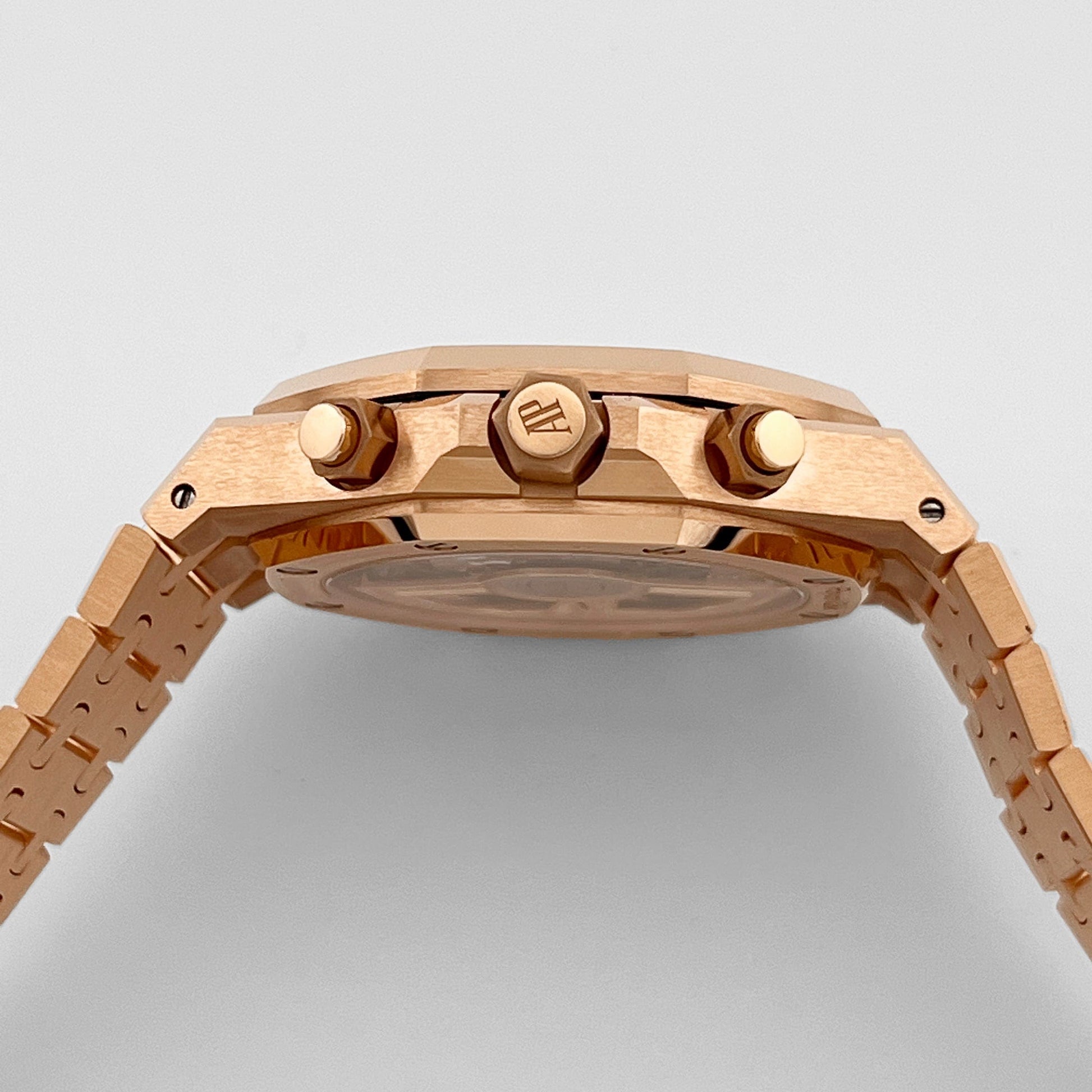 Introducing the Audemars Piguet Royal Oak Selfwinding Chronograph 26240OR.OO.1320OR.05. The 41mm case is made of 18k rose gold and complements the Grande Tapisseriedial in Blue. Luminescent rose gold hand and hour markers work with the Sapphire glare-proofed crystal for optimal legibility in any condition. An exhibition case back gives a glimpse at the Calibre 4401 in action, powering all of the watch's complications, including Flyback chronograph timekeeping and date features.