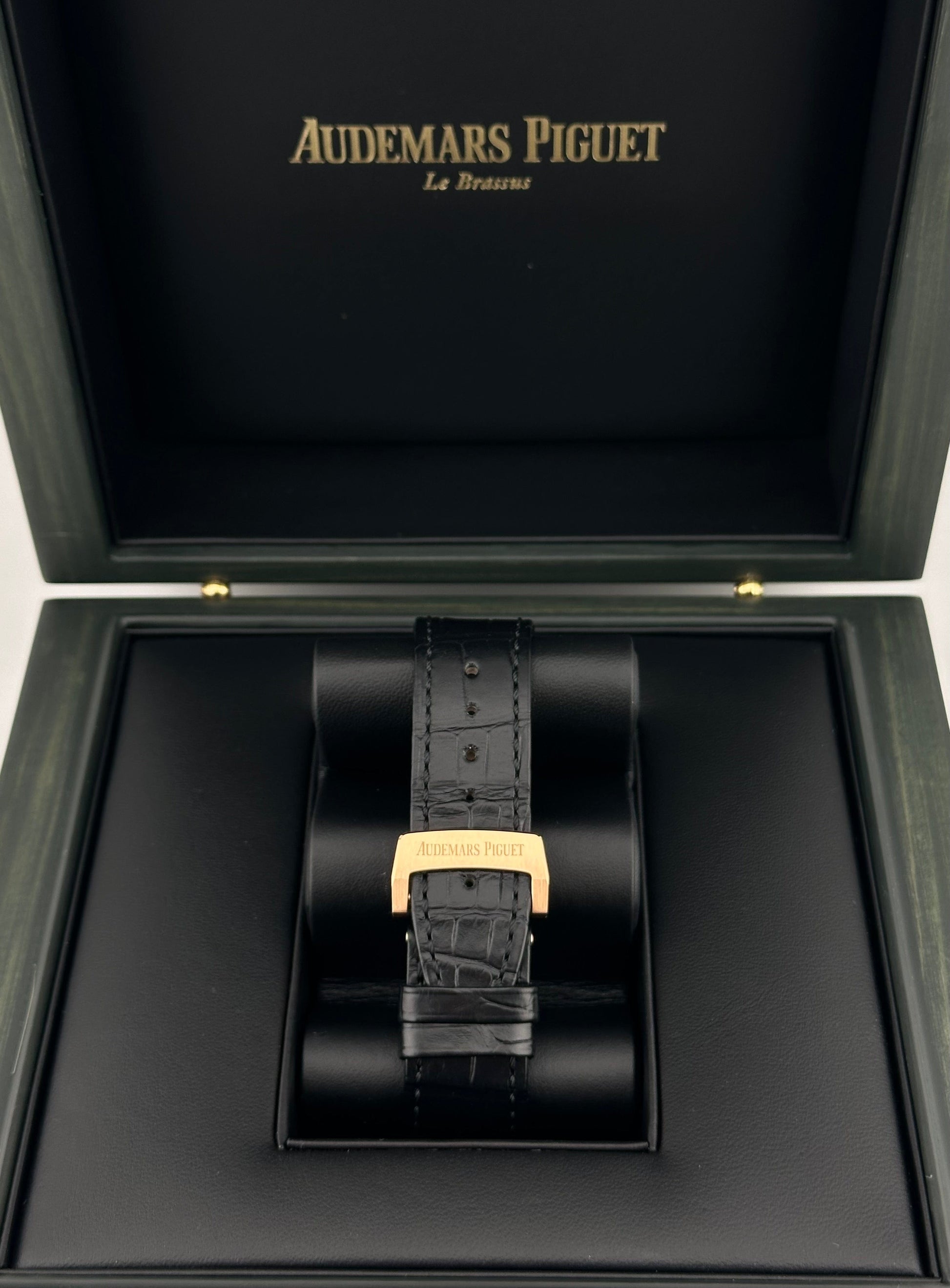 The Royal Oak Selfwinding Chronograph is designed with an 18-carat rose gold case measuring 41mm and includes the new Royal Oak design advancement. It has a black dial with a "Grande Tapisserie" pattern, rose gold applied hour-markers and Royal Oak hands with luminescent coating, and hosts a date window at 3 o'clock. The watch comes on a black alligator strap with an 18-carat rose gold AP folding clasp.