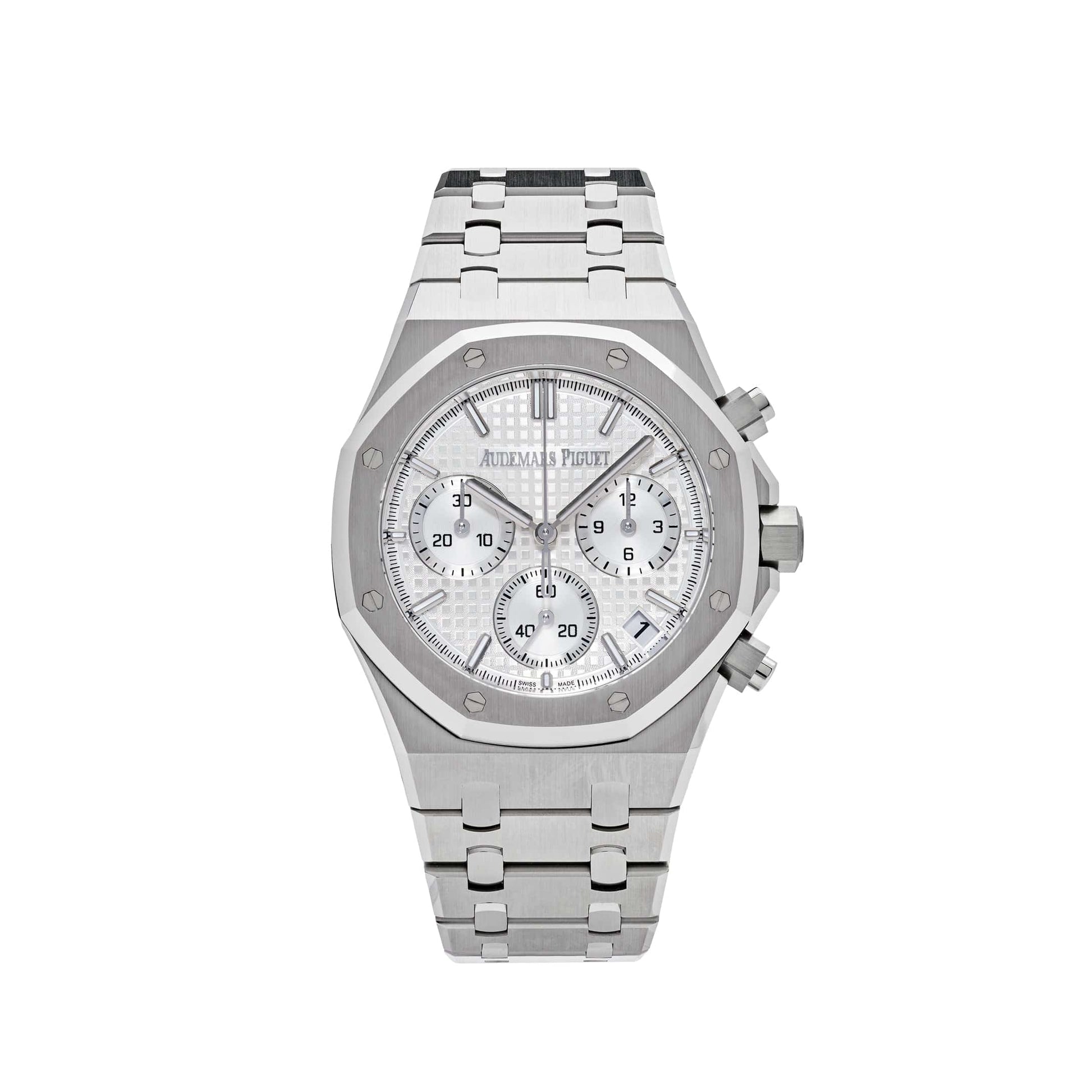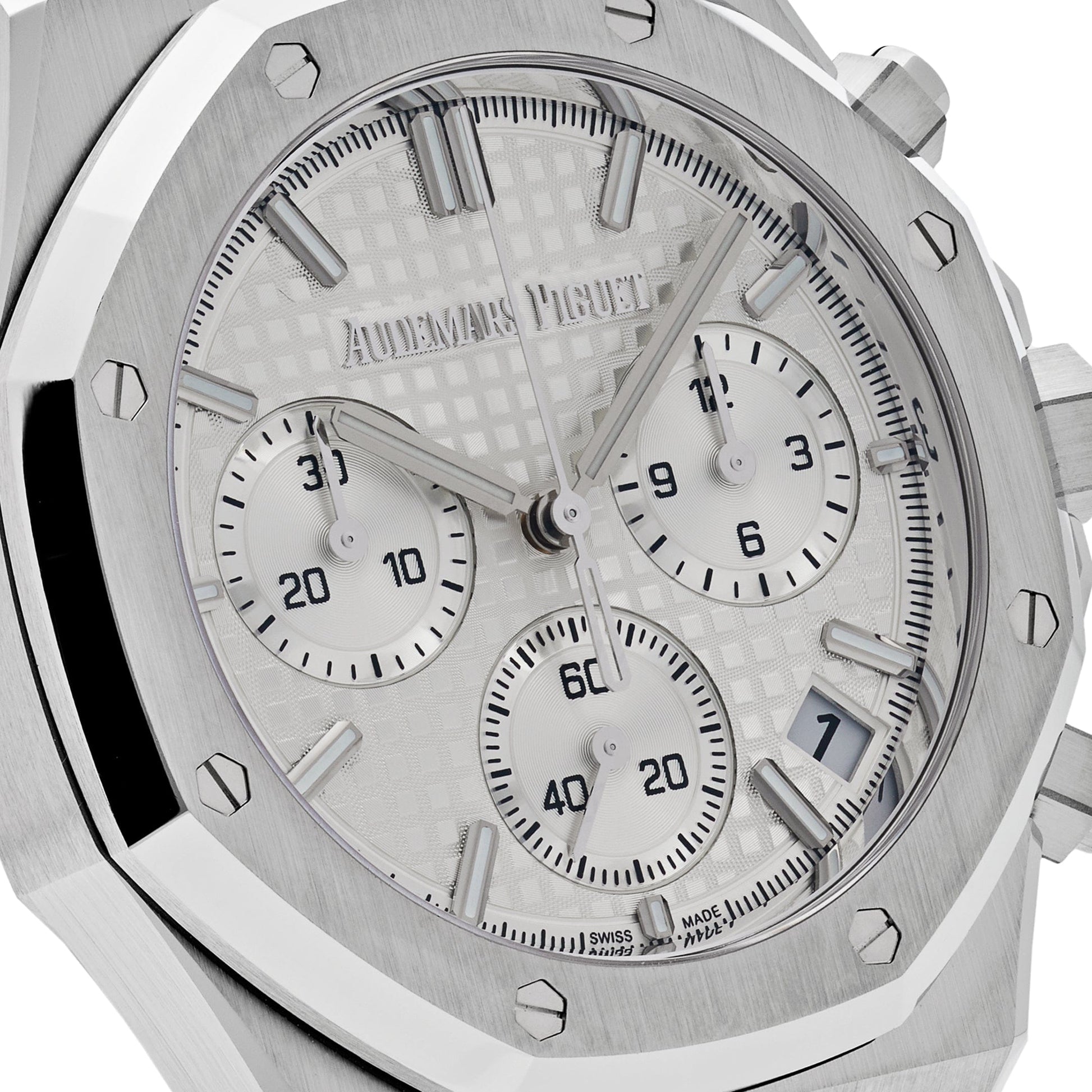 This Royal Oak Selfwinding Chronograph celebrates the "50th Anniversary", fitted with the “50-years” oscillating weight. The white, silver-toned dial features the 'Grand Tapisserie' pattern, silver-toned counters, white gold applied hour-markers and Royal Oak hands with luminescent coating. The watch comes on a stainless steel bracelet with AP folding clasp.