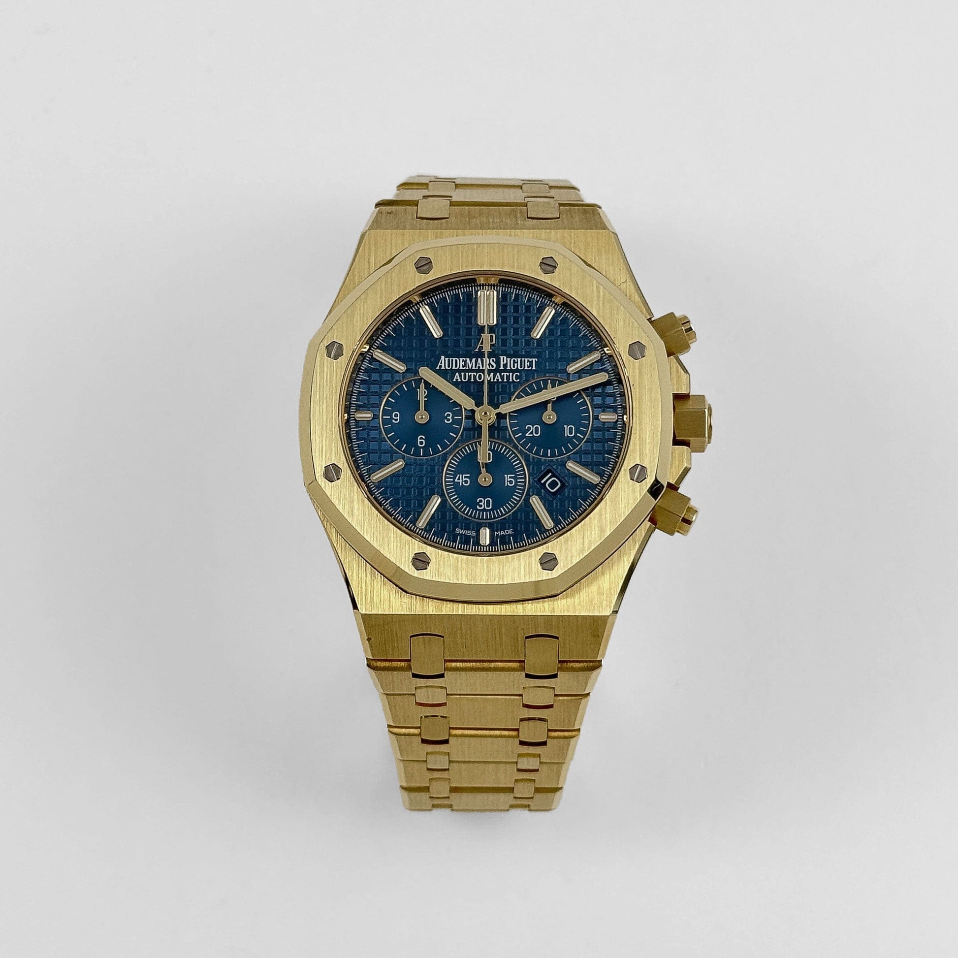 The Audemars Piguet Royal Oak Chronograph energizes the original Gerald Genta Design from the early 70's. The watch features a 41mm 18-carat yellow gold case, glare-proofed sapphire crystal, and screw-locked crown. The blue dial has the Grande Tapisserie pattern, yellow gold applied hour-markers and Royal Oak hands with luminescent coating. This watch comes on an 18-carat yellow gold bracelet with a AP folding clasp.