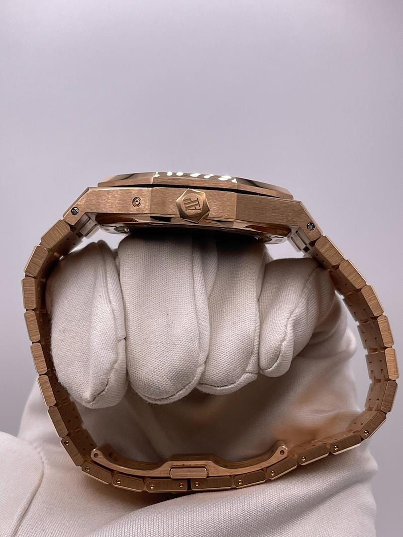 Crafted in 18k rose gold, the 42mm case features the signature Royal Oak octagonal bezel with a combination of brushed and polished finishes. The anthracite-grey Grande Tapisserie dial is accented by rose gold applied hour markers and Royal Oak hands with luminescent coating. The dial showcases the perpetual calendar functions, including day, date, month, moon phase, and leap year, alongside the rare equation of time complication, which calculates the difference between solar and mean time.