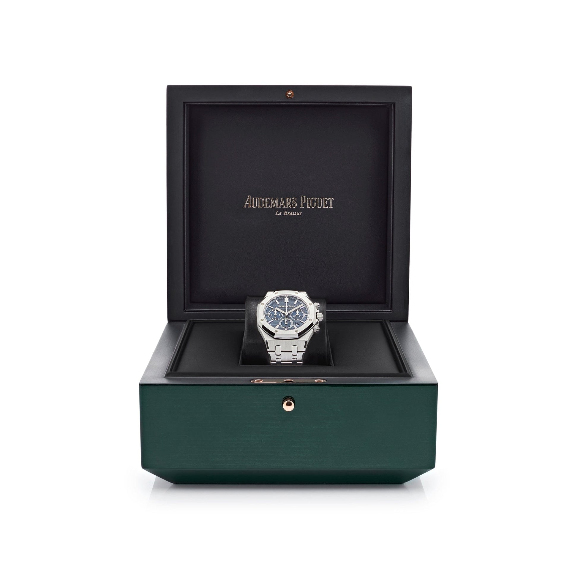 The deep blue Grande Tapisserie dial is the centerpiece, offering a rich texture that plays beautifully with light. Contrasting silver subdials at 3, 6, and 9 o’clock enhance the chronograph’s practicality while maintaining a balanced layout. White gold applied hour markers and luminescent-coated hands ensure excellent legibility. Powered by a selfwinding chronograph movement, this timepiece delivers both precision and style. Paired with an integrated stainless steel bracelet, this Royal Oak chronograph is an ideal choice for collectors seeking a versatile and sophisticated addition to their collection.