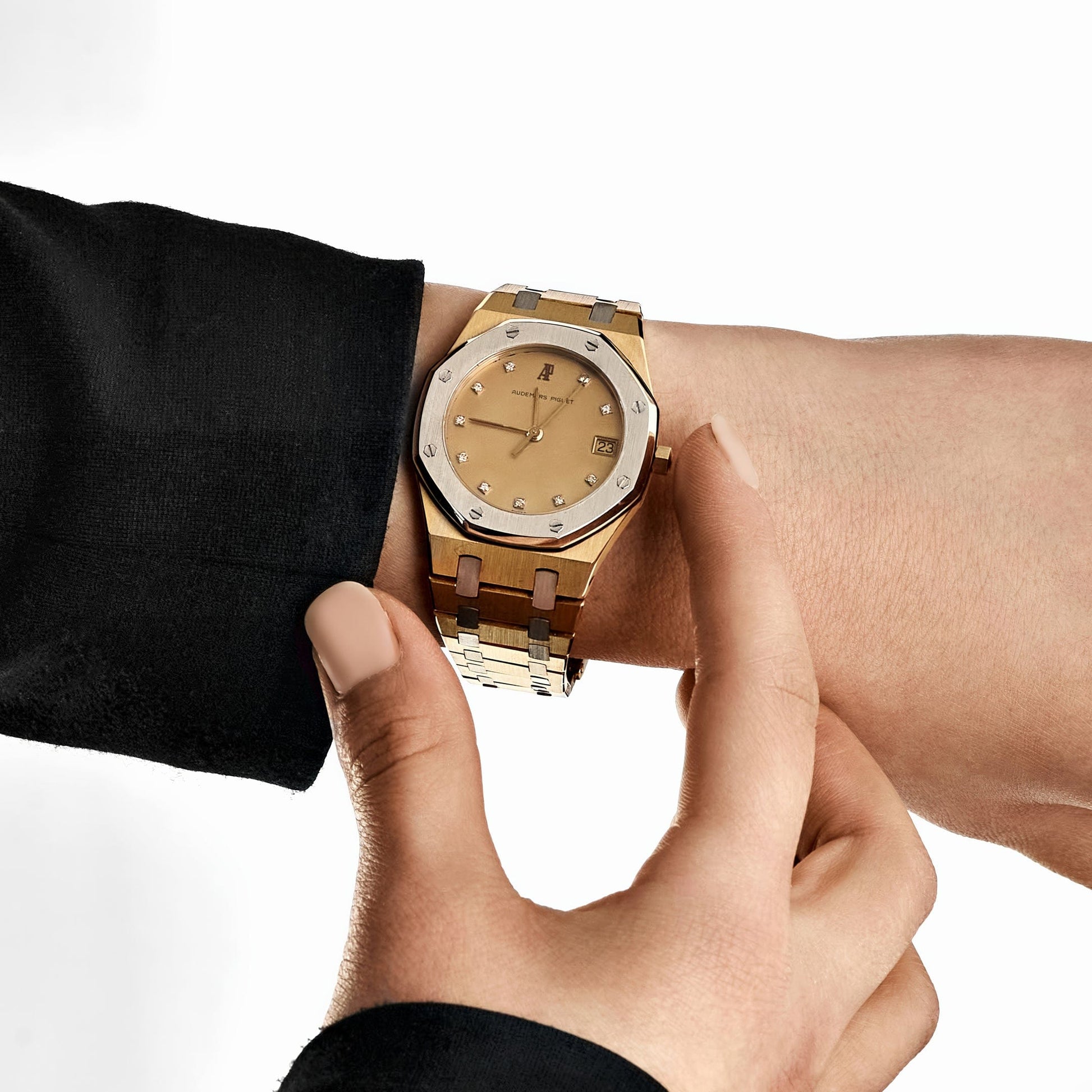 The Audemars Piguet Royal Oak 6023AC is a stunning vintage model that exemplifies the brand’s signature blend of luxury and bold design. Crafted in 18k yellow gold and white gold, the watch’s iconic octagonal bezel in white gold is paired with a diamond-set dial, offering a brilliant contrast that exudes elegance and sophistication.