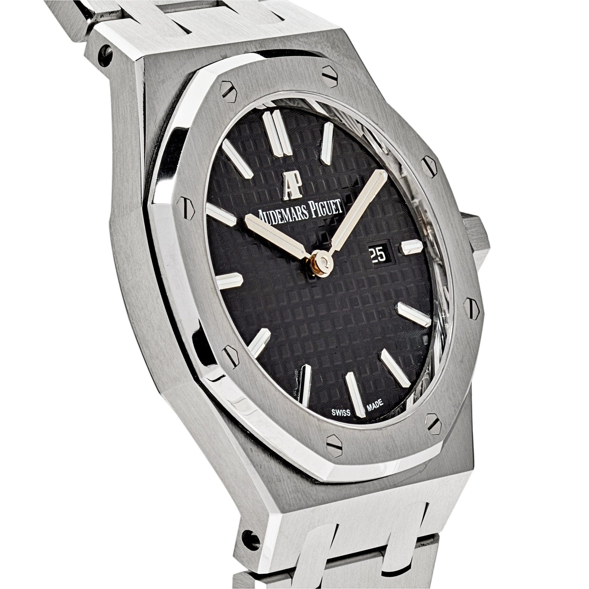 This Audemars Piguet Royal Oak 'Ladies' Quartz powered watch is crafted in a 33mm stainless steel case and styled on a matching steel bracelet with the AP folding clasp. The black 'Grande Tapisserie' patterned dial hosts timekeeping capabilities and a date window at 3 o'clock. Considered a ladies watch due to the humble case size, this simple yet elegant timepiece is a casually sophisticated addition to your collection.