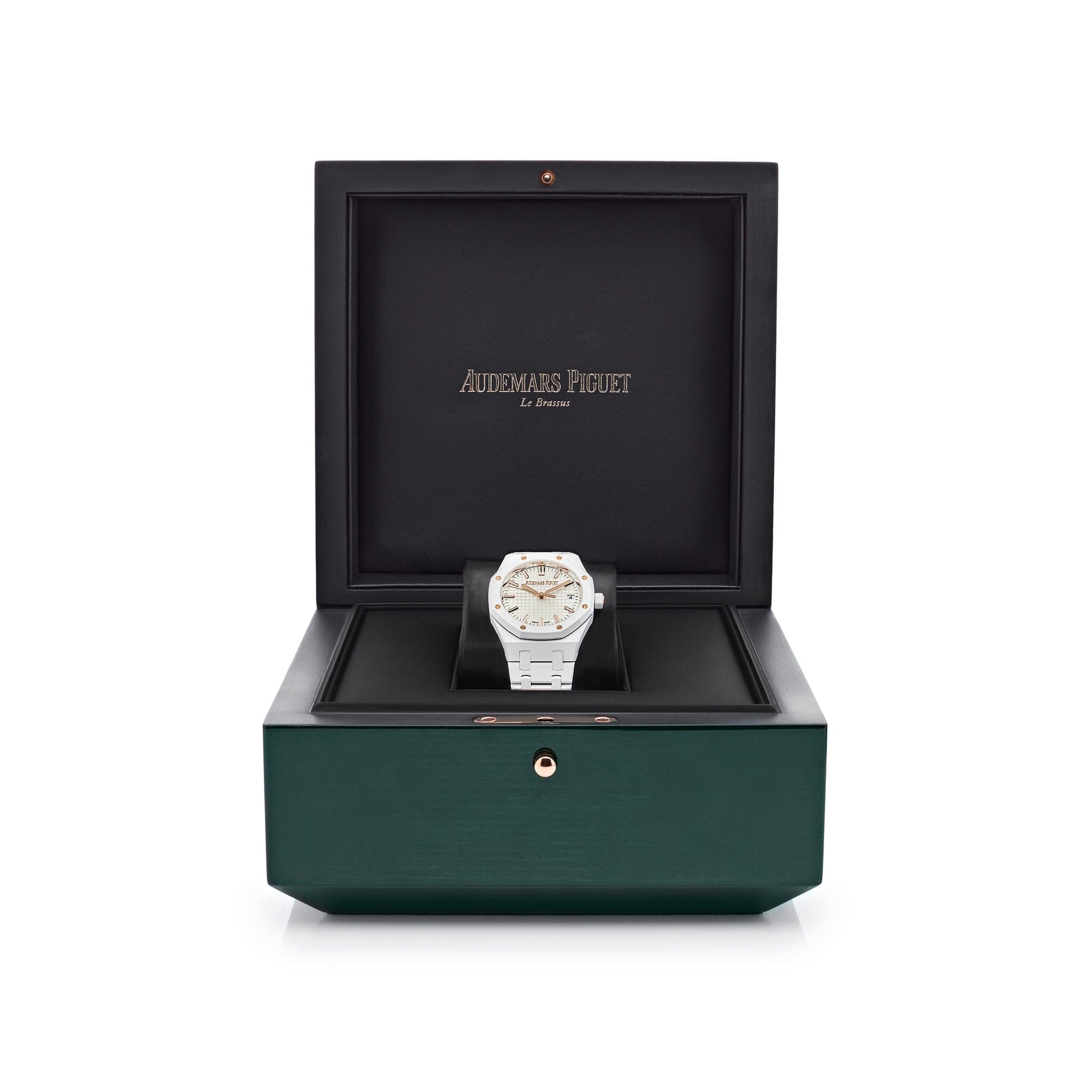 The introduction of the first white ceramic into this 34mm Audemars Piguet Royal Oak 77350CB.OO.1266CB.01 , along with the addition of a silver-toned "Grande Tapisserie" dial and rose gold accent, adds a touch of glamour to this iconic timepiece. It comes on a white ceramic bracelet with an AP double folding clasp.