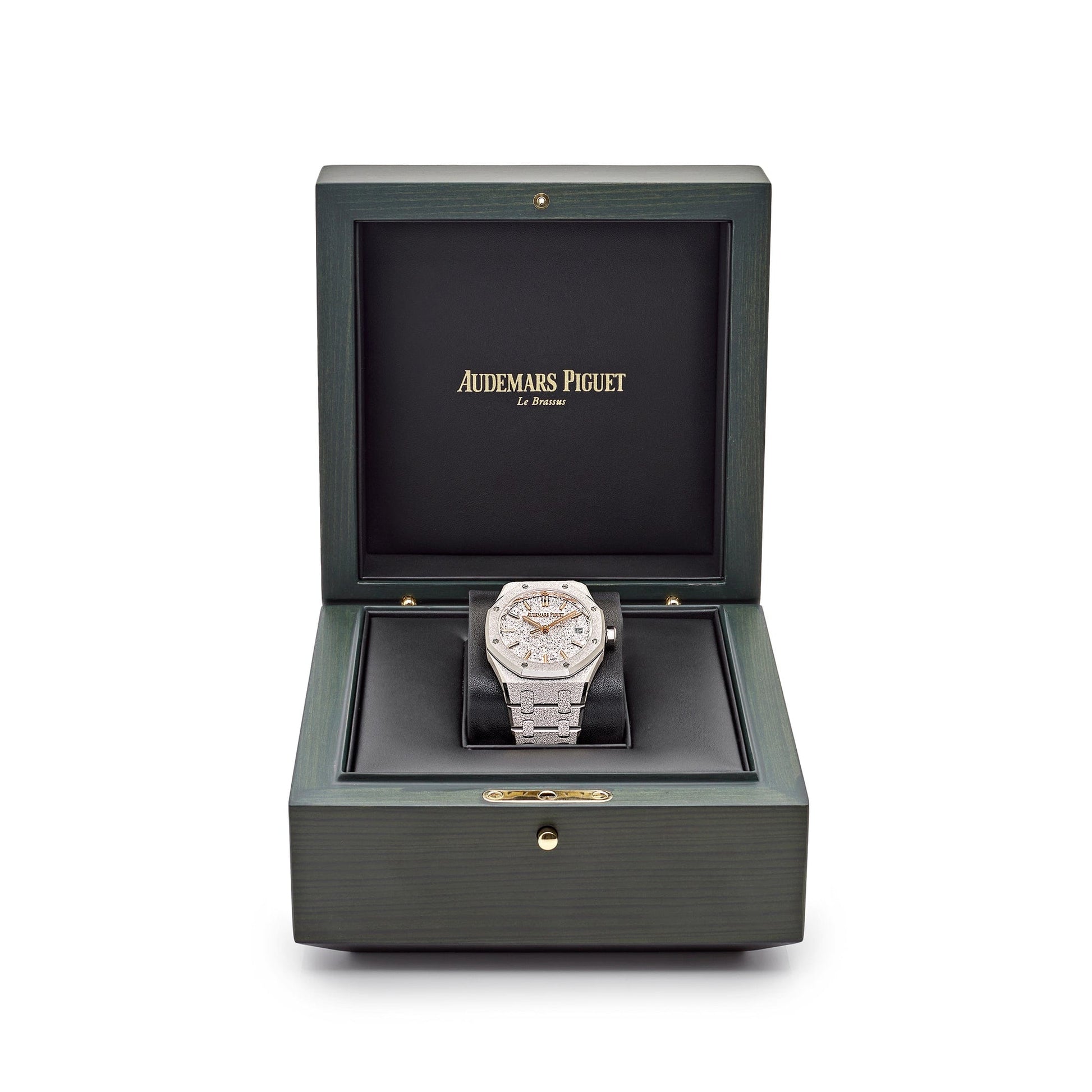 The Audemars Piguet Royal Oak 77450BC.GG.1361BC.01 is a captivating timepiece that combines the brand’s signature design with exceptional craftsmanship and unique materials. The 34mm case is crafted from frosted white gold, a hallmark finishing technique developed in collaboration with Florentine jewelry designer Carolina Bucci. This striking texture reflects light in a subtle yet dazzling way, giving the iconic Royal Oak case a fresh, contemporary edge.