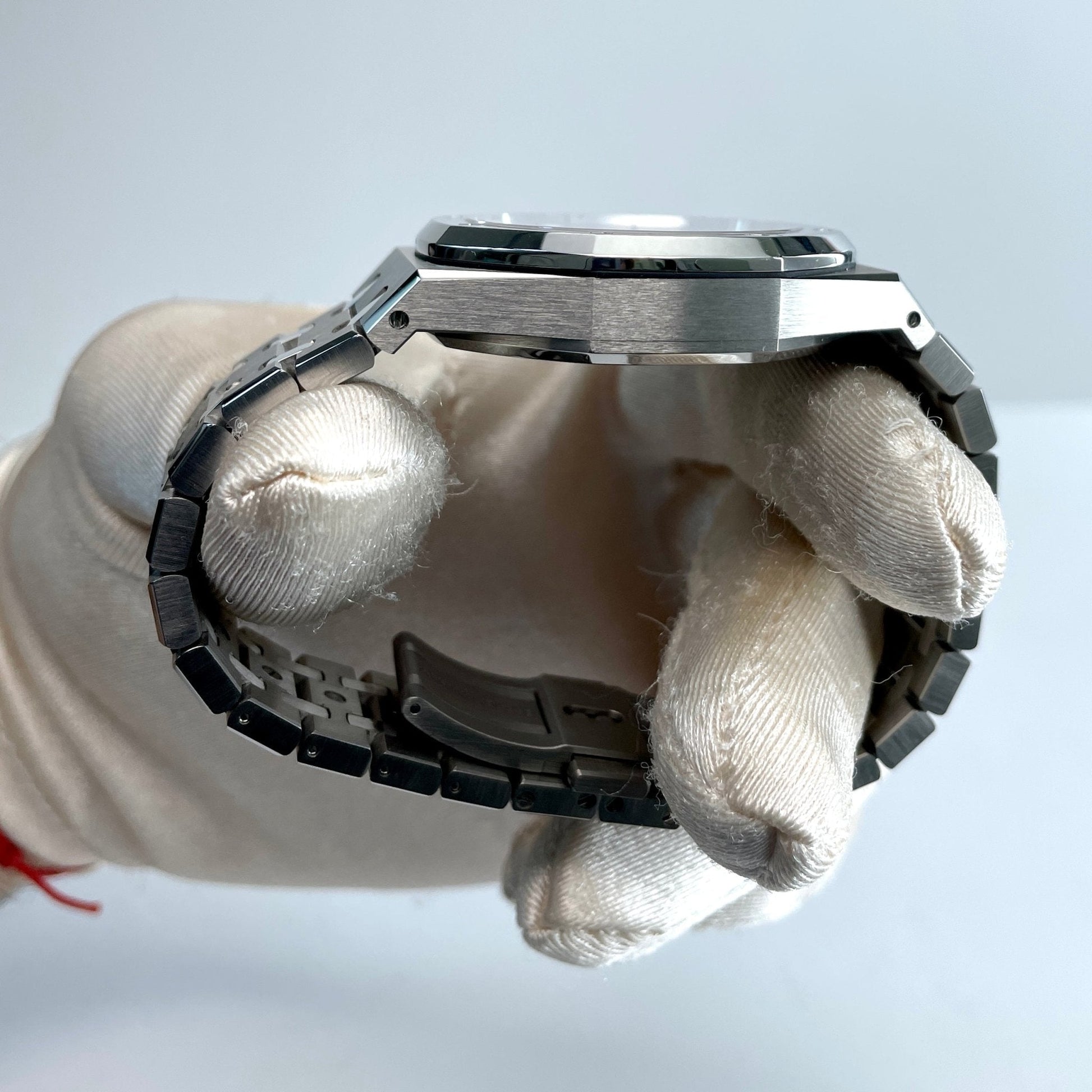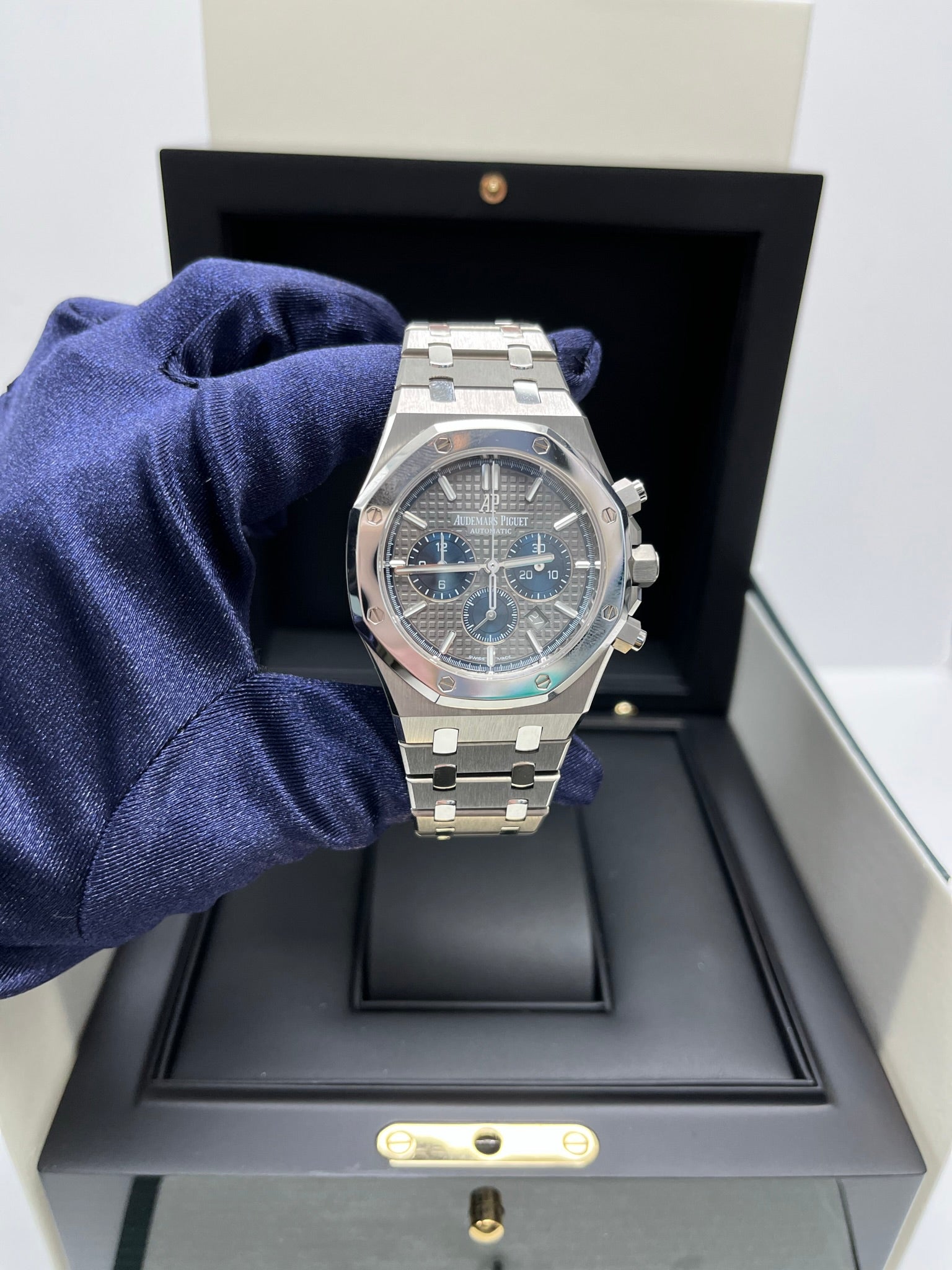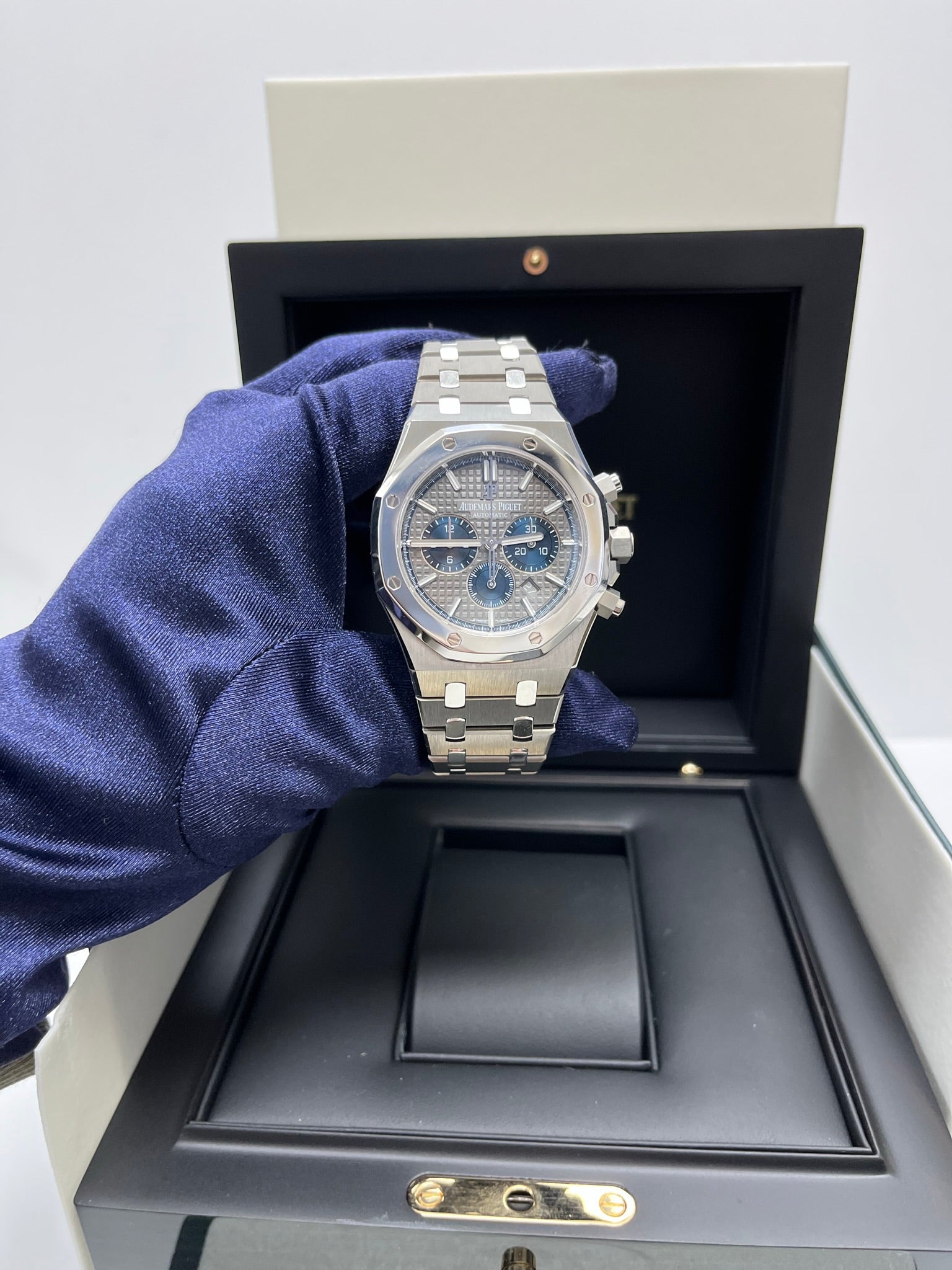 Audemars Piguet Royal Oak Chronograph 41mm Mens Watch 26331IP.OO.1220IP.01. Titanium case, glareproofed sapphire crystal, polished 950 platinum bezel and links, screw-locked crown. 41 mm case width. Water Resistance 50 m. Case thickness 11mm. Slate grey dial with “Grande Tapisserie” pattern, blue counters, white gold applied hour-markers and Royal Oak hands with luminescent coating.Titanium bracelet with polished 950 platinum links and titanium AP folding clasp.