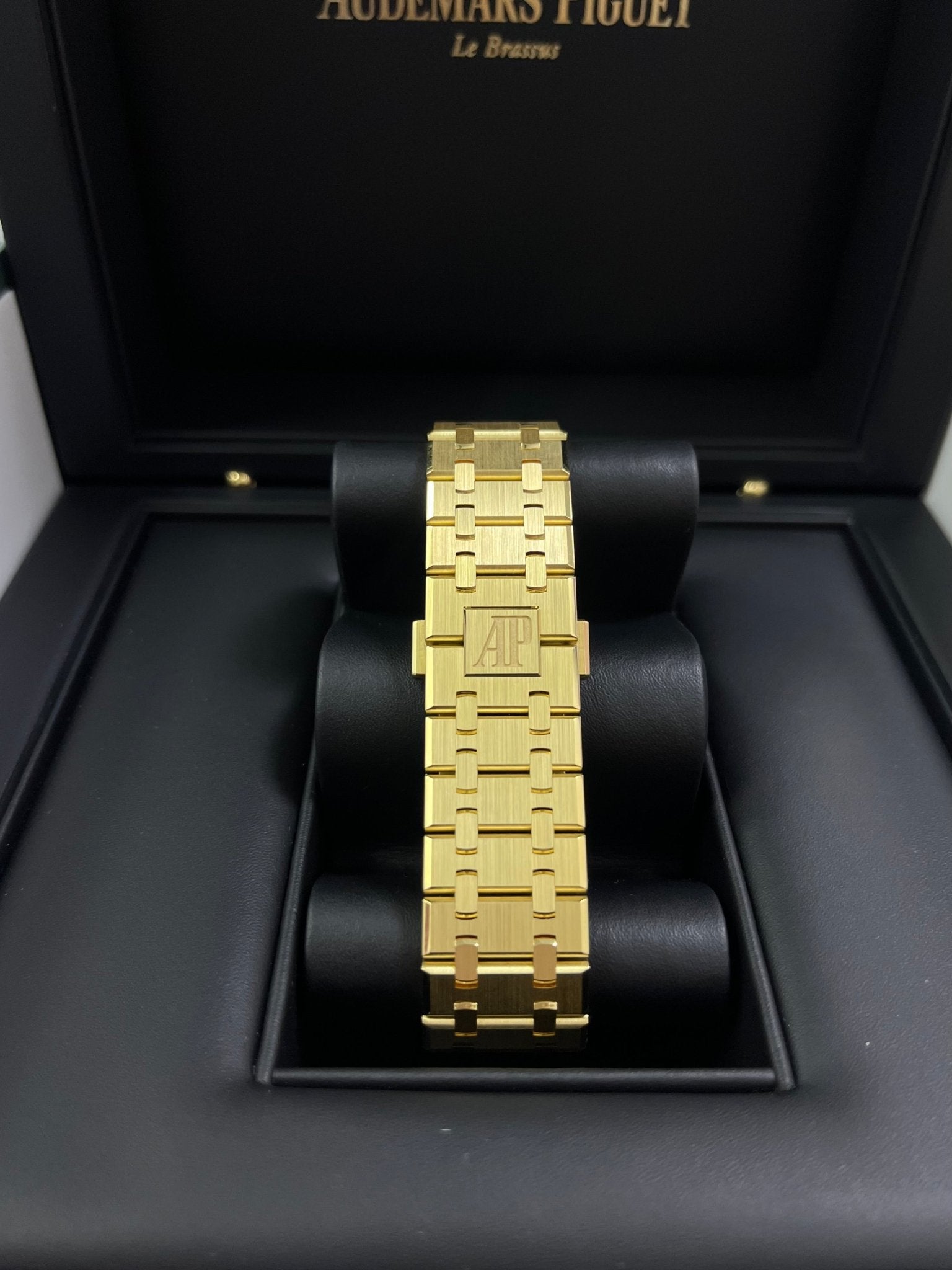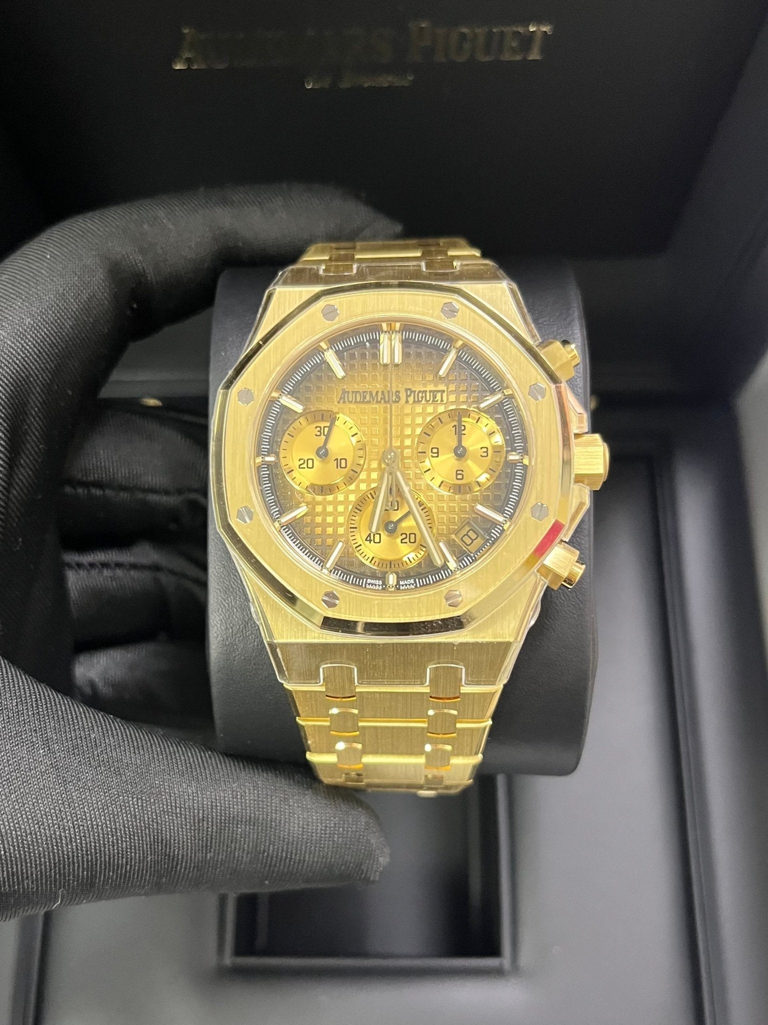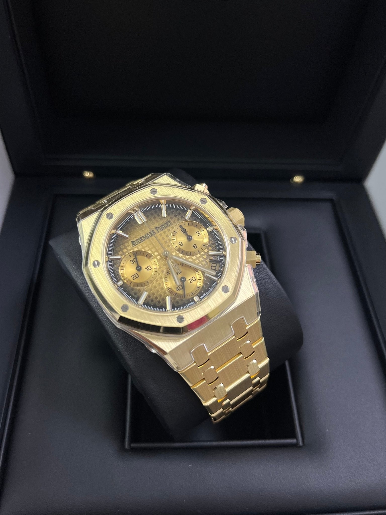 | For the first time, the 41 mm Royal Oak Selfwinding Chronograph pairs a yellow gold case and bracelet with a smoked yellow-gold-toned Grande Tapisserie dial for a powerful play of light. 18-carat yellow gold case, glareproofed sapphire crystal and caseback. Smoked yellow gold-toned dial with “Grande Tapisserie” pattern, yellow gold applied hour-markers and Royal Oak hands with luminescent coating. |
