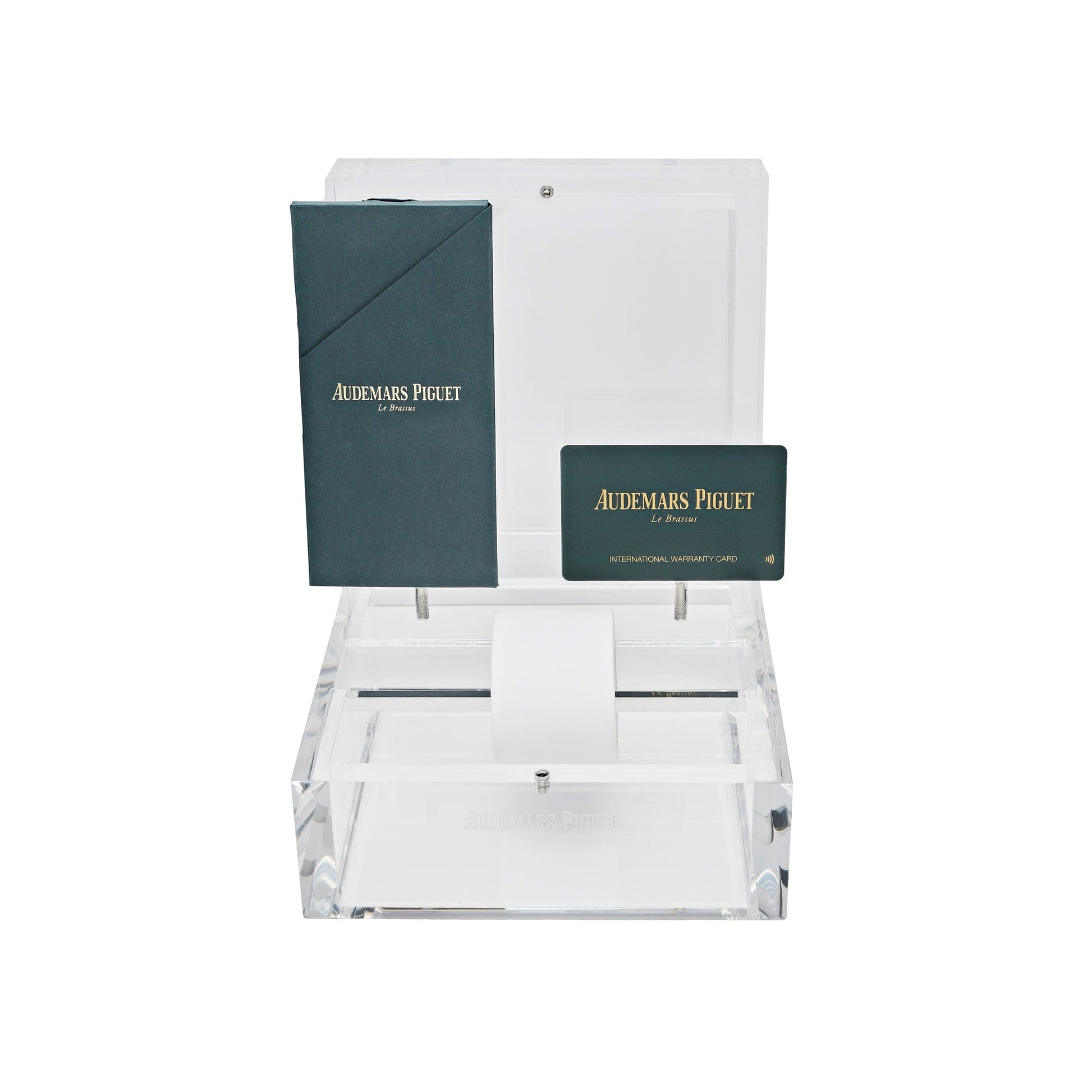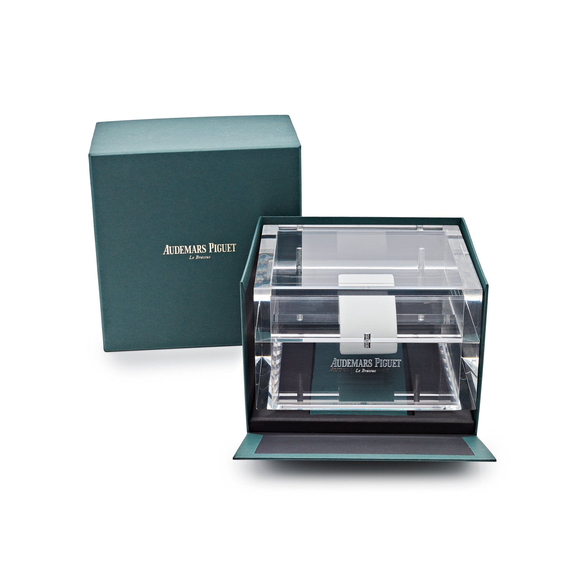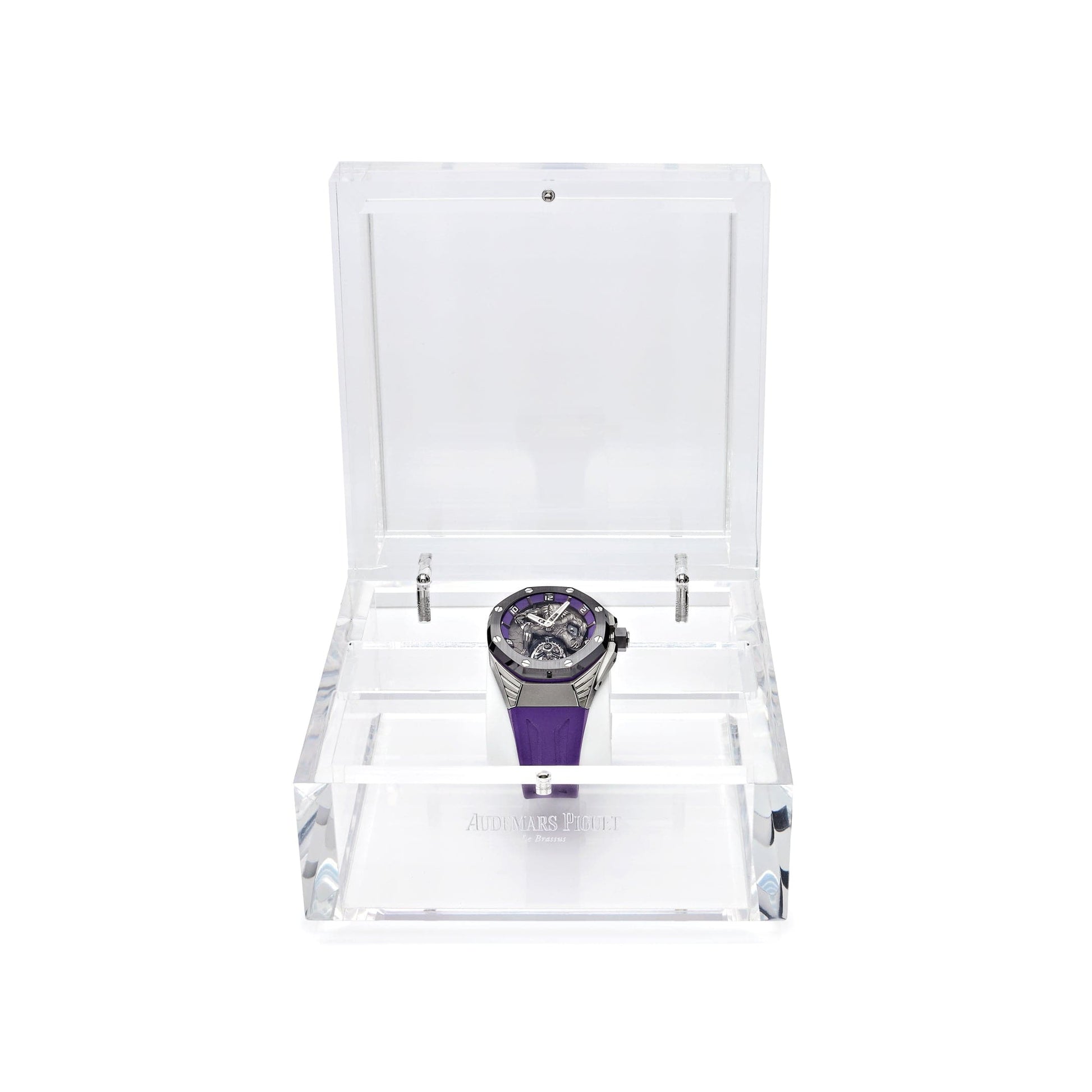 The futuristic style of this limited edition Audemars Piguet Royal Oak Concept Flying Tourbillon is inspired by Marvel's Black Panther's cutting-edge costume. The hand-painted 3D representation of the Super Hero is revealed when the sandblasted titanium casing with black ceramics is opened. It features a sandblasted titanium case with titanium inserts, glare-proofed sapphire crystal and caseback, and a black ceramic bezel and crown. The diameter measures 42mm and the dial has a hand-painted white gold 3D Black Panther character, a purple inner bezel, and white gold Royal Oak hands with luminescent coating. This timepiece comes on a purple rubber strap with a titanium AP folding clasp.