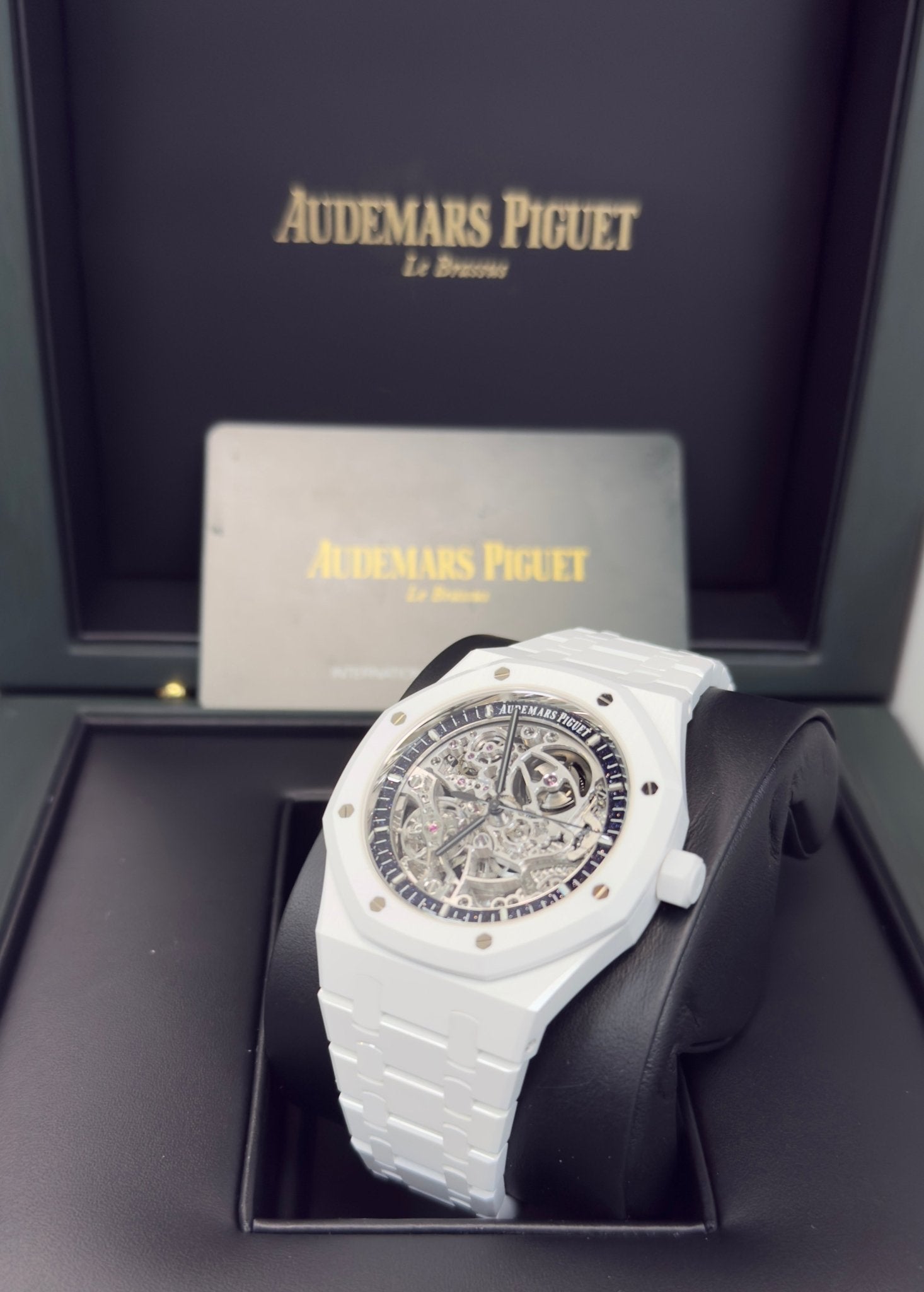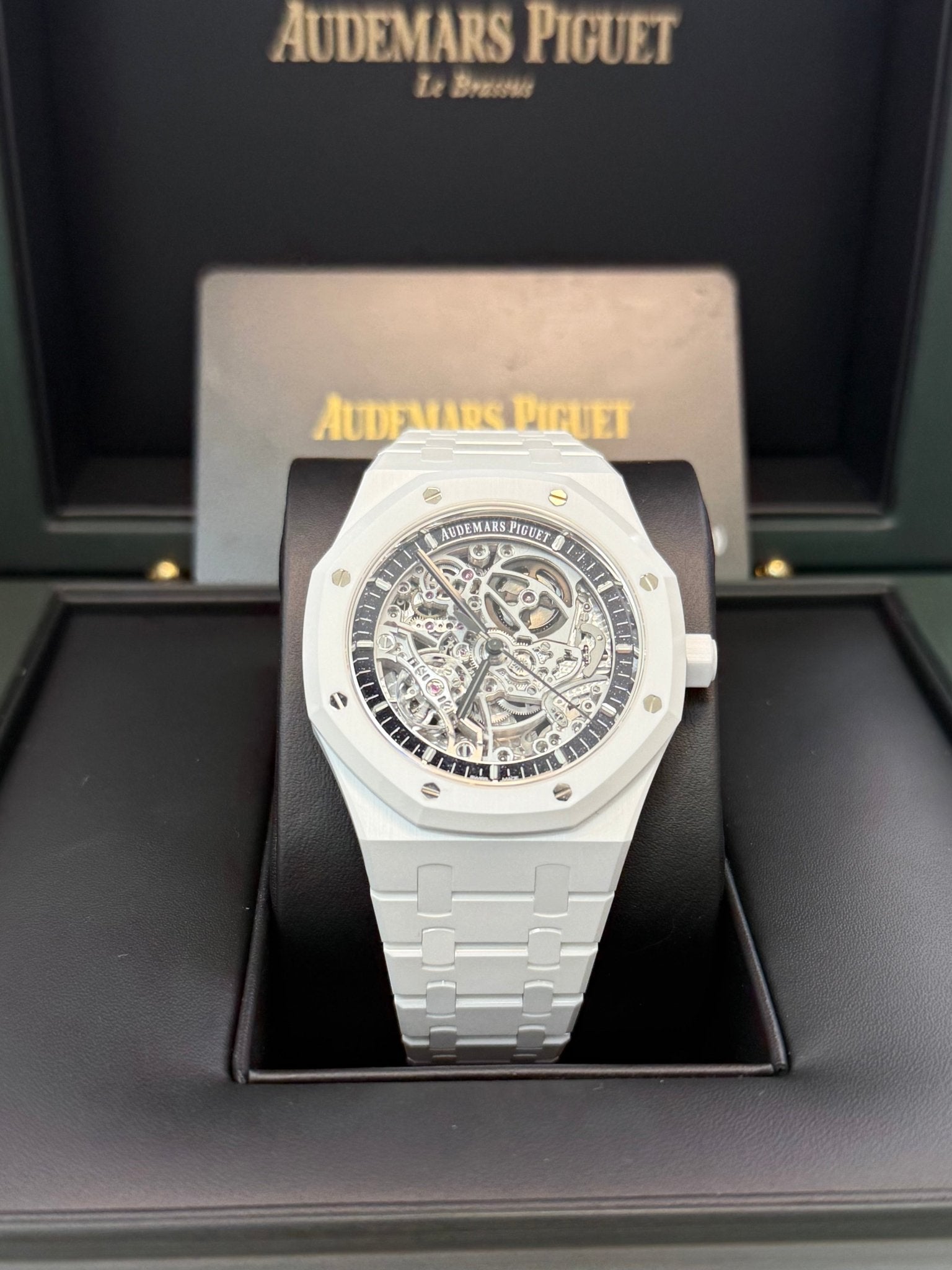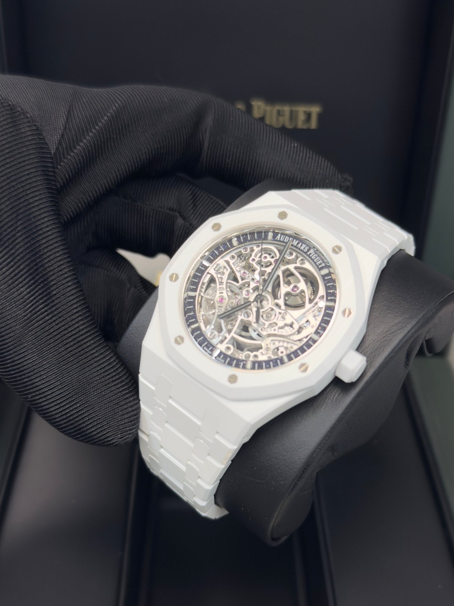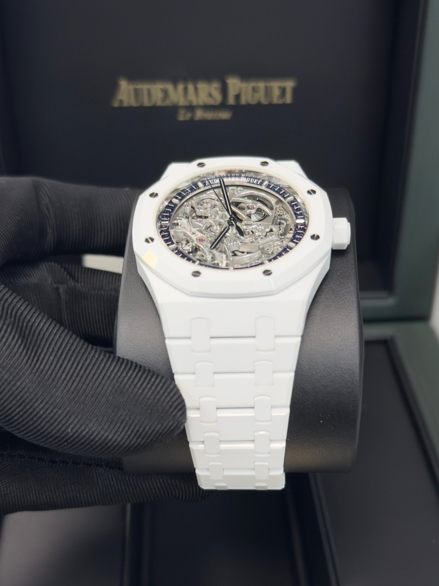 | The white ceramic case and bracelet are complemented by a blue aventurine inner bezel elegantly framing the rhodium-toned openworked movement. The blackened Royal Oak hands and white gold hour-markers further this timepiece’s contrasted aesthetic. White ceramic case, glareproofed sapphire crystal and caseback, screw-locked crown. Blue aventurine inner bezel, white gold applied hour-markers and black Royal Oak hands with luminescent coating. |