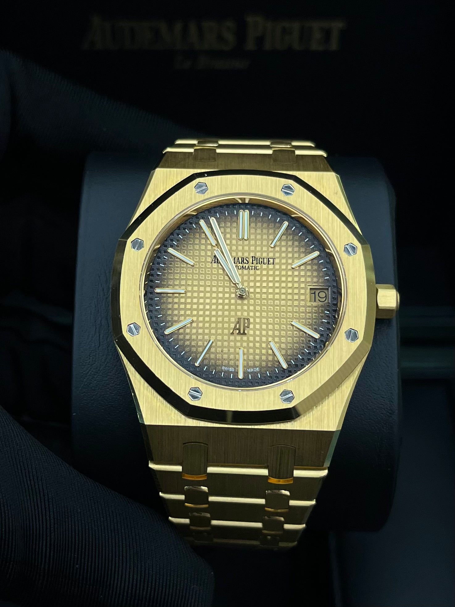 This “Jumbo” model accentuates the Royal Oak’s original codes with a yellow gold case and bracelet enhanced with a smoked yellow-gold-toned “Petite Tapisserie” dial. It houses the new selfwinding movement, Calibre 7121, and is fitted with the "50-years" oscillating weight which echoes the case colour. 18-carat yellow gold case, glareproofed sapphire crystal and caseback. Smoked yellow gold-toned dial with “Petite Tapisserie” pattern, yellow gold applied hour-markers and Royal Oak hands with luminescent coating.18-carat yellow gold bracelet with AP folding clasp.