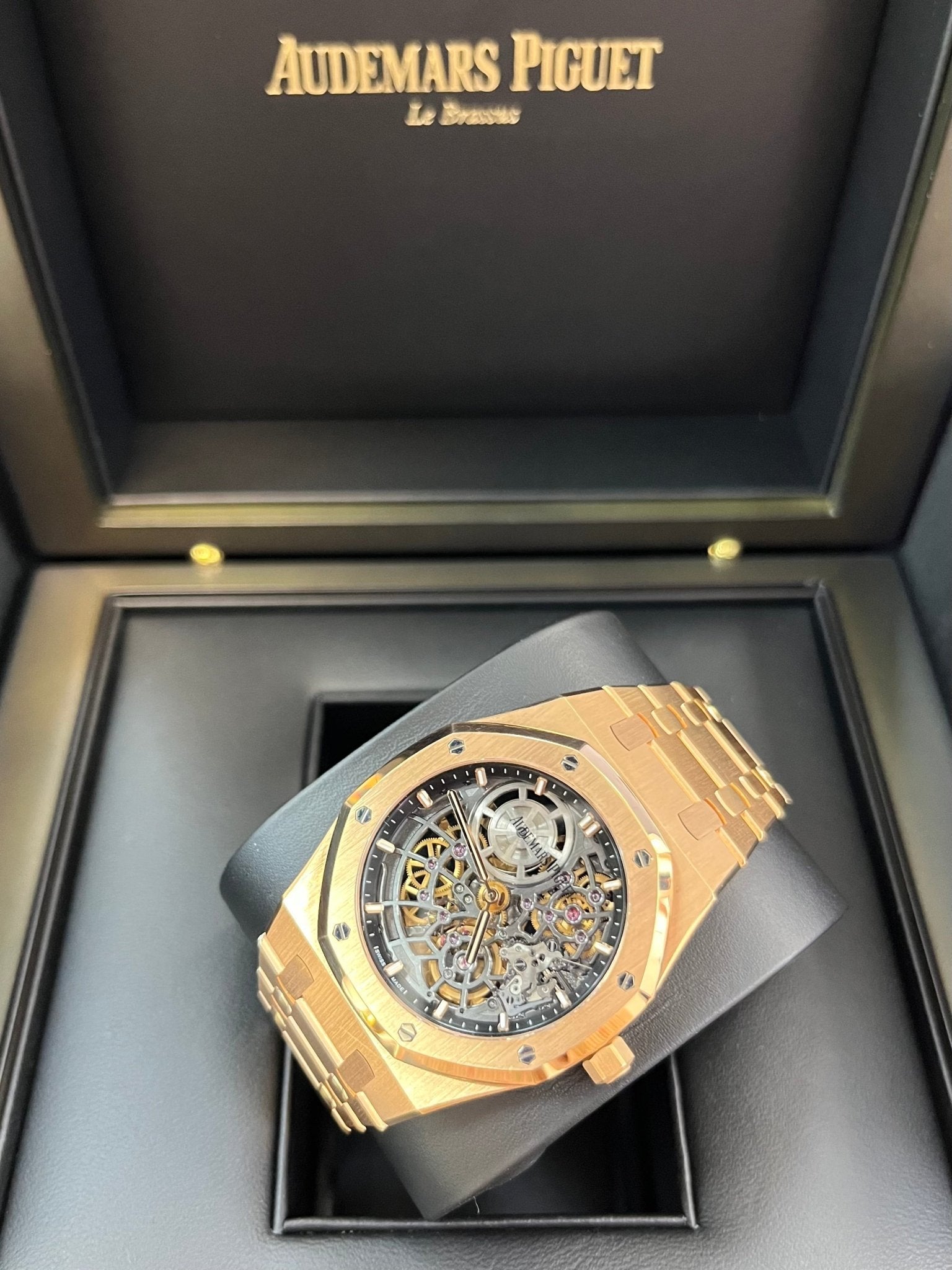 16204OR.OO.1240OR.01. 18kt rose gold 39mm case with 18k rose gold crown and pushers. 18k rose gold fixed bezel. Openworked slate grey dial, pink gold applied hour-markers and Royal Oak hands with luminescent coating. Hours and minutes. Automatic movement, AP Caliber 7124. 18k rose gold bracelet with push button foldover clasp. Power reserve up to 57 hours. Water resistant to 50m or 160ft.