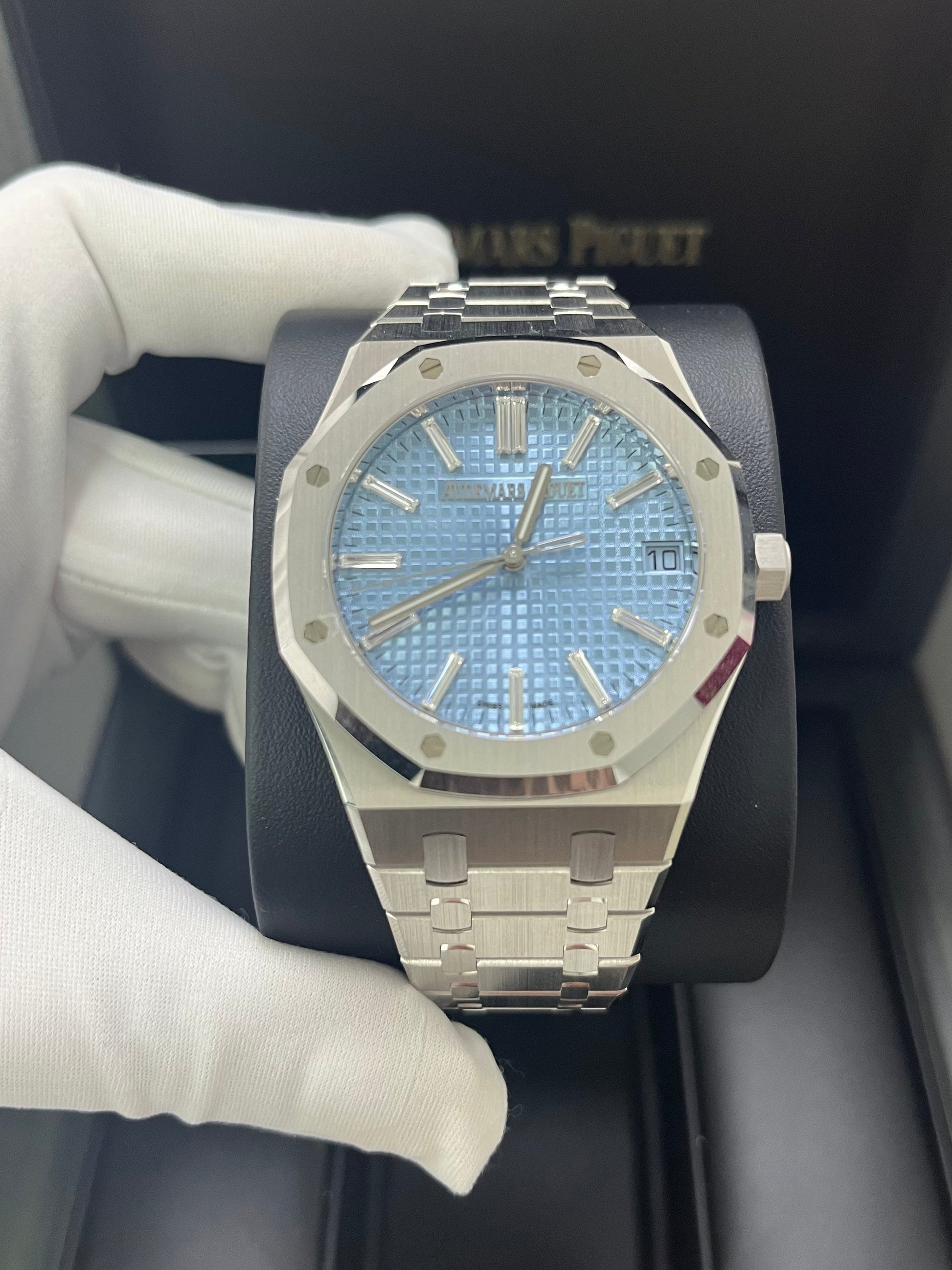 This 41 mm Royal Oak Selfwinding limited edition of 100 pieces combines an 18-carat white gold case and bracelet with a light blue Grande Tapisserie dial and encompasses the collection's latest design evolution. 18-carat white gold case, glareproofed sapphire crystal and caseback, screw-locked crown. Light blue dial with “Grande Tapisserie” pattern, baguette-cut diamond hour-markers and white gold Royal Oak hands with luminescent coating. 18-carat white gold bracelet with AP folding clasp.