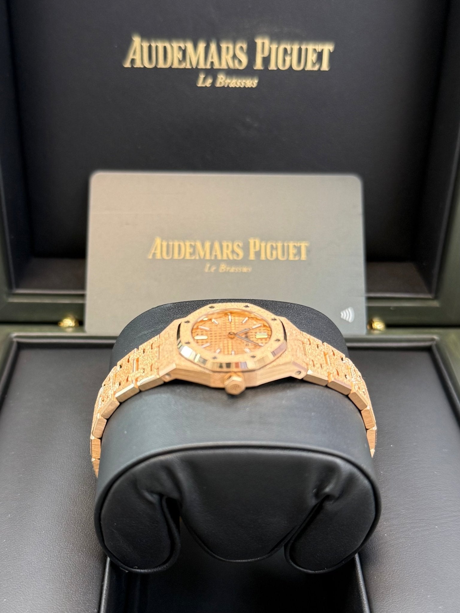 Pink gold-toned dial with “Petite Tapisserie” pattern, pink gold applied hour-markers and Royal Oak hands with luminescent coating.