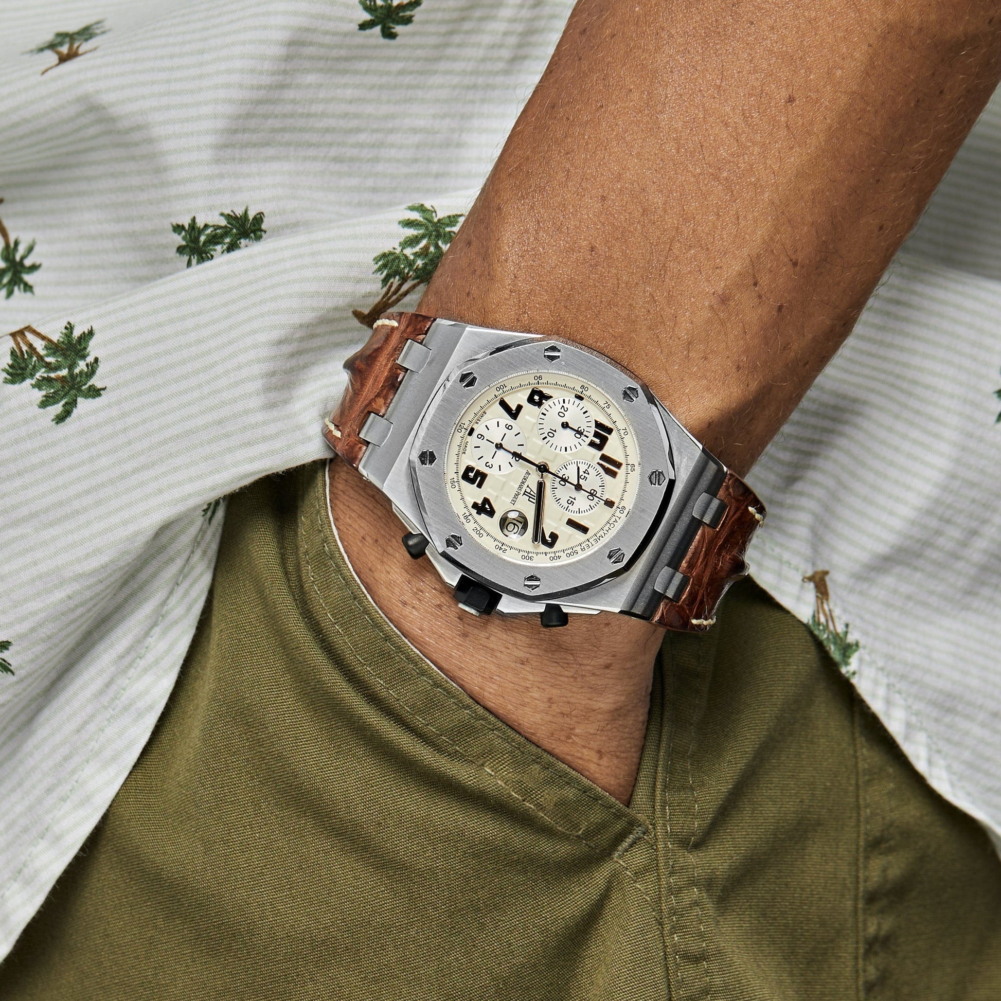 This Royal Oak Offshore Chronograph "Safari" is crafted in a stainless steel case measuring 42mm. The beige dial features three white sub-dials, the 'Mega Tapisserie' pattern and a date display. The watch comes on a brown leather strap. In pre-owned but very good condition, this timepiece has never been polished, retaining its original finish. The case has a few marks on the bezel, and the bracelet shows slight signs of wear. This "Safari" model offers a perfect blend of rugged elegance and reliable performance, ideal for both collectors and enthusiasts.