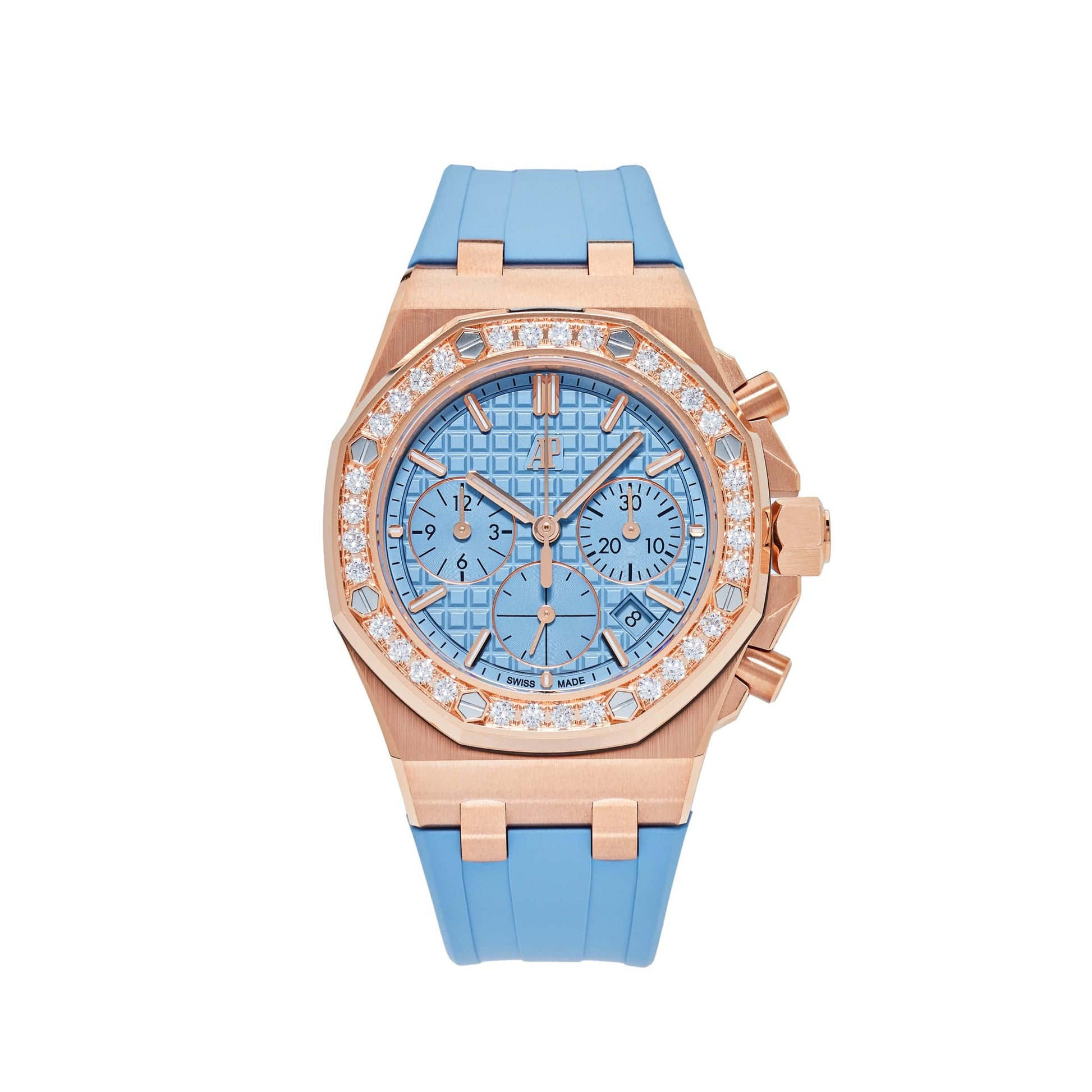 This Royal Oak Offshore Selfwinding Chronograph is crafted in a rose gold case measuring 37mm. The brilliant-cut diamond bezel surrounds a light blue dial featuring the 'Lady Tapisserie' pattern, blue counters, pink gold applied hour-markers and Royal Oak hands with luminescent coating. The watch comes with a blue rubber strap and white rubber strap with 18k pink gold pin buckle.