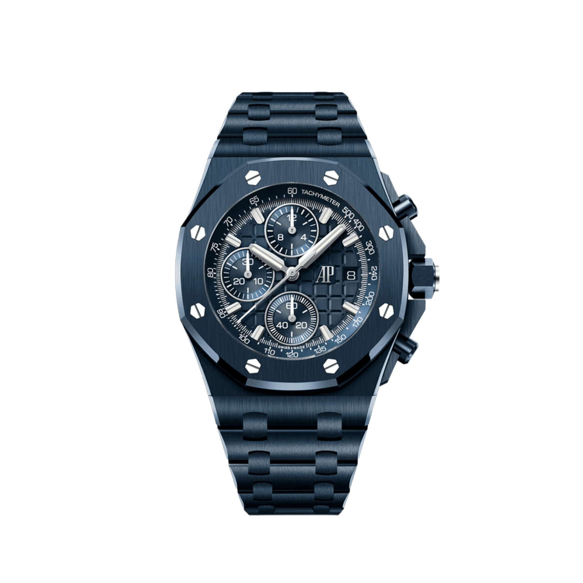 The Audemars Piguet Royal Oak Offshore Chronograph 26238CD.OO.1300CD.01 is a cutting-edge 2025 release that redefines the Offshore aesthetic with the debut of full Bleu Nuit, Nuage 50 ceramic construction. Measuring 42mm, the case, bezel, pushers, crown, and integrated bracelet are all crafted in this deep, iridescent blue ceramic—a color synonymous with AP’s heritage, now expressed through an advanced, ultra-durable material. The watch is fitted with a titanium caseback for added strength and contrast, and secured with a titanium folding clasp, blending lightweight functionality with contemporary style.