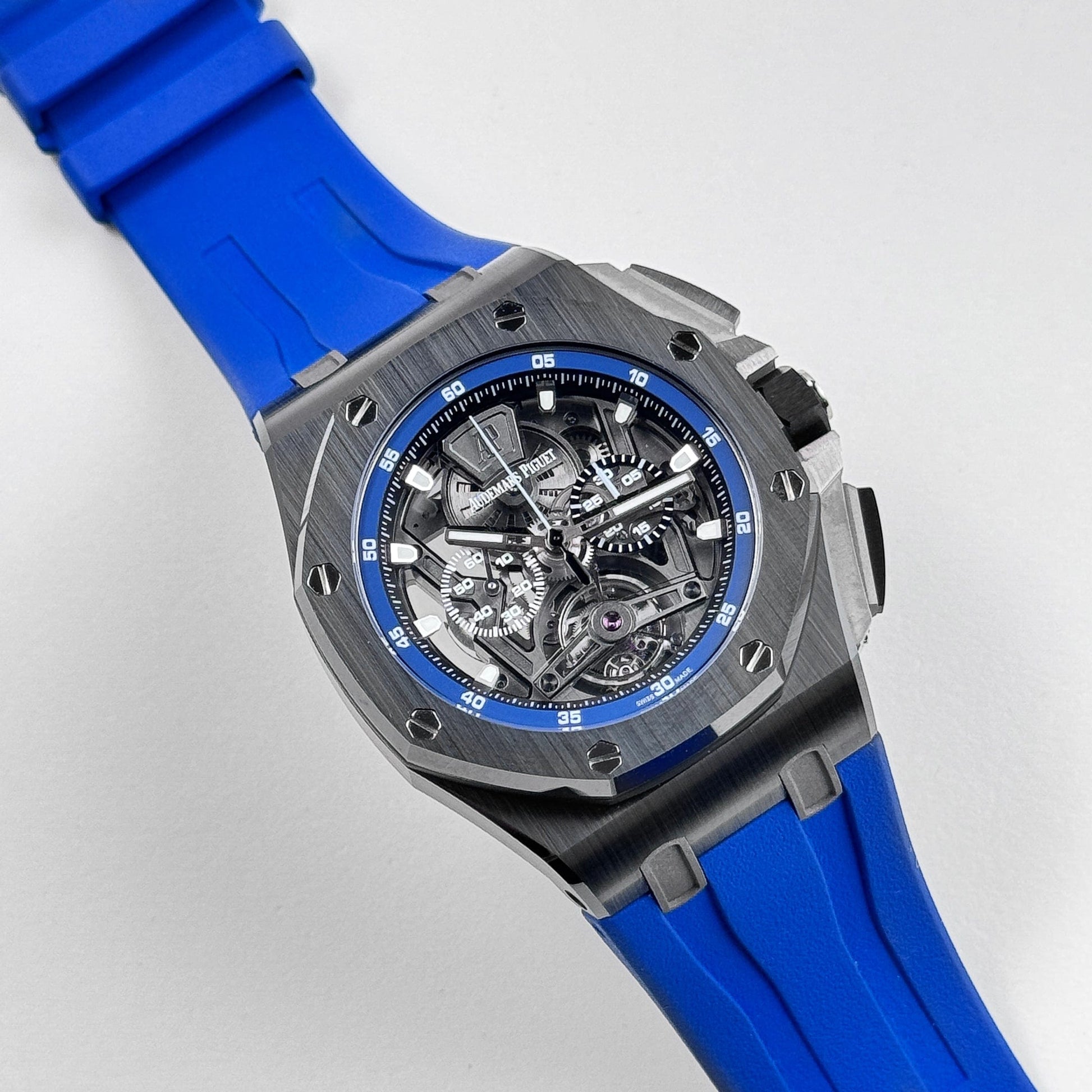 The blue accents on the chronograph subdials and outer minute track add a vibrant contrast to the monochrome case, enhancing legibility while maintaining a sporty aesthetic. The watch is powered by the Caliber 3126/3840, which delivers reliable performance and a robust power reserve. Paired with a blue rubber strap, the 26407CE.OO.A030CA.01 combines avant-garde design, cutting-edge materials, and mechanical excellence—making it a standout piece within the Royal Oak Offshore collection.