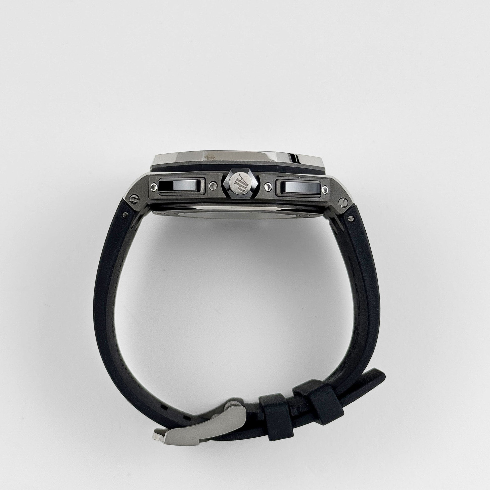 The Audemars Piguet Royal Oak Offshore 26407TI.GG.A002CA.01 reimagines bold luxury through ultra-lightweight materials and high-complication engineering. Its 44 mm case is crafted from sandblasted titanium—including the bezel, crown guards, and screw-locked pushers—giving it a rugged yet refined presence. The openworked dial showcases a suspended tourbillon at 6 o’clock and tri-subdial chronograph layout beneath smoked sapphire counters, creating depth and clarity in a sophisticated, tool-oriented design.
