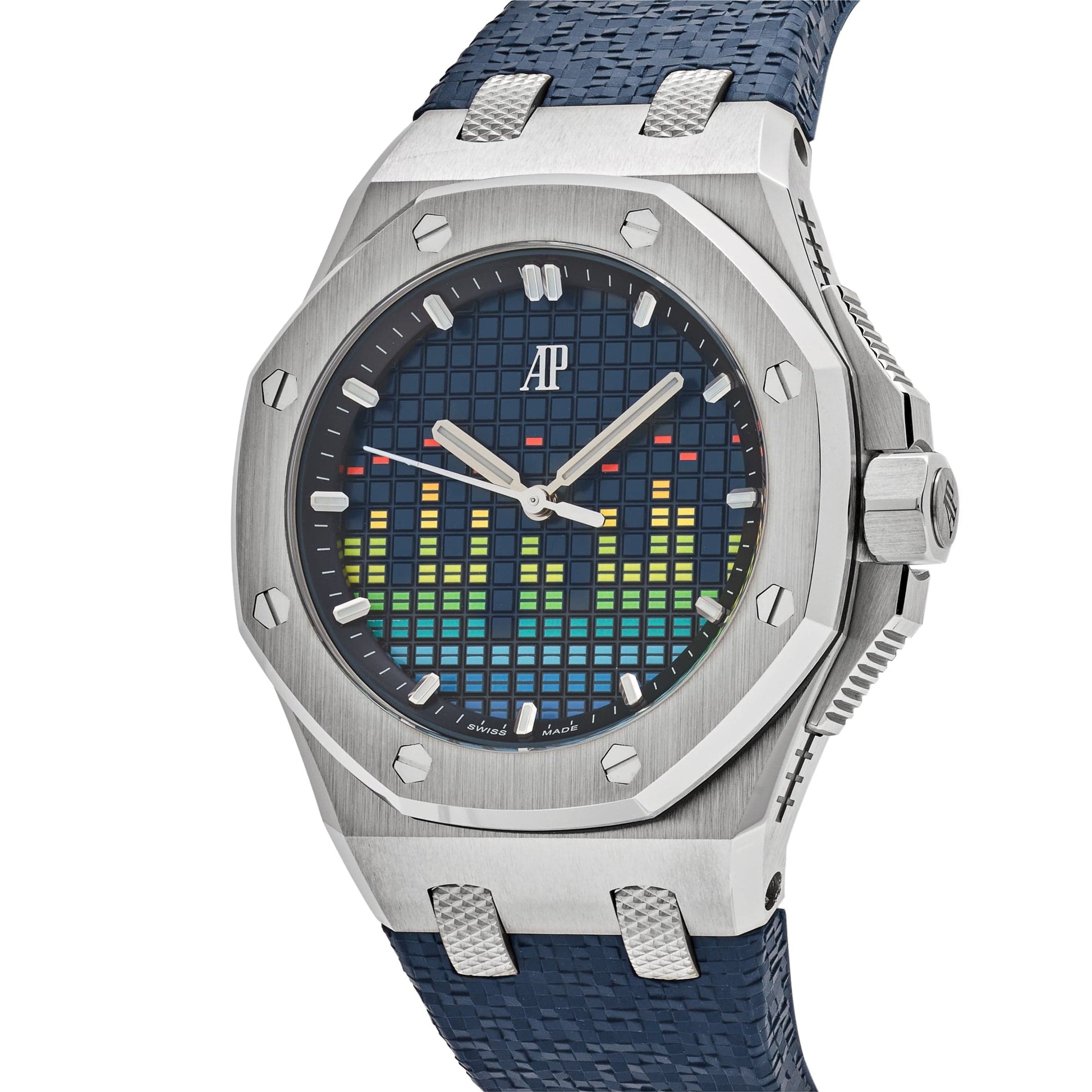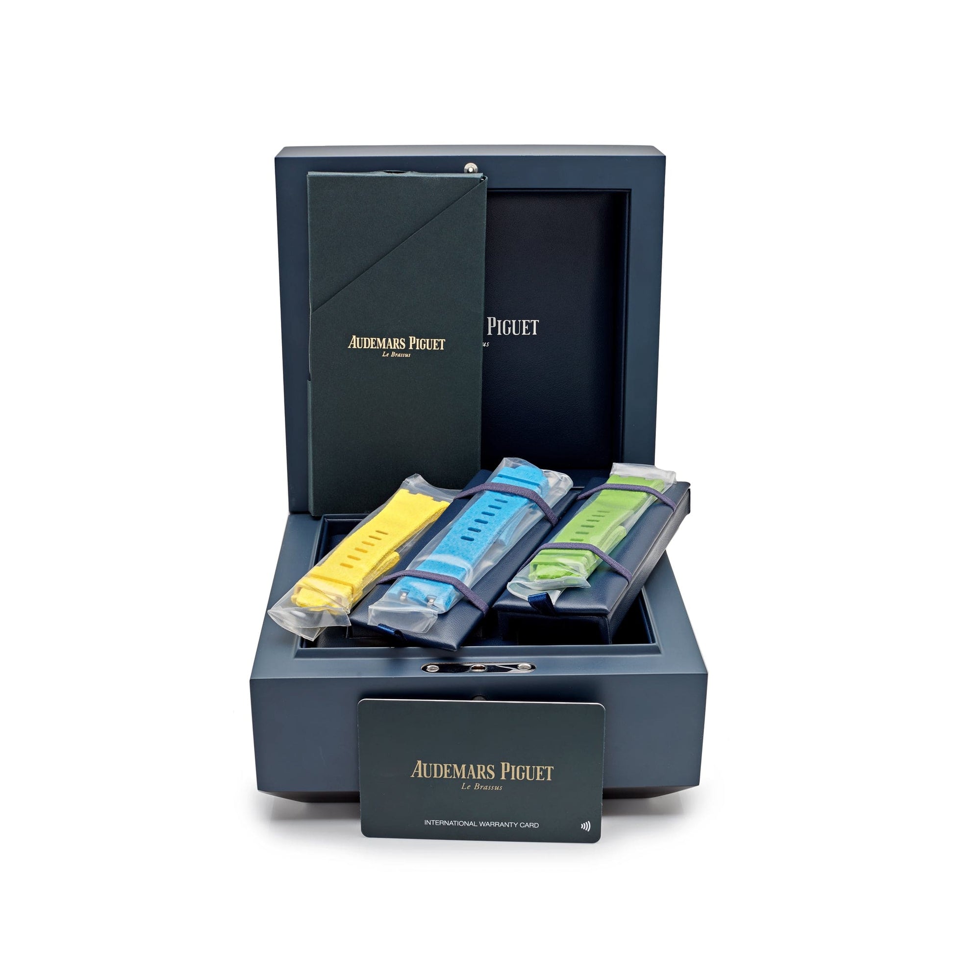 This Royal Oak Offshore Music Edition is crafted in a titanium case measuring 37mm in diameter. The aesthetic of this watch is inspired by music with its dial representing a VU meter and its push-piece guards evoking mixer faders. A blue textured interchangeable rubber strap – a first for the smaller wrists – complements the overall design. This timepiece is pre-owned, but it is in excellent condition and comes with its original box and papers. Despite being pre-owned, this watch is in excellent condition and comes complete with its original box and paper